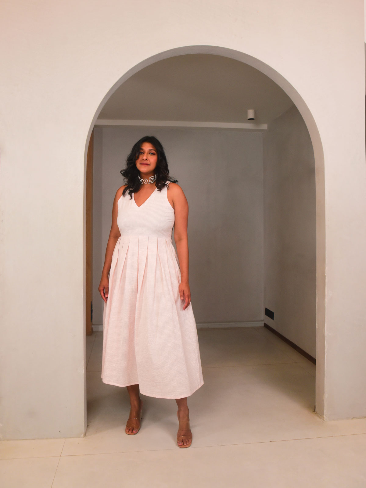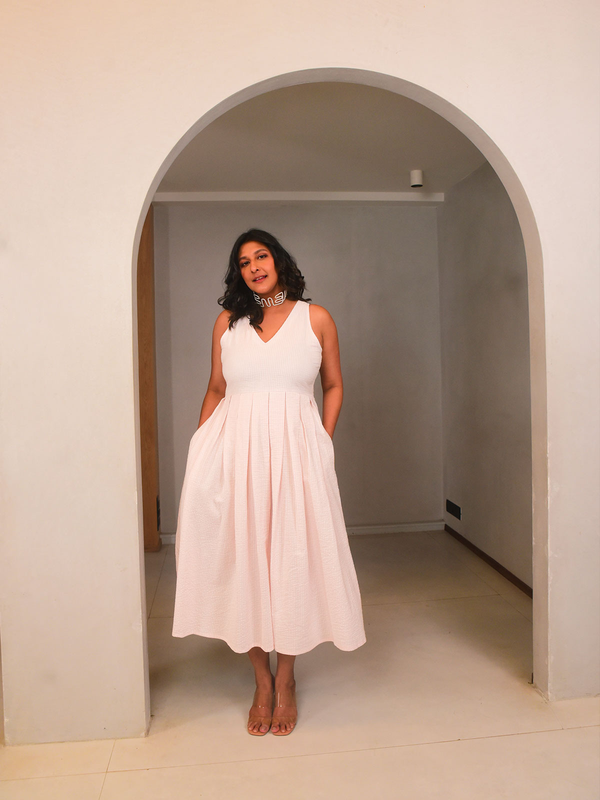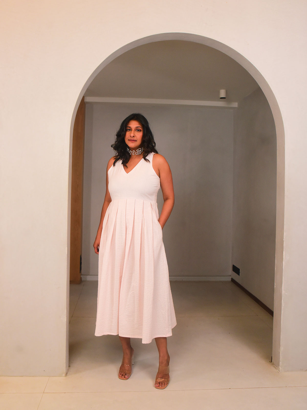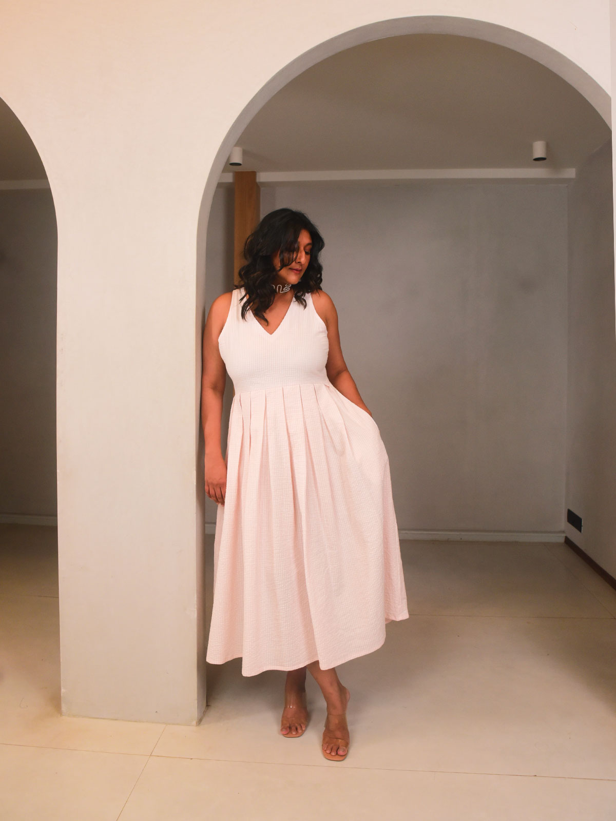 This breezy midi dress is cut in airy pink and white checkered seersucker cotton, with a flattering V neckline and box pleats falling softly from the yoke. Sleeveless with side pockets, it's equal parts functional and feminine. Style it with sneakers or sandals for picnics, errands, or off-duty afternoons.