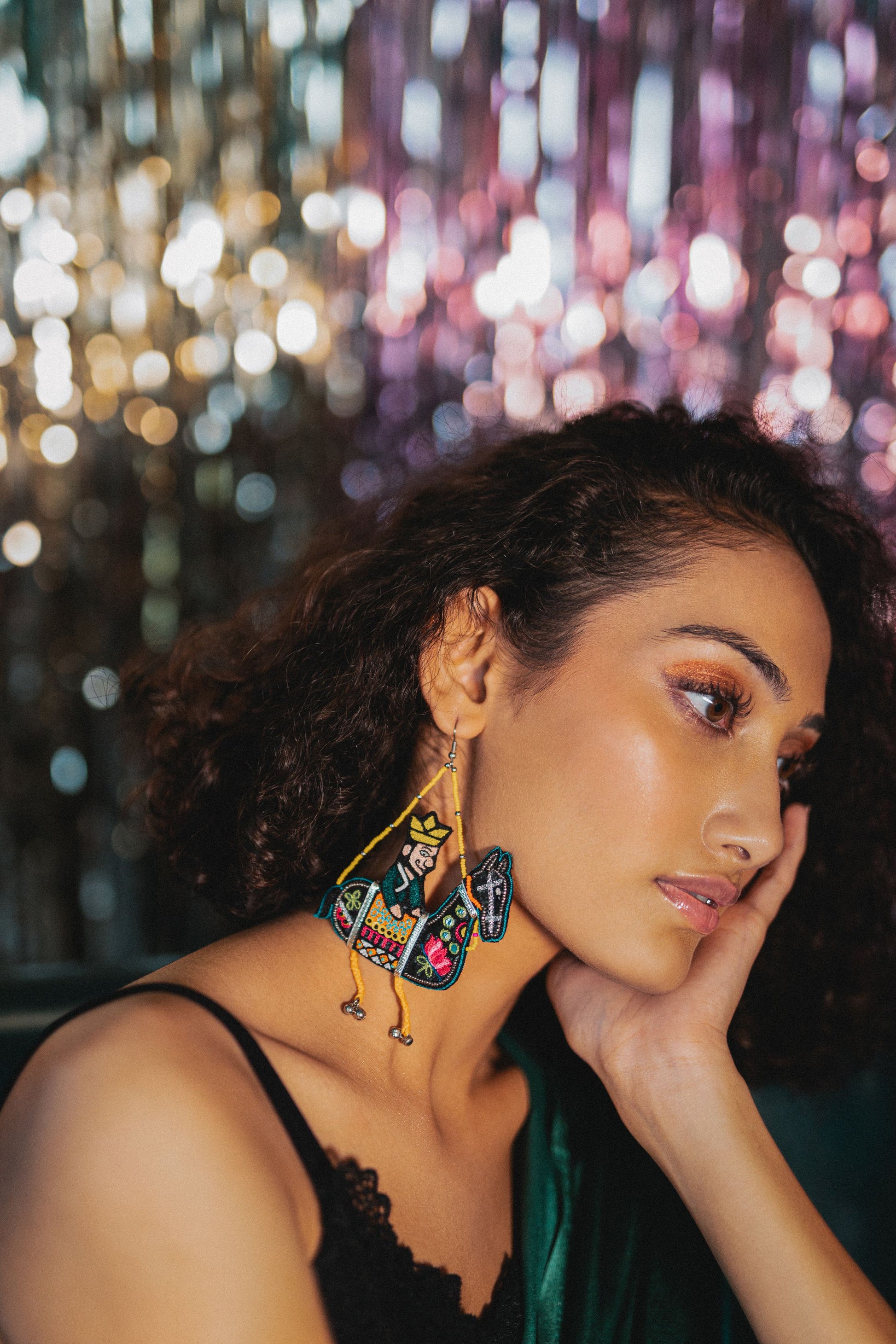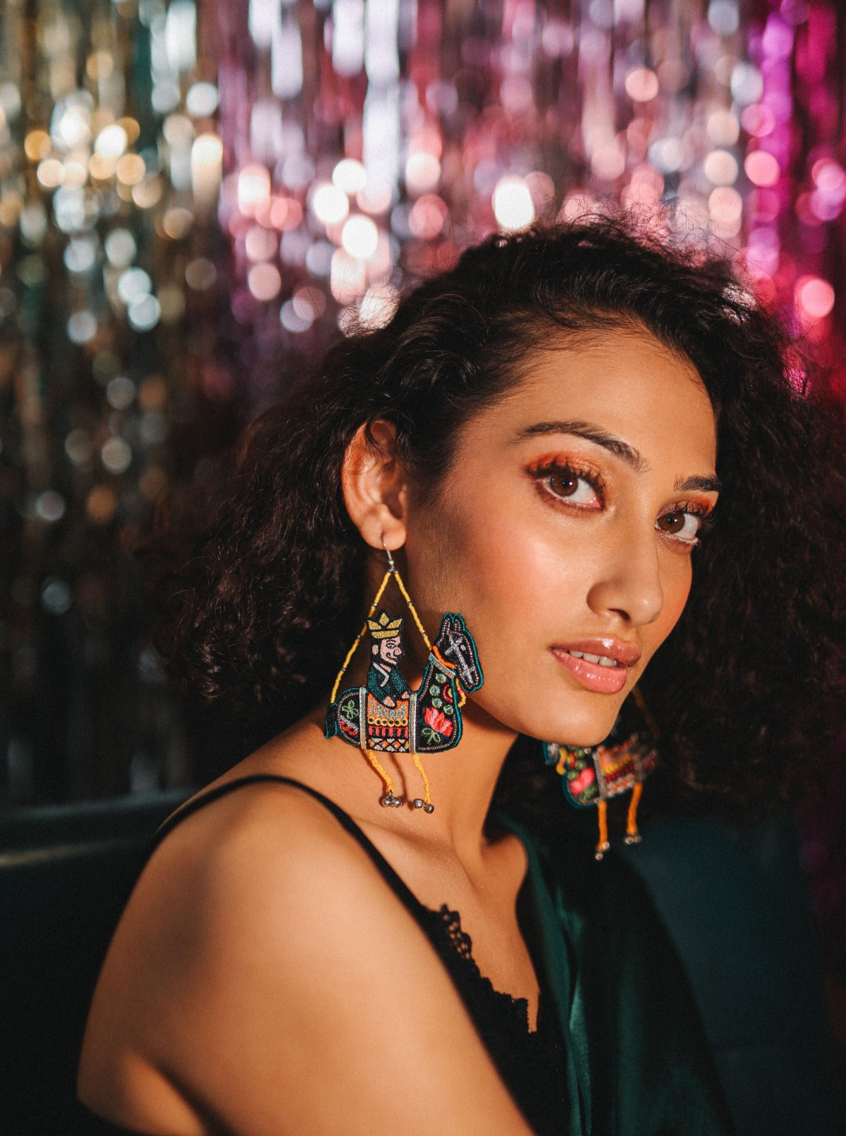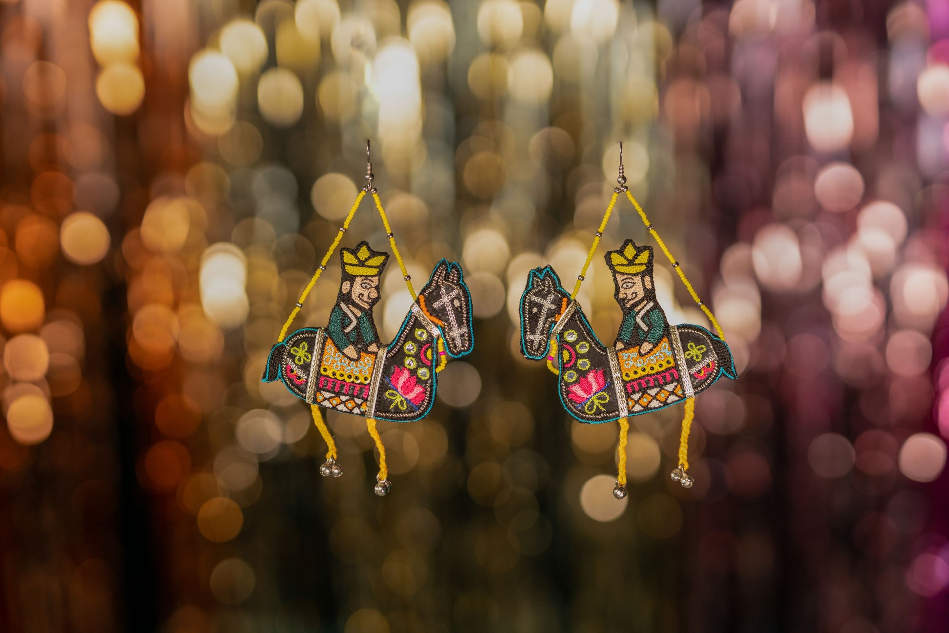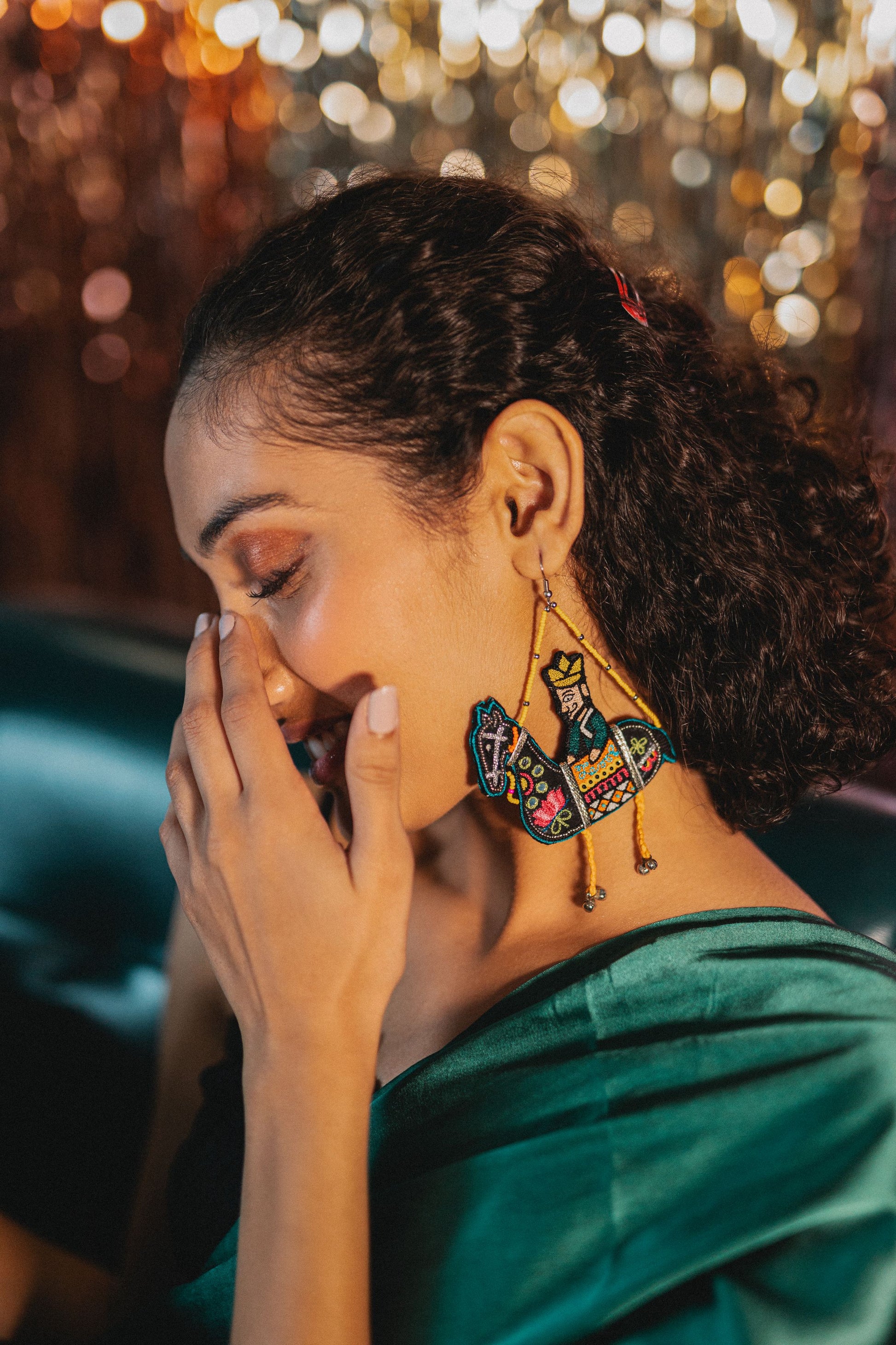 Handmade and hand embroidered earrings with our unique and intricately designed Puppet horse, detailed with beads. Provided with a hook on top. Light weight and easy to carry.