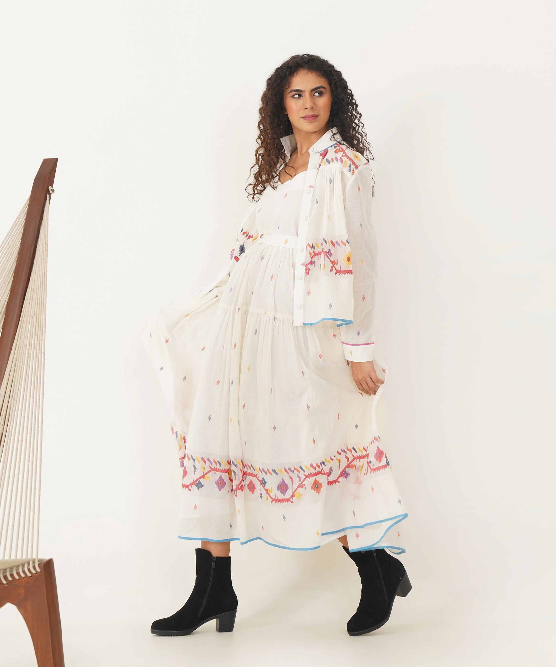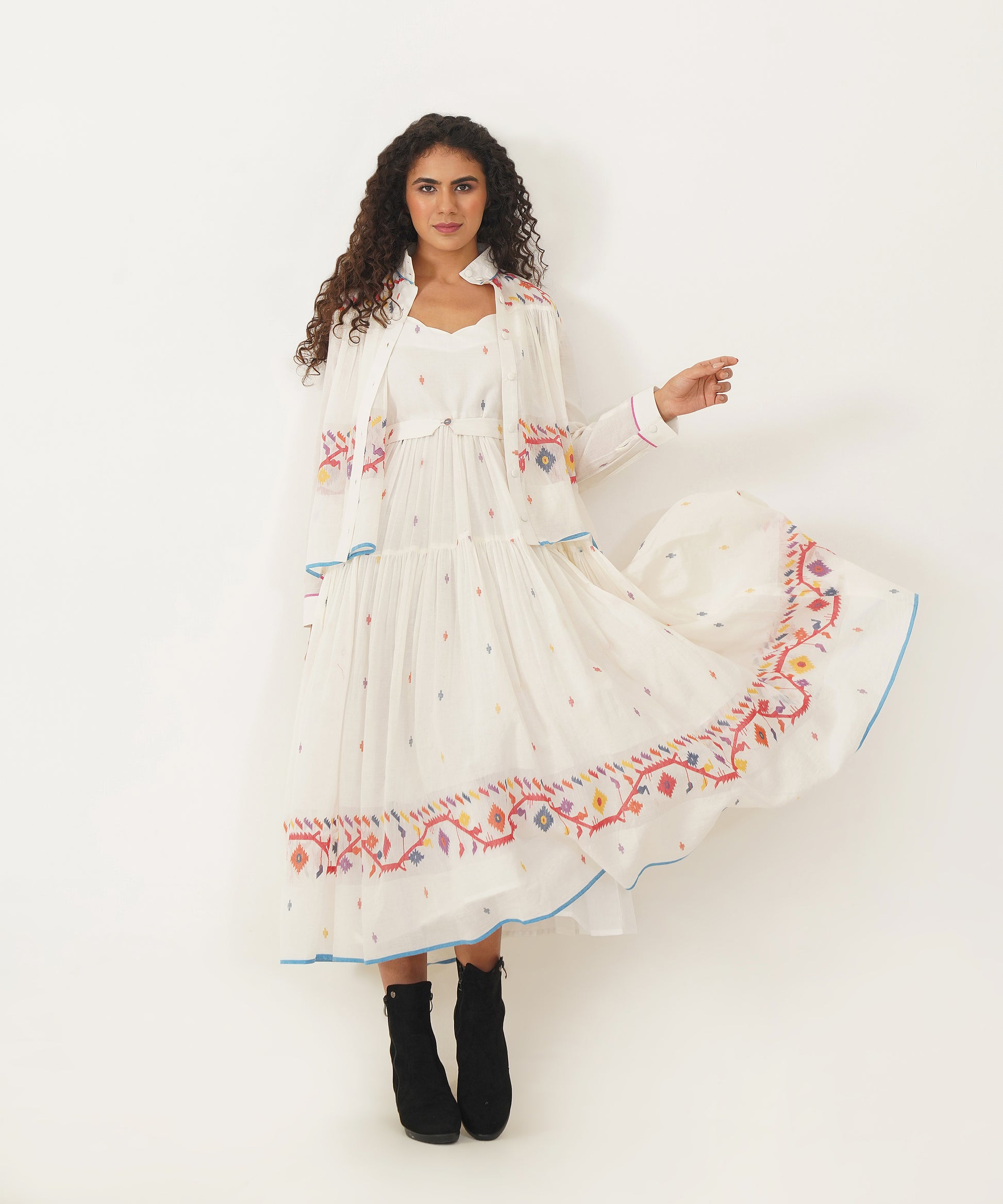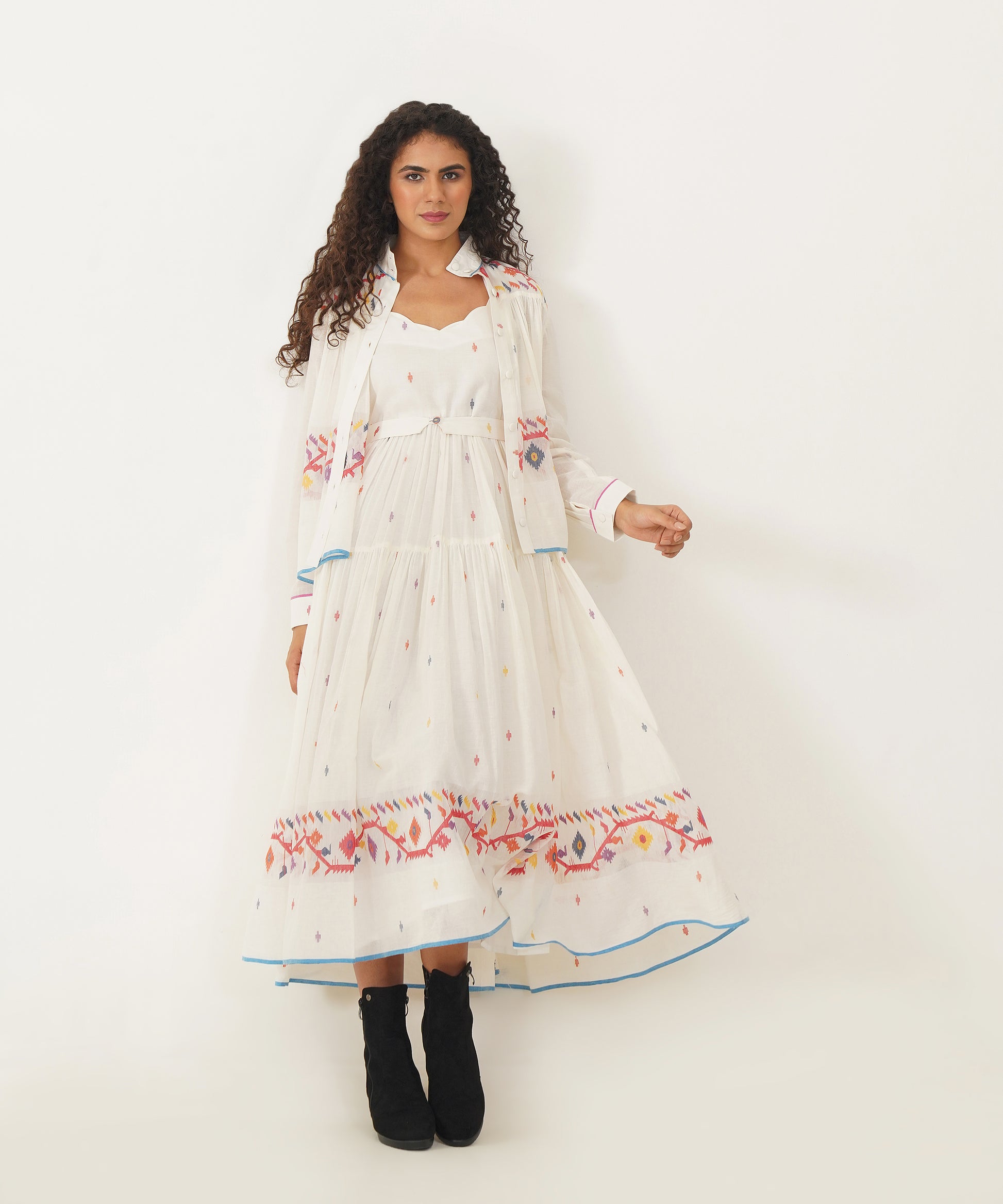 A stunning Jamdani ensemble that fuses traditional craftsmanship with modern elegance. The set features a scallop-neck dress with delicate noodle straps and soft gathers that flow gracefully. A back zipper fastening adds a sleek touch, while side pockets ensure practicality without compromising style. Accompanying the dress is a versatile high-collar Jamdani shirt that doubles as an overlay, offering endless styling possibilities. Meticulously handcrafted by Indian artisans, the ensemble is completed with a matching Jamdani belt, creating a look that is as timeless as it is refined.