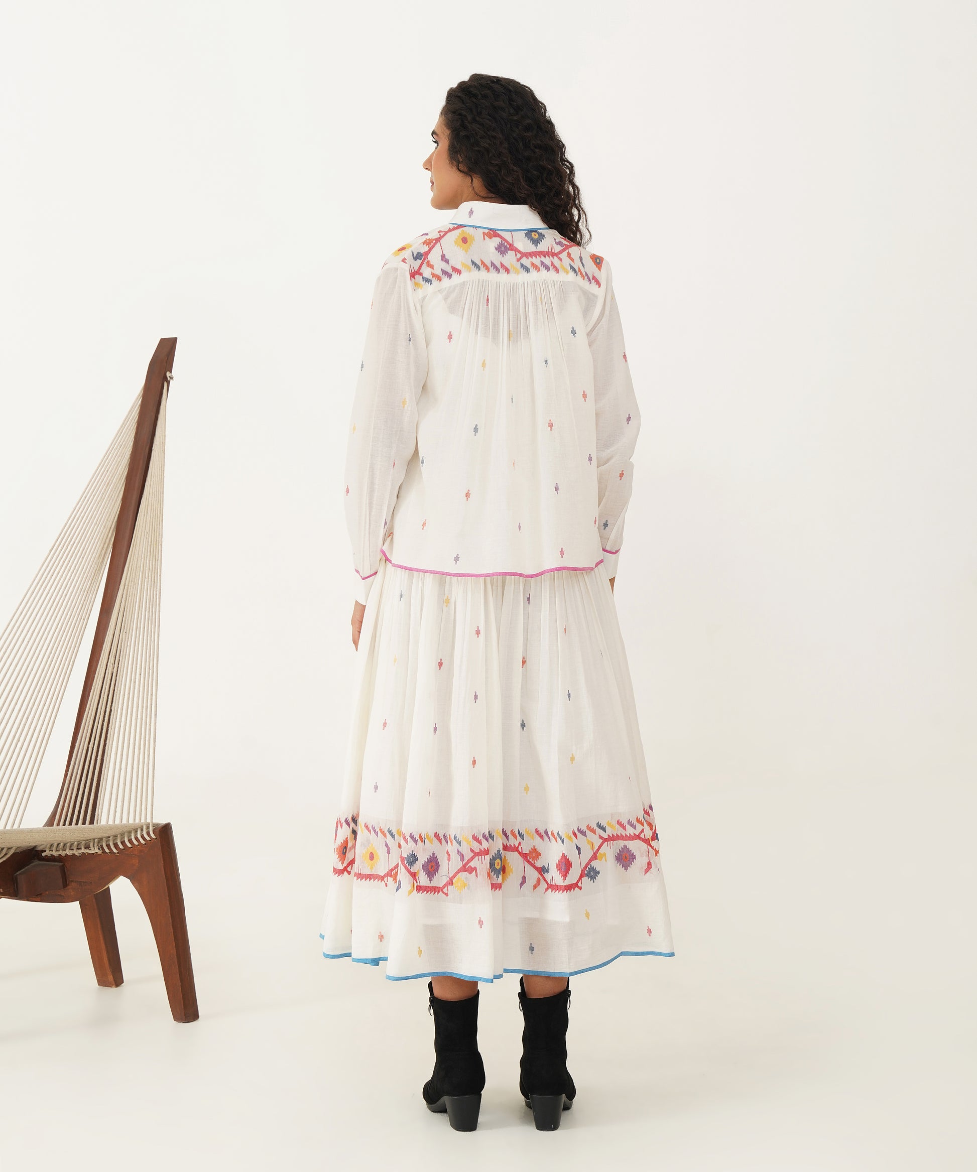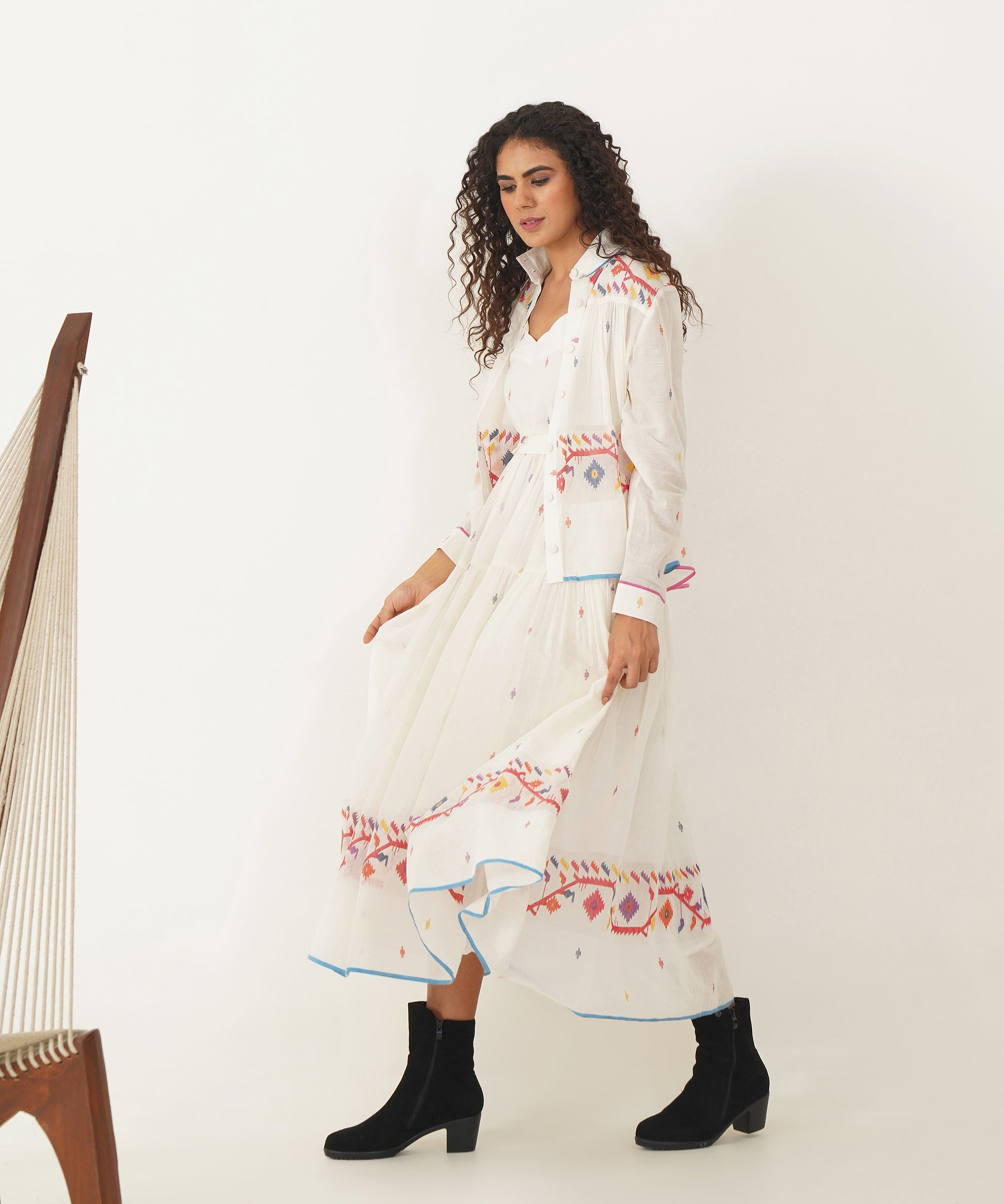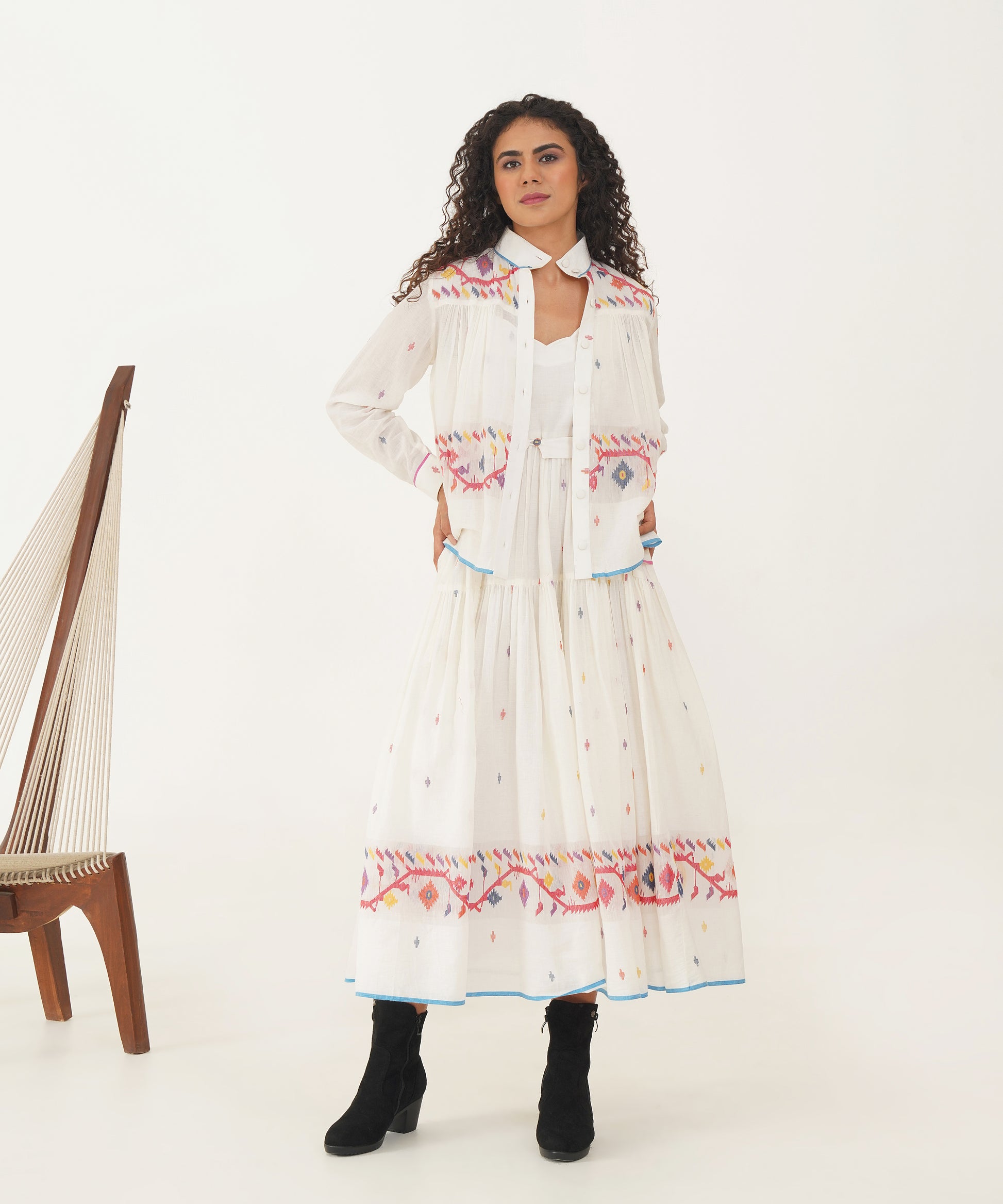 A stunning Jamdani ensemble that fuses traditional craftsmanship with modern elegance. The set features a scallop-neck dress with delicate noodle straps and soft gathers that flow gracefully. A back zipper fastening adds a sleek touch, while side pockets ensure practicality without compromising style. Accompanying the dress is a versatile high-collar Jamdani shirt that doubles as an overlay, offering endless styling possibilities. Meticulously handcrafted by Indian artisans, the ensemble is completed with a matching Jamdani belt, creating a look that is as timeless as it is refined.