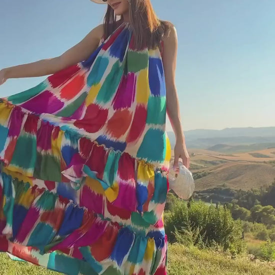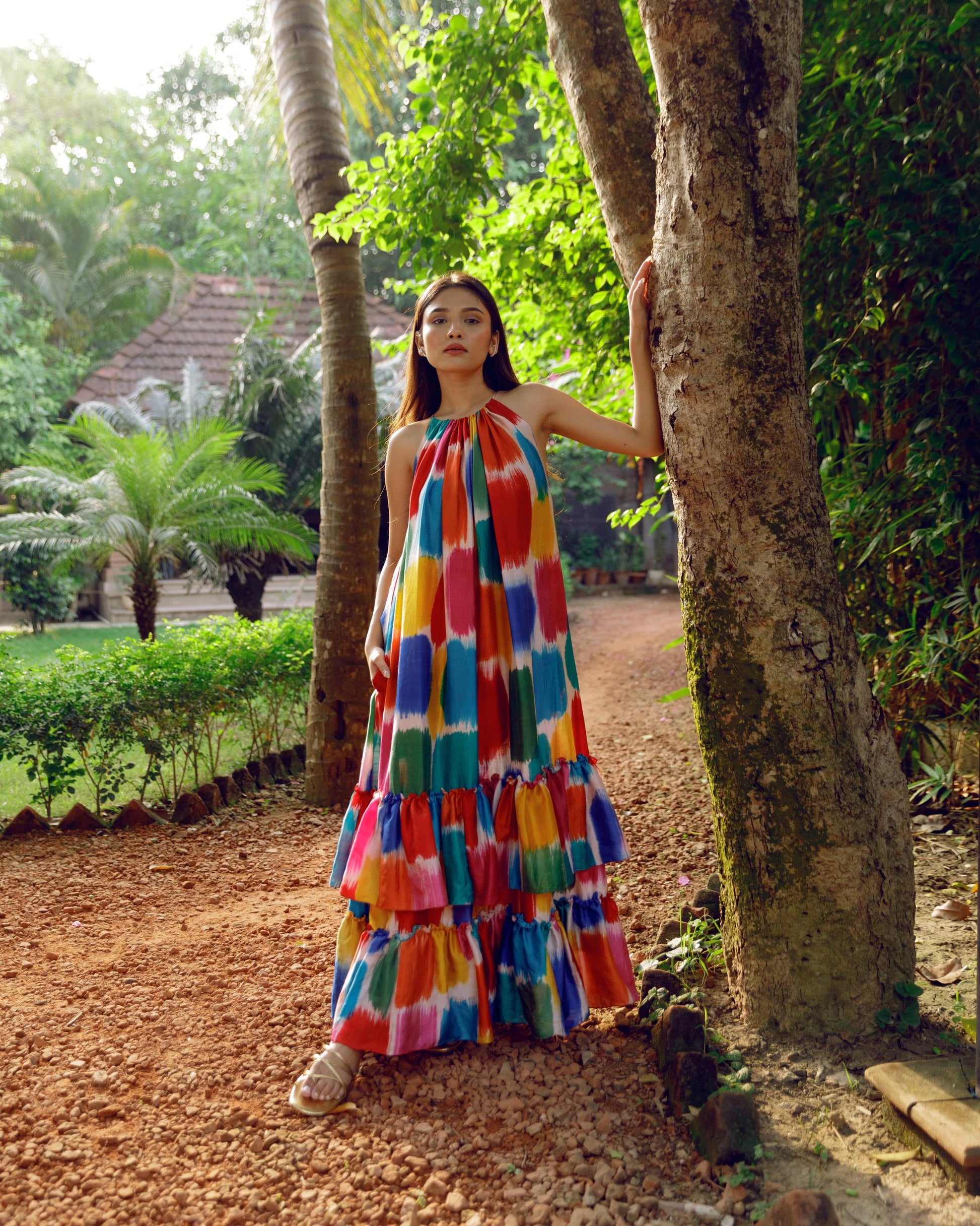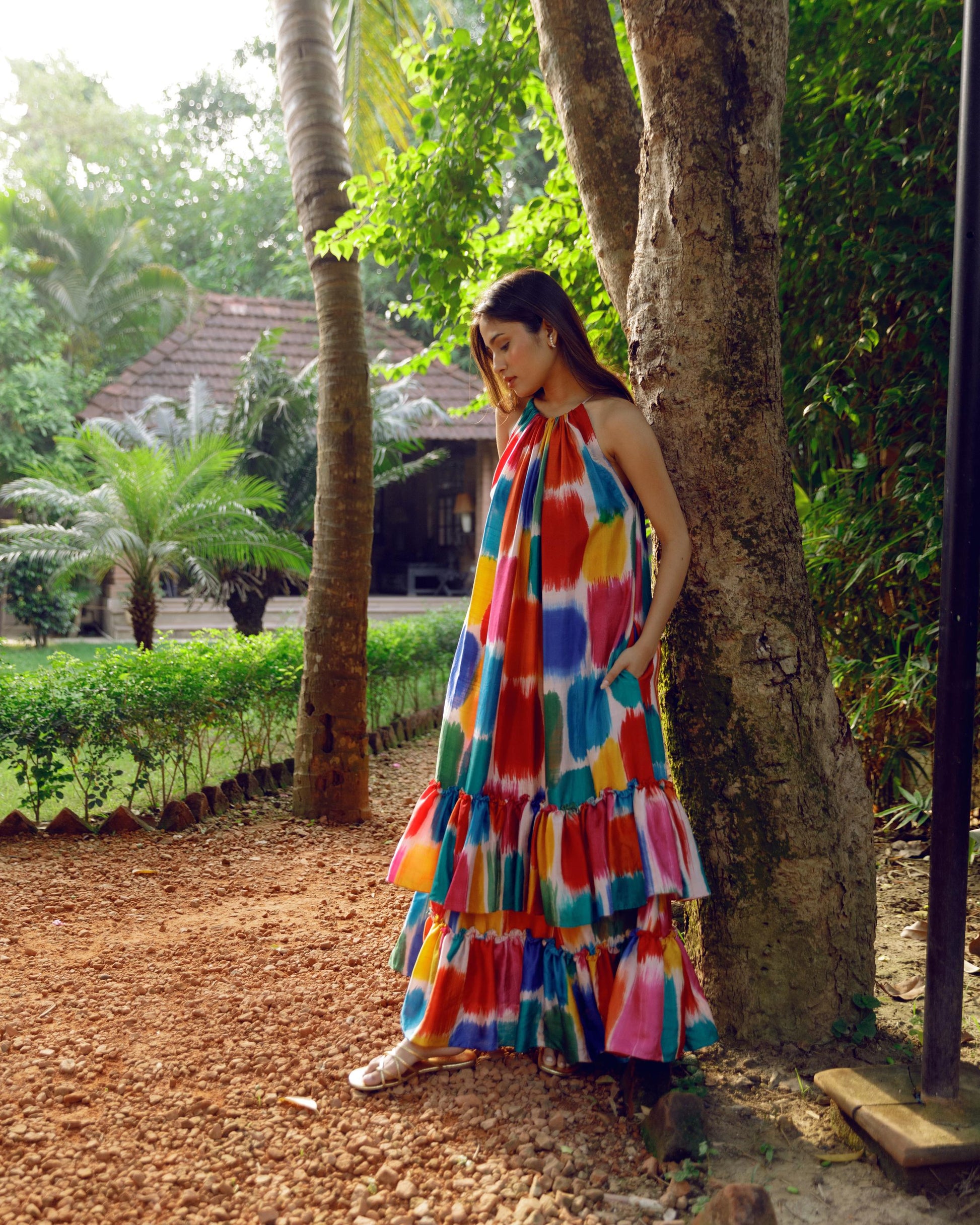 Multicolour brush stroke print, handwoven mulberry silk ruffled hem strappy midi dress with a back tie shell button detail. It also has pockets on each side.