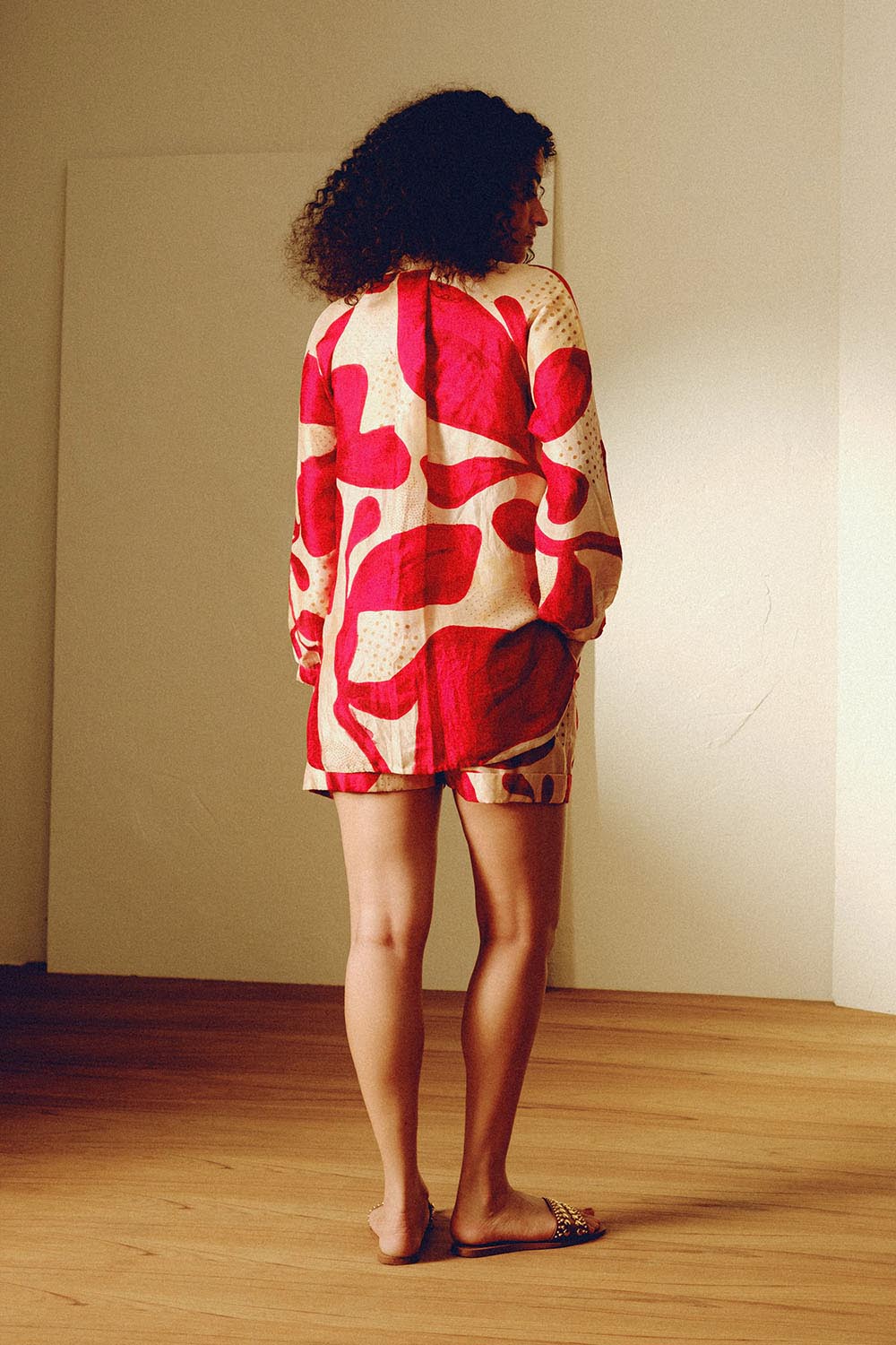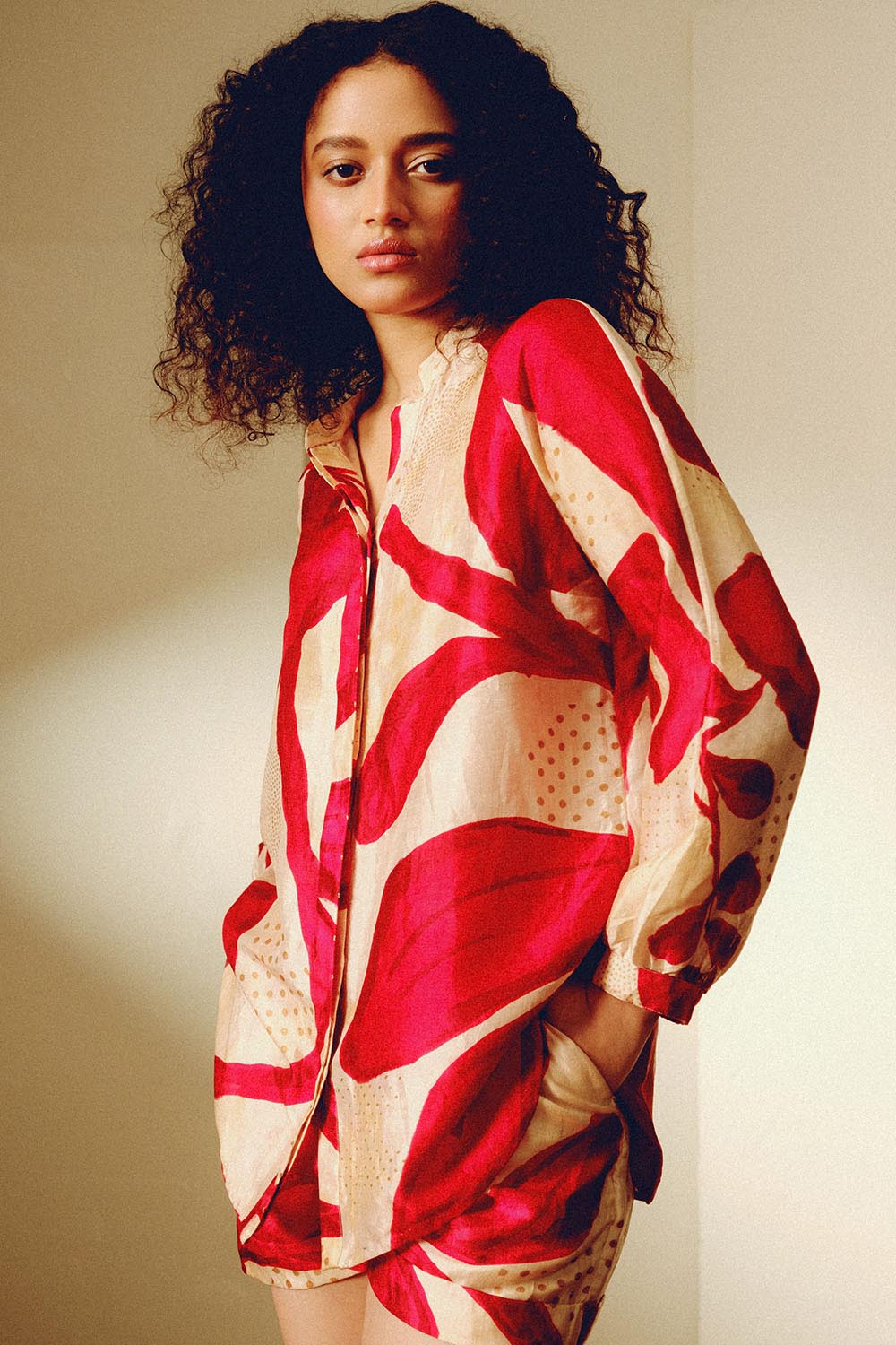 Handwoven and hand-painted mulberry silk shirt with chinese collar and raglan sleeves, Finished with bead edging.  Shirt Length- 28”