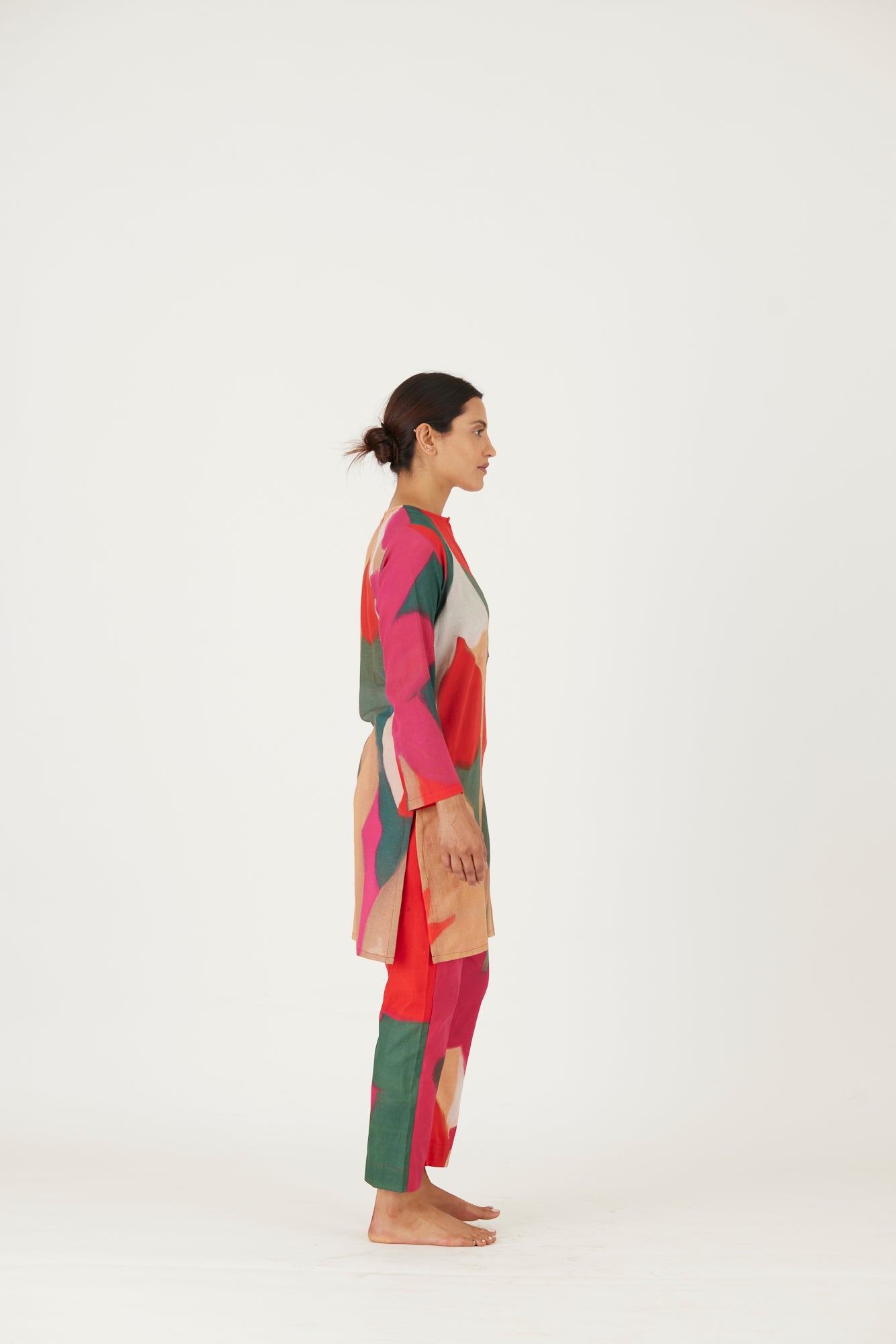 The kurta features a 2" kurta patti and threadwork on the neckline. The kurta is crafted in cotton twill and comes with complimenting pants.