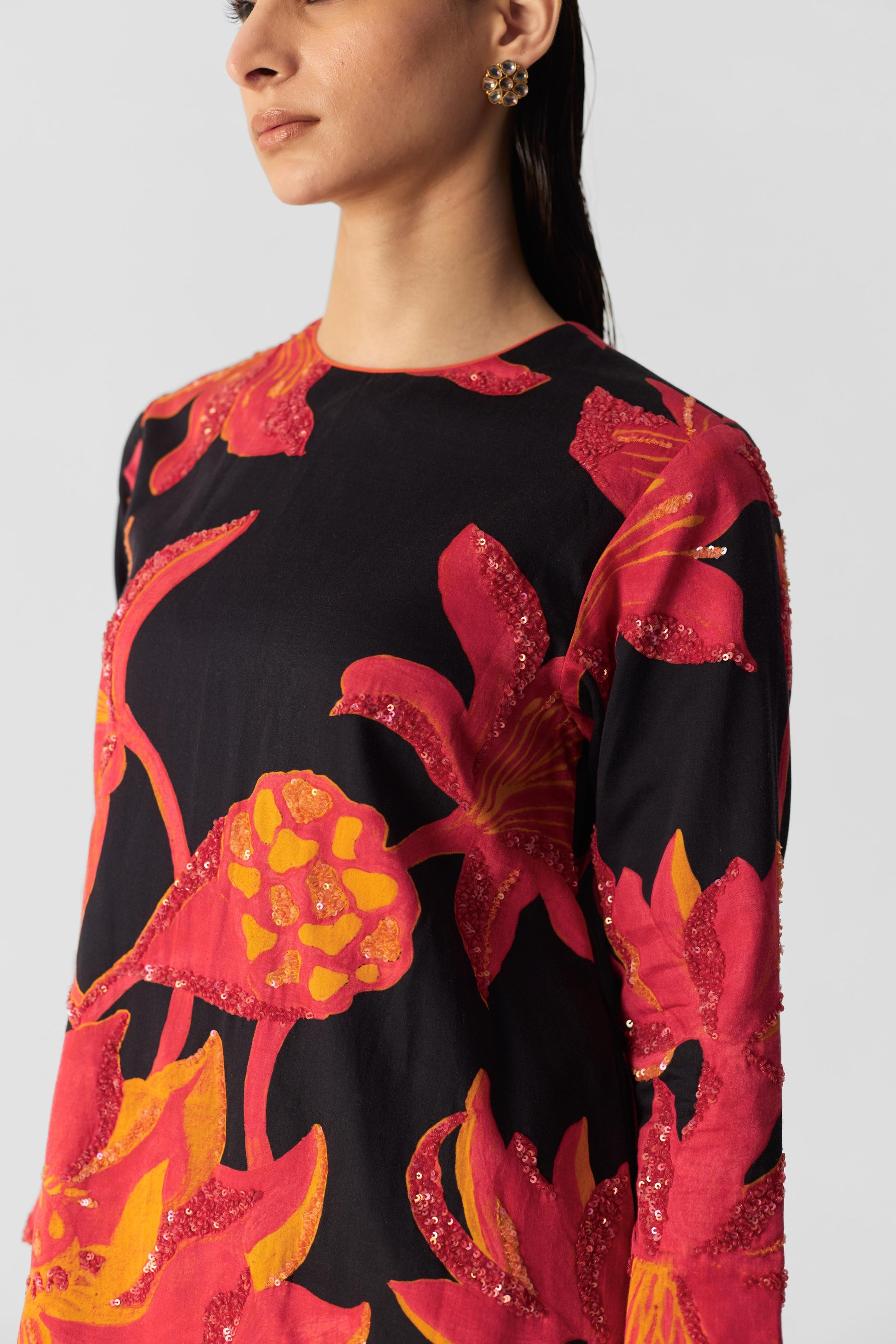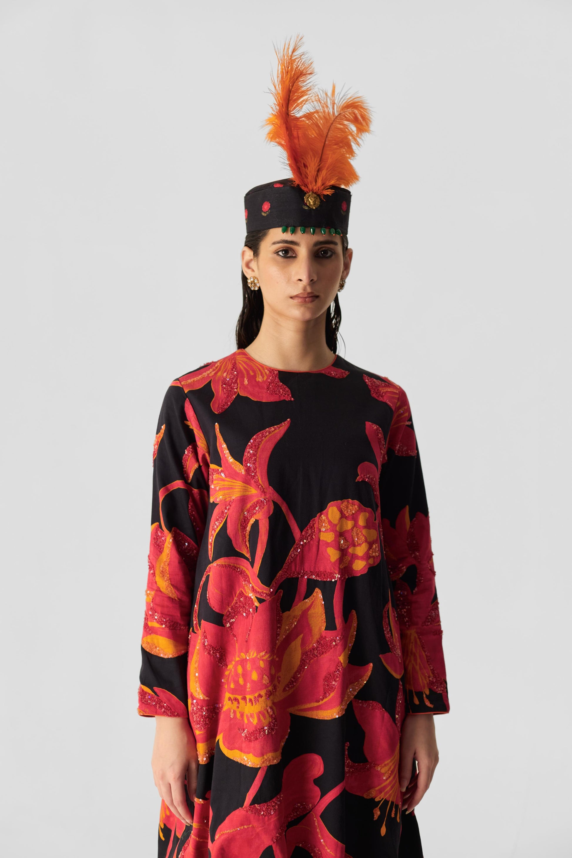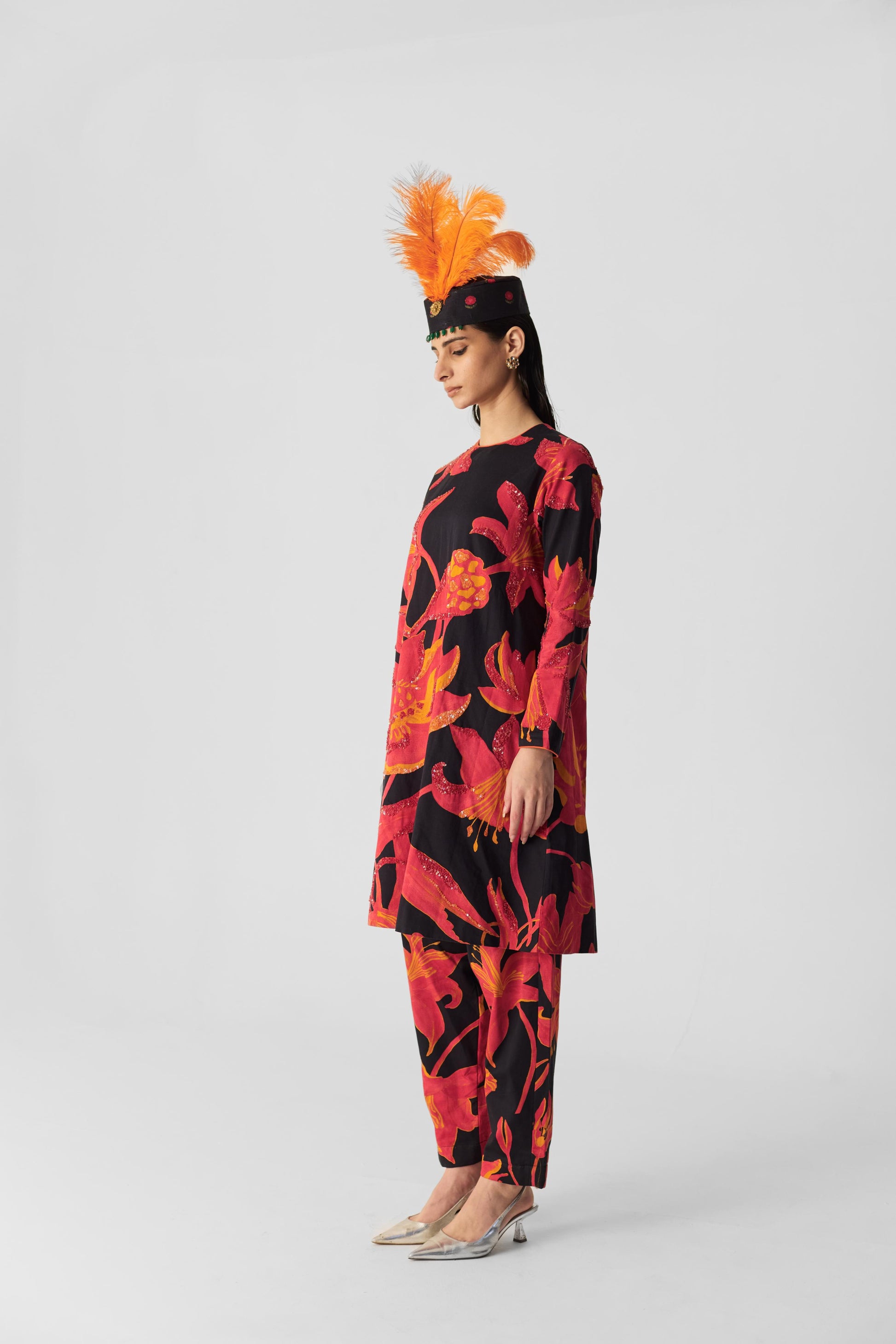 The exquisite Lian Kurta Set, featuring a stunning hand-painted floral print against a bold black backdrop. Crafted from luxurious cotton satin, this ensemble combines style and comfort seamlessly. The kurta showcases intricate sequin hand embroidery on the front and sleeves, adding a touch of elegance. With a round neck and a charming keyhole back finished with fine dori piping, this piece offers a perfect blend of sophistication and comfort. Paired with matching pants, designed with convenient side pockets and a secure zipper and hook closure, this set ensures a flattering fit. Inside, a soft mulmul lining enhances your comfort, making it an ideal choice for any occasion.