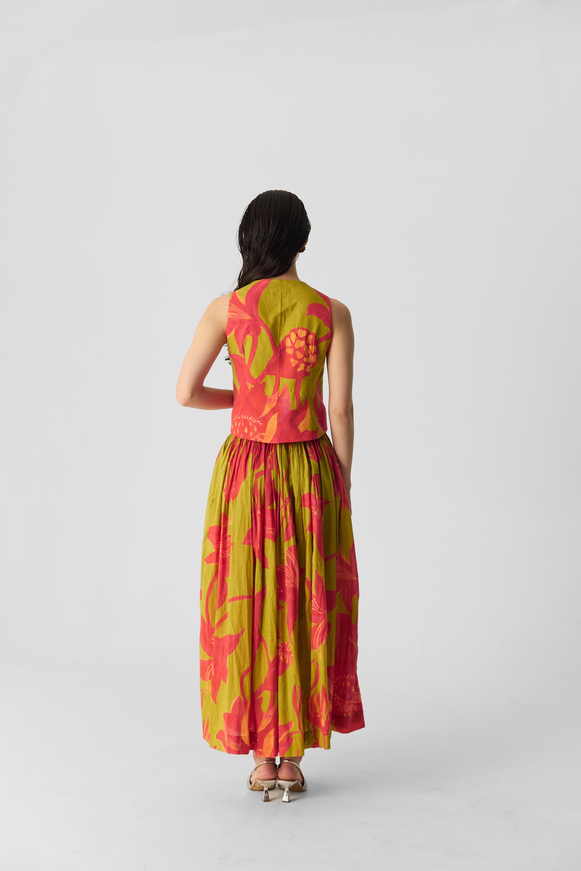 The Lian Lime Kurta Set, featuring a stunning hand-painted floral design that captures the beauty of vintage artistry. The exquisite print showcases elegant lotuses and lilies against a vibrant lime backdrop, making each piece a unique masterpiece. The waistcoat features a front button-down design with princess panels, ensuring a perfect fit. The skirt, designed with gathers and side pockets add functionality, allows for an elegant drape and better fall.
