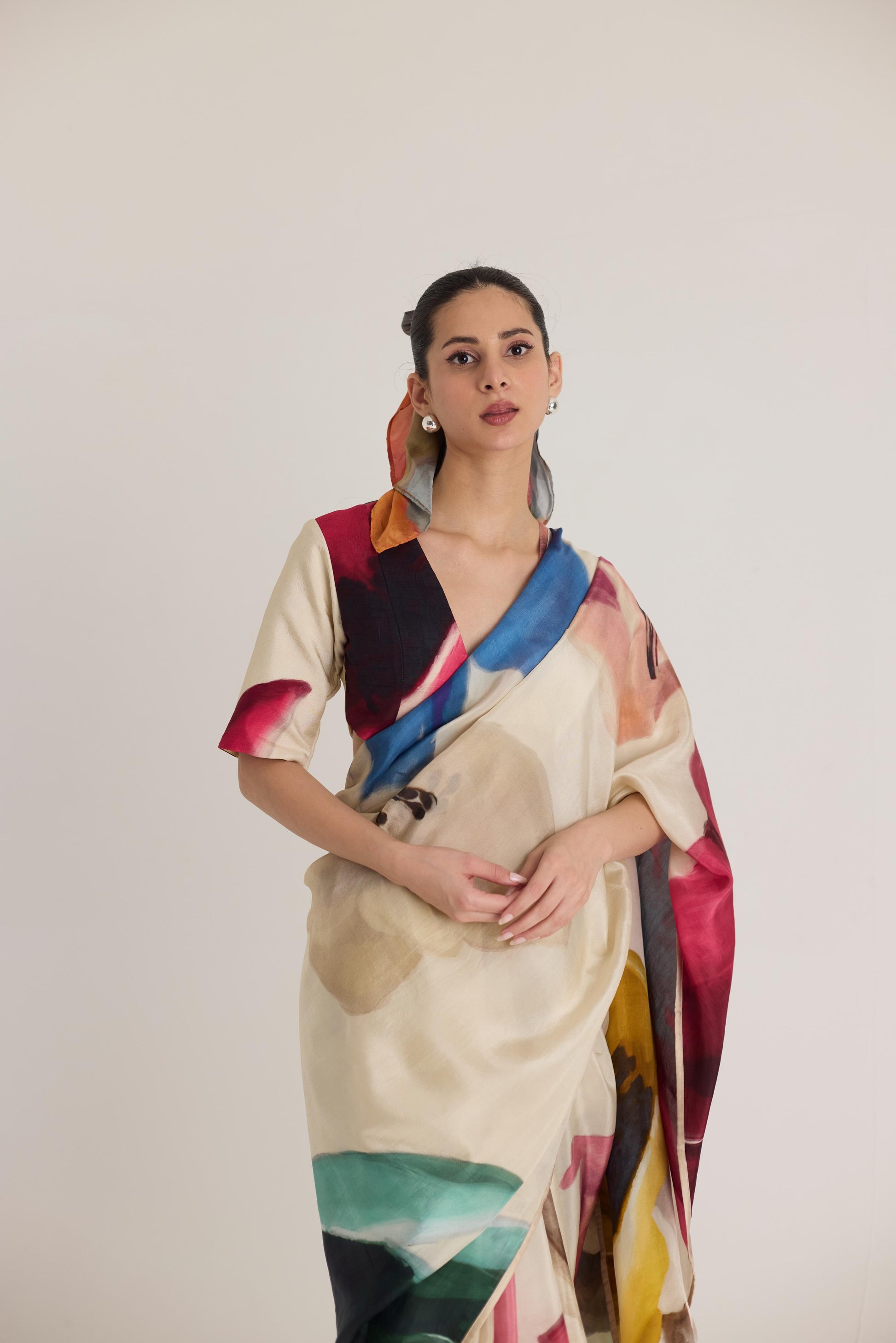 Adorned with an abstract floral print, this blouse showcases bold strokes of deep crimson, earthy beige, mustard yellow, and teal against a soft ivory base. The seamless fusion of watercolor-like hues creates an artistic, painterly effect, evoking the essence of nature in motion.