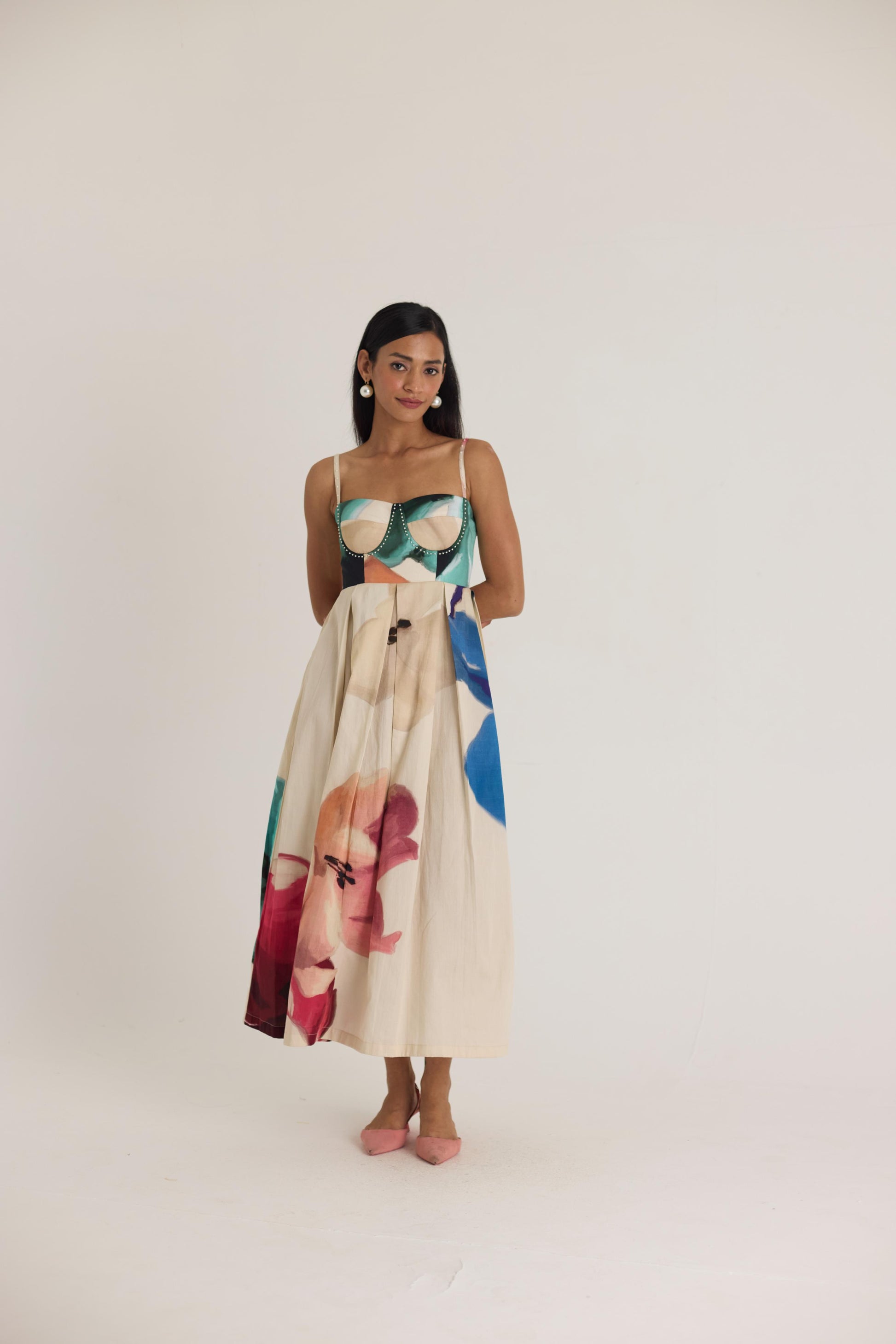 A statement-making midi dress featuring a structured bustier top with pearl embellishments and a pleated skirt adorned with bold abstract prints. The fitted bodice contrasts beautifully with the flowing silhouette, creating a balanced and flattering look.
