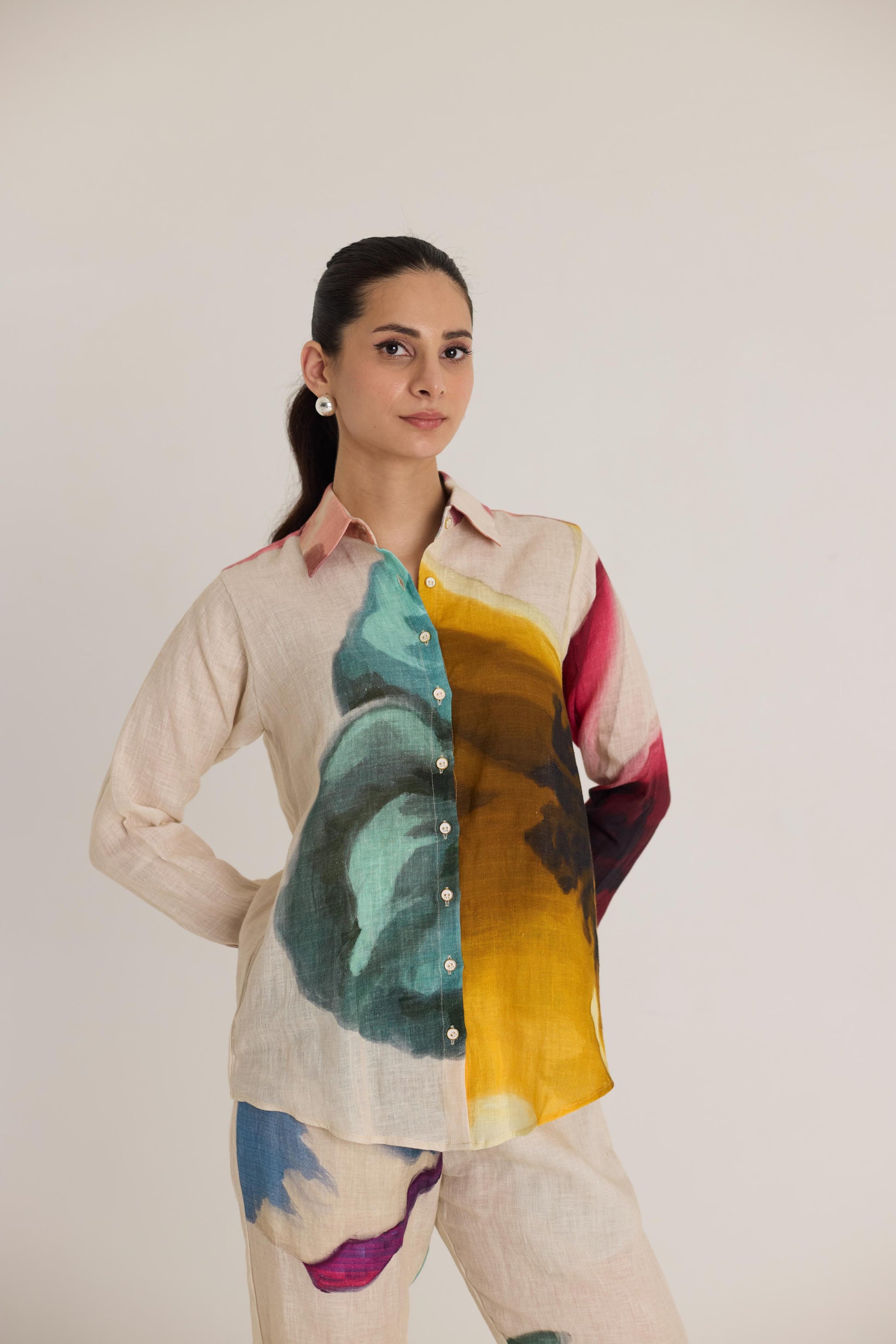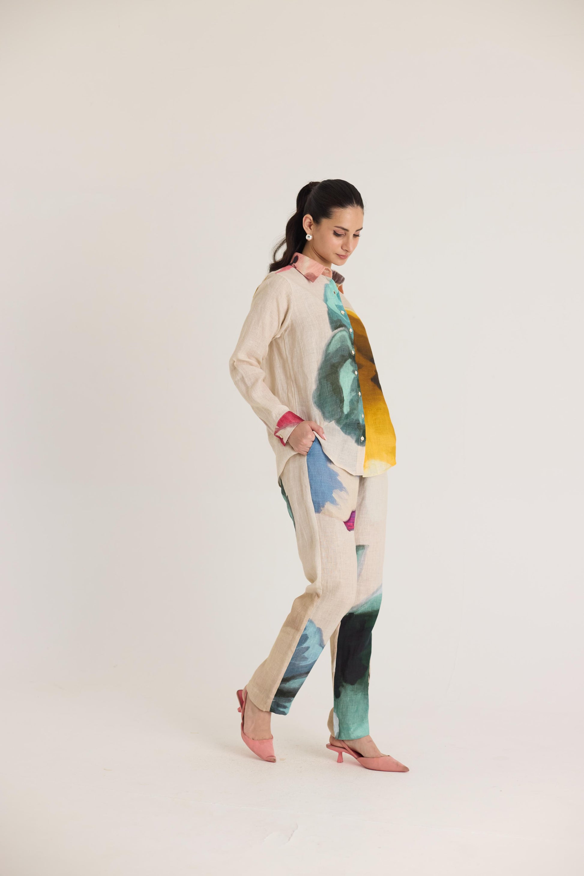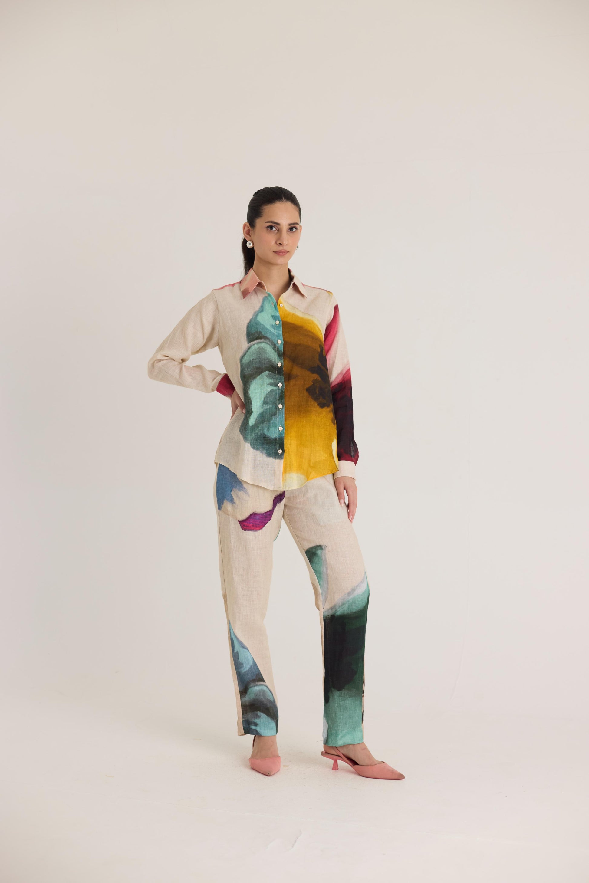 This chic beige button-down shirt set features a bold, artistic floral poppy print in blue, yellow, and red. The relaxed-fit shirt with a classic collar and full sleeves pairs seamlessly with matching straight-leg pants for an effortlessly stylish look.