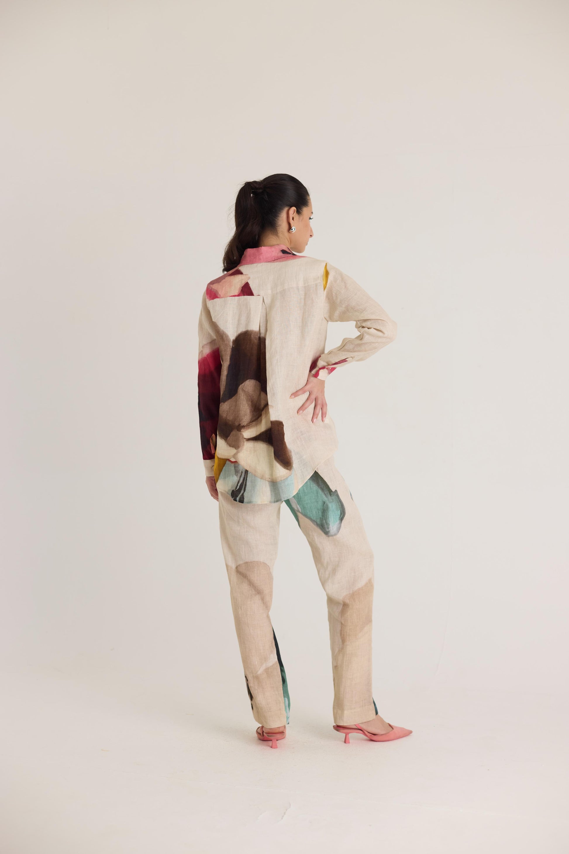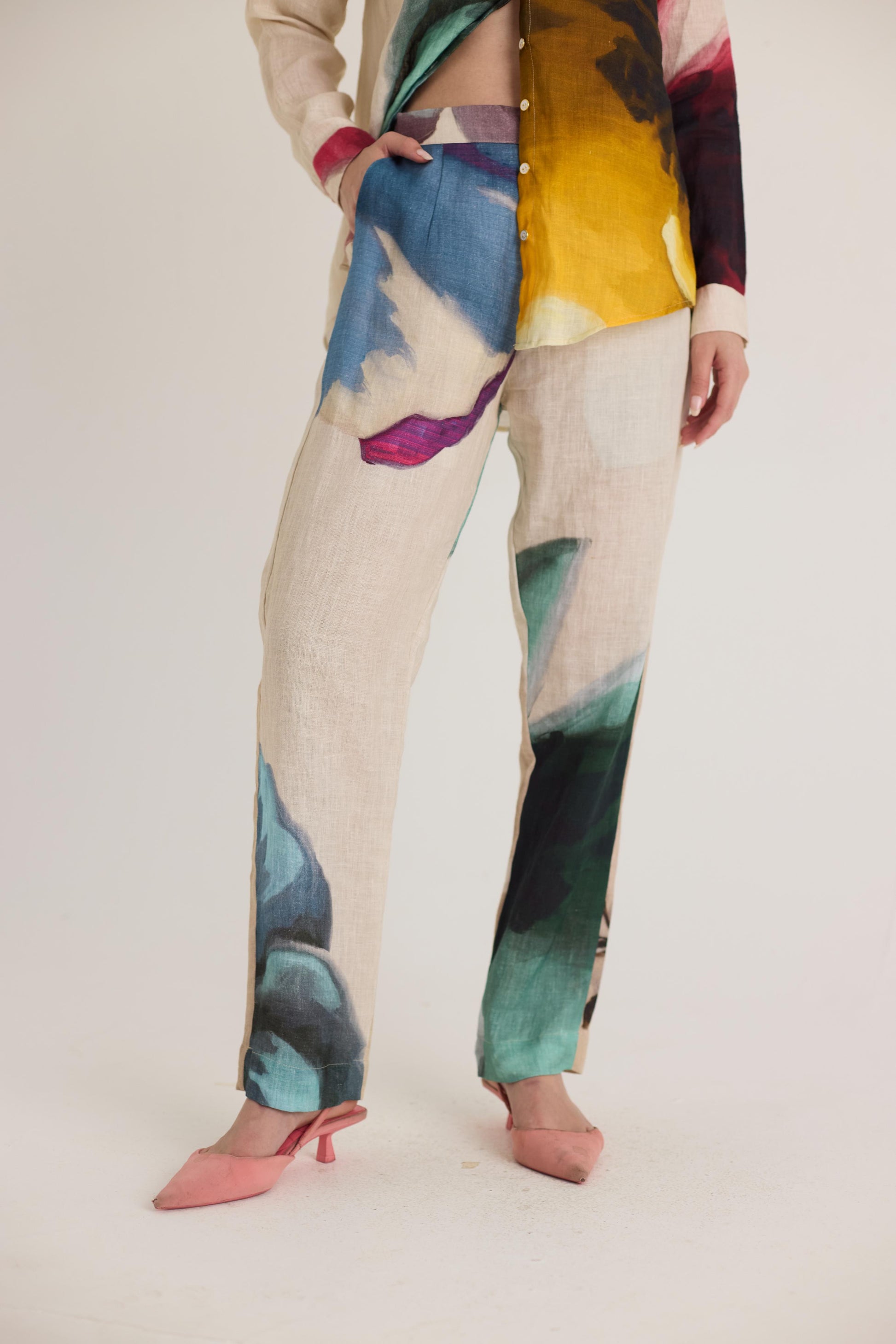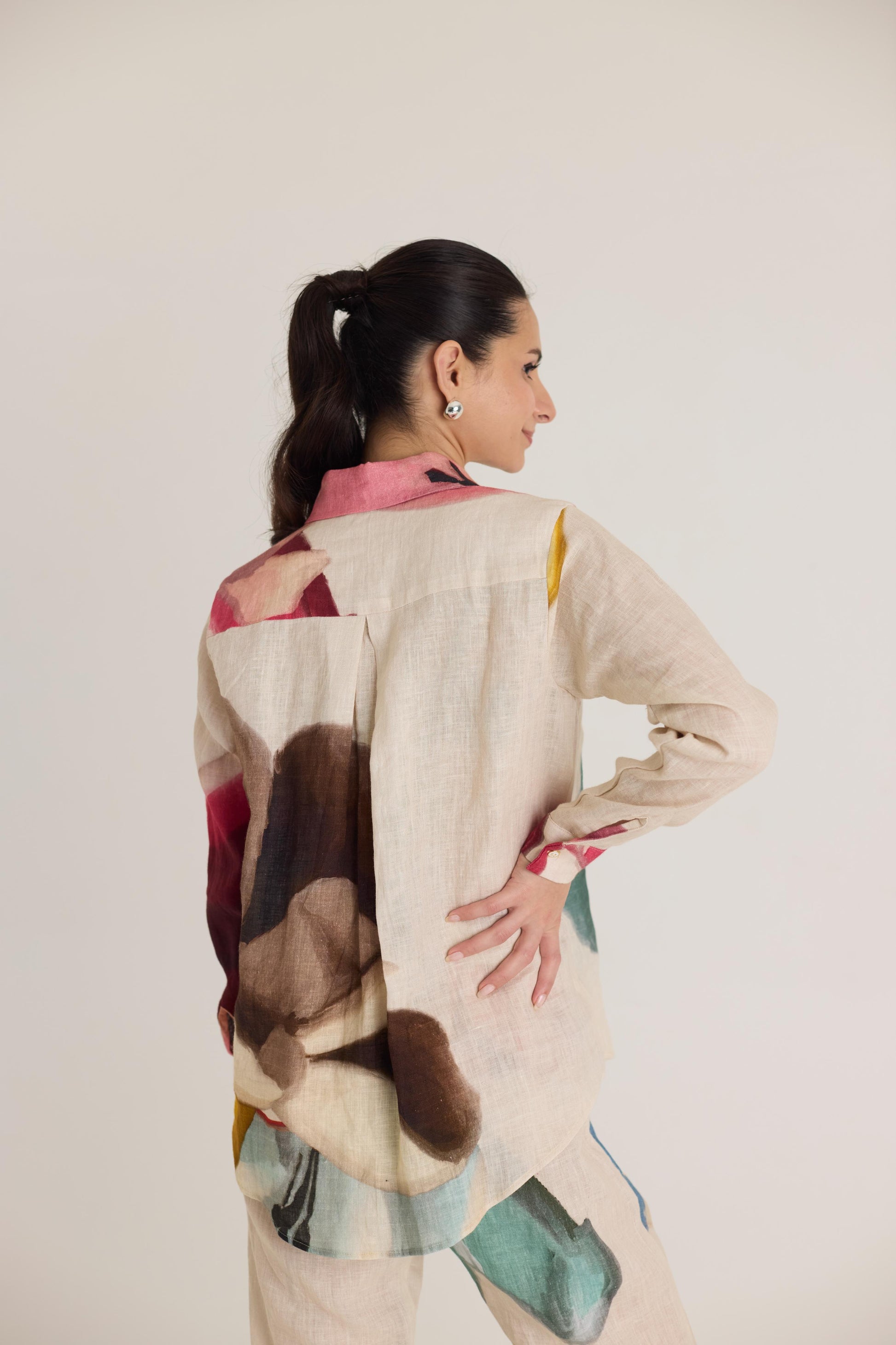 This chic beige button-down shirt set features a bold, artistic floral poppy print in blue, yellow, and red. The relaxed-fit shirt with a classic collar and full sleeves pairs seamlessly with matching straight-leg pants for an effortlessly stylish look.