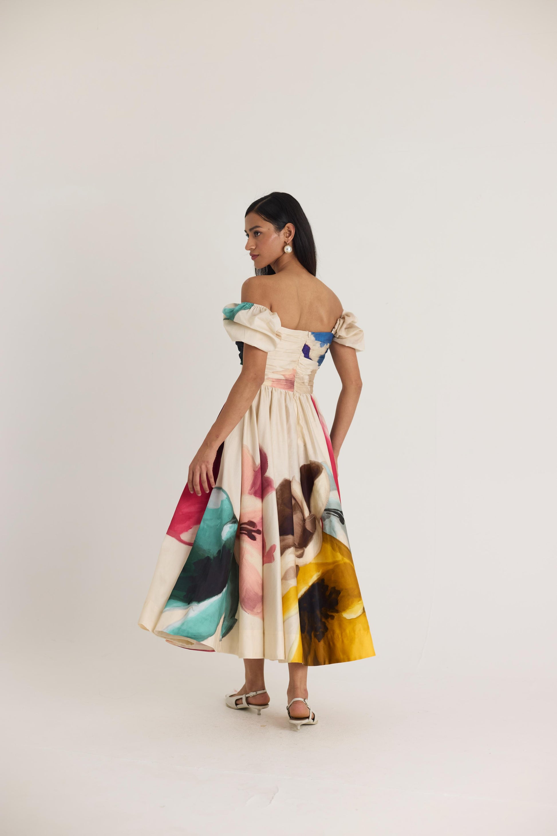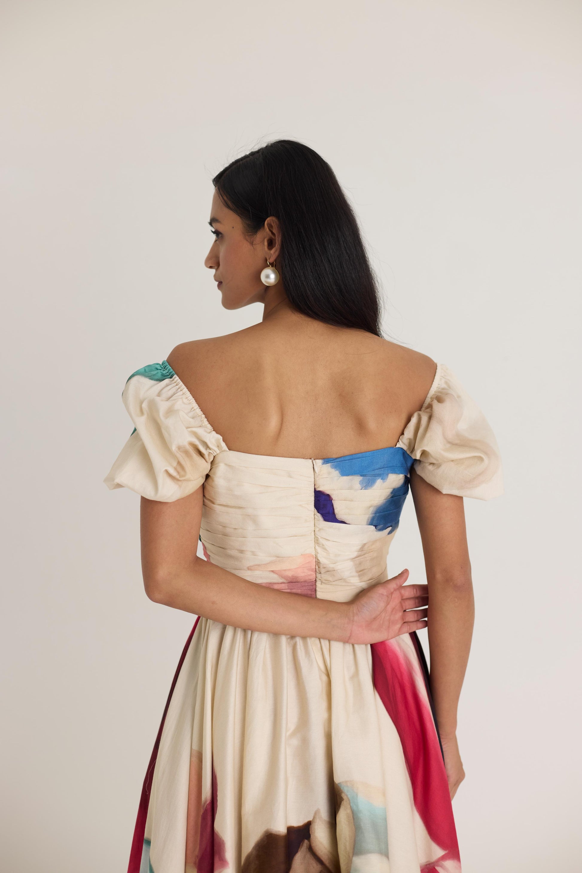 A romantic off-shoulder midi dress featuring a structured bodice with delicate ruching and a voluminous skirt adorned with an artistic watercolor-inspired print. The sweetheart neckline and puffed sleeves add a touch of vintage charm, making it perfect for both daytime and evening occasions.