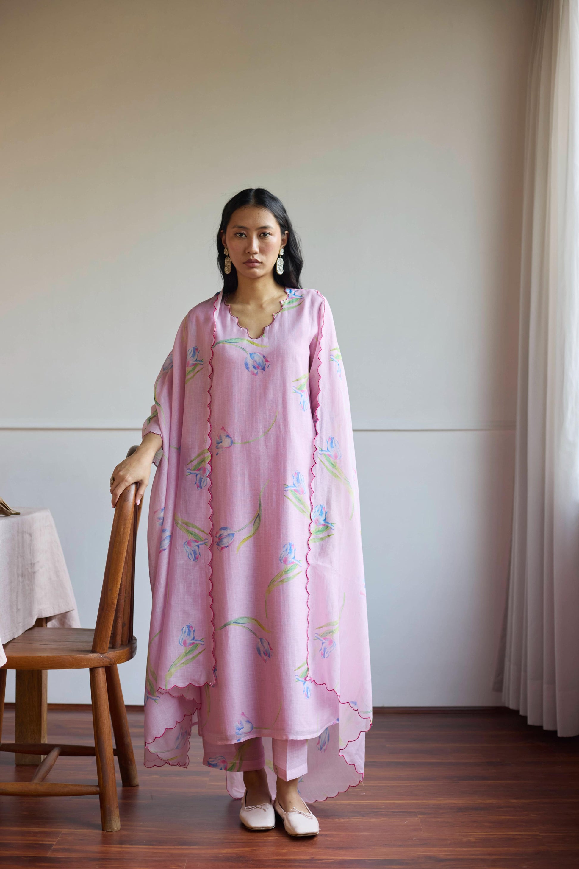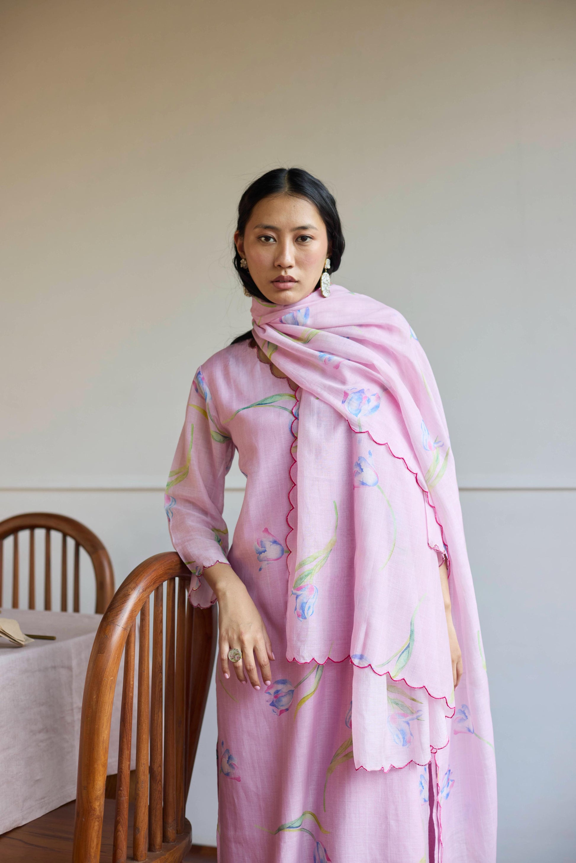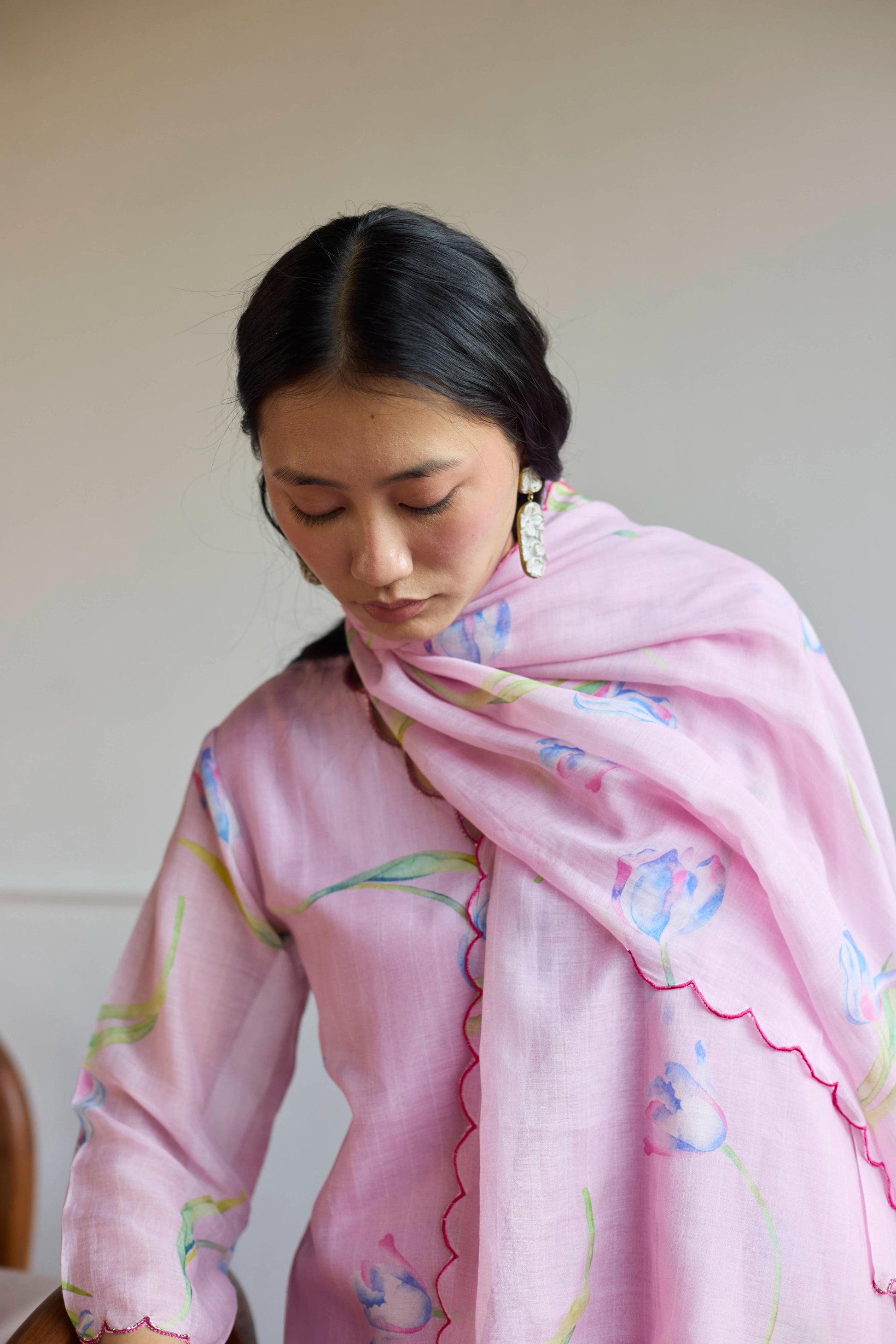 Presenting an ethereal creation of timeless grace— A handwoven Chanderi ensemble, delicately adorned, Floral Resham embroidery gracing the neck, Each stitch a whisper, elegantly worn. The dupatta, a canvas of tulip blooms, With scalloped edges, soft and divine, A symphony of texture, craft, and charm, Where artistry and beauty intertwine.