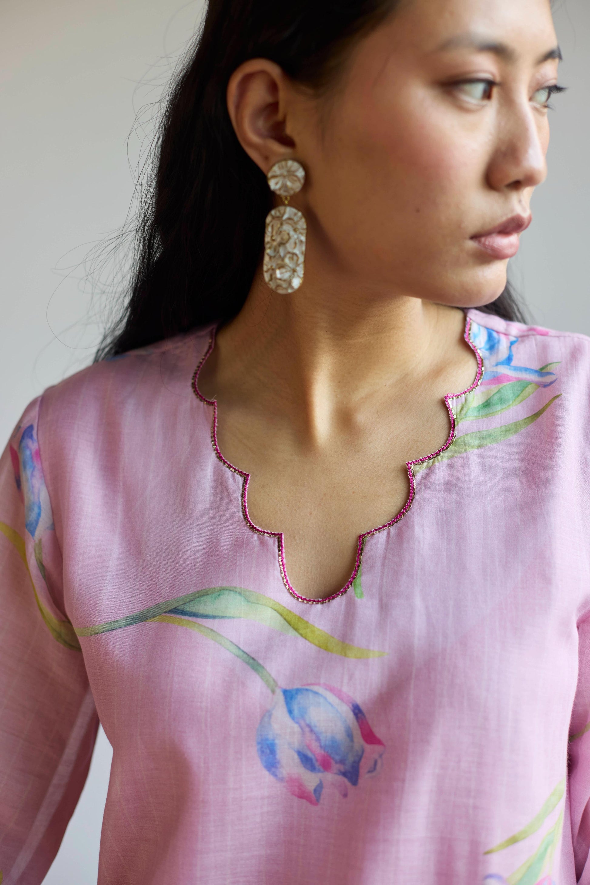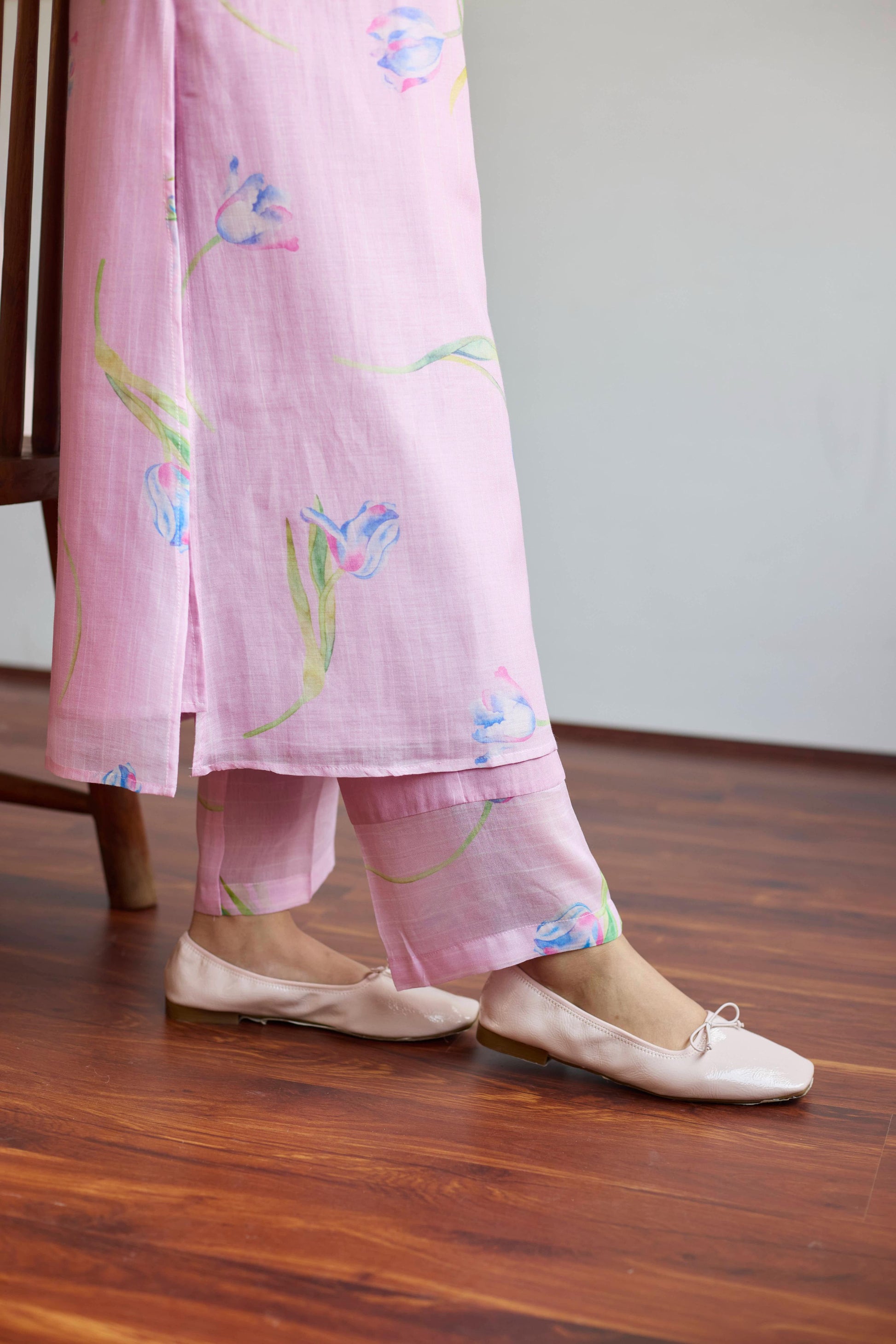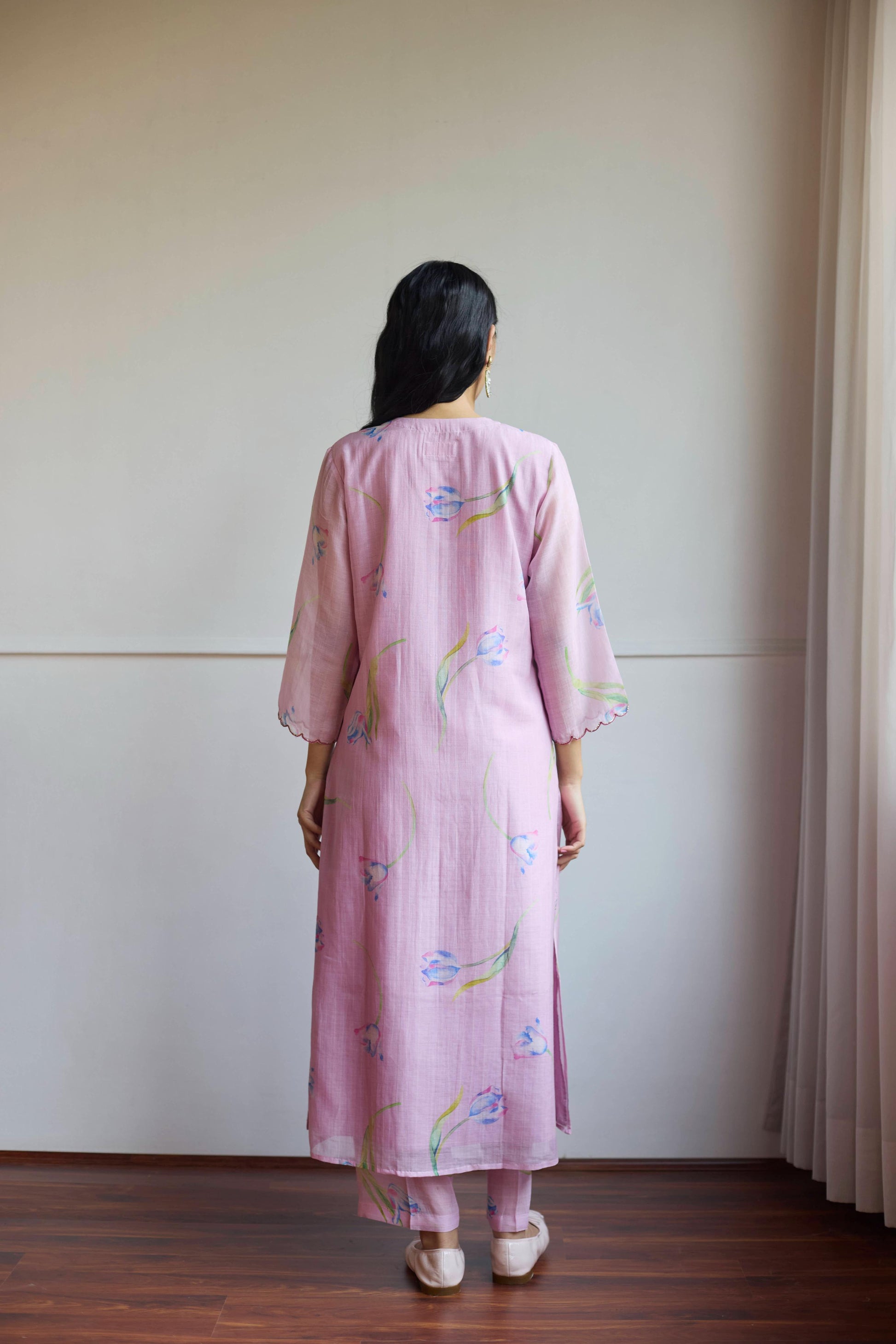 Presenting an ethereal creation of timeless grace— A handwoven Chanderi ensemble, delicately adorned, Floral Resham embroidery gracing the neck, Each stitch a whisper, elegantly worn. The dupatta, a canvas of tulip blooms, With scalloped edges, soft and divine, A symphony of texture, craft, and charm, Where artistry and beauty intertwine.