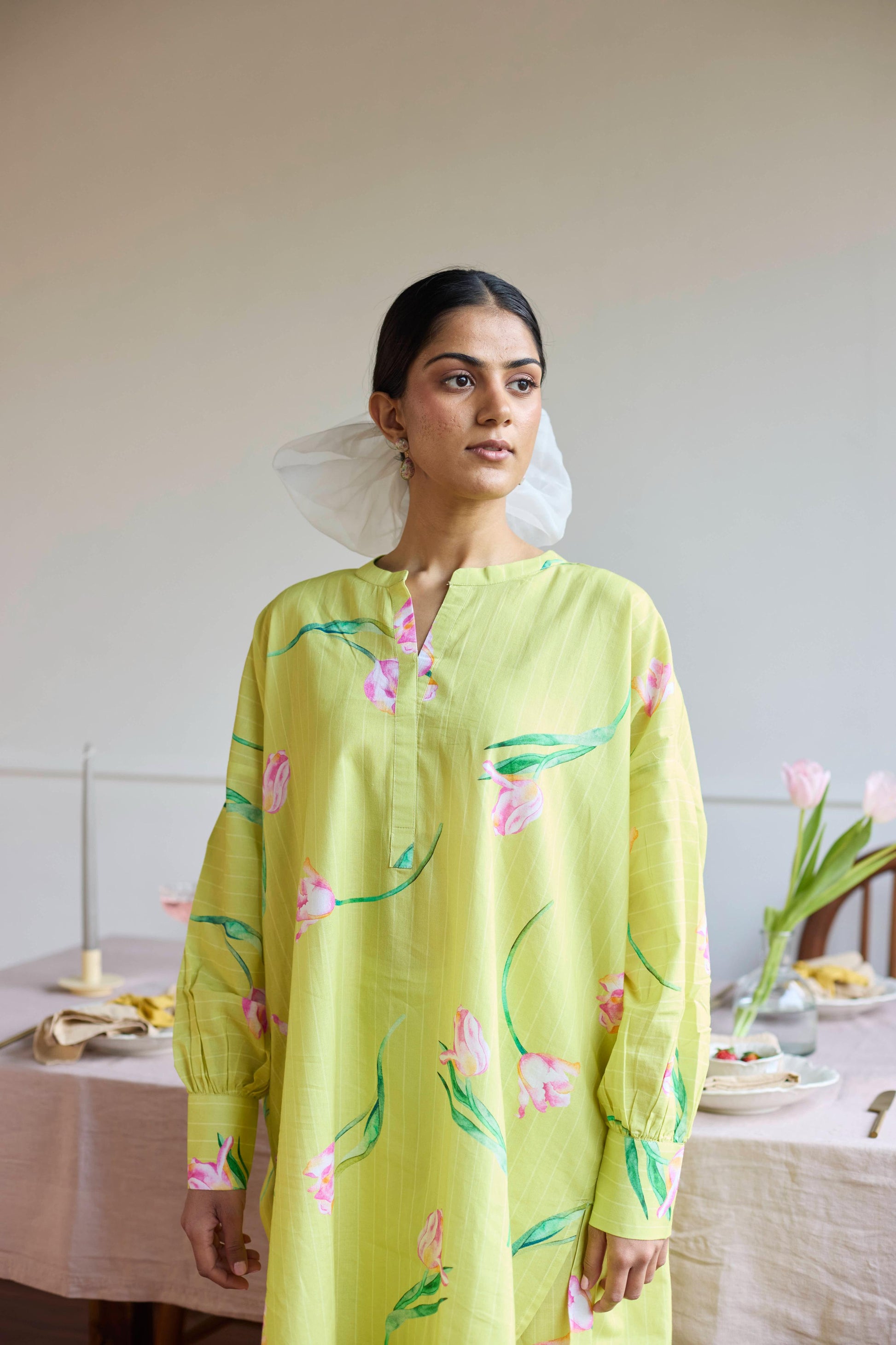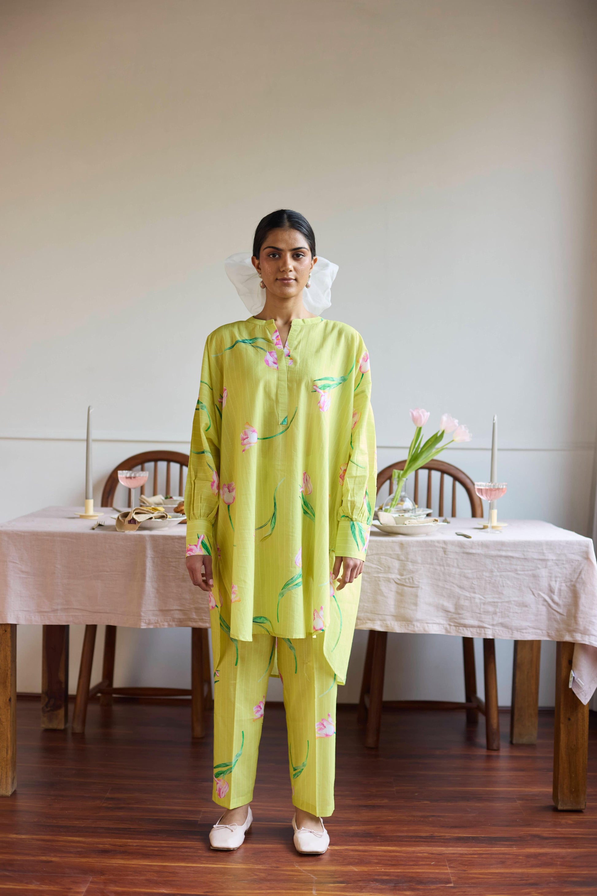 Introducing Our Cotton Anti-fit Co-ord Set, A Single Size That Flows With Ease, Adorned With Tulip Prints, Vibrant And True, A Bloom Of Beauty, Carried By The Breeze.