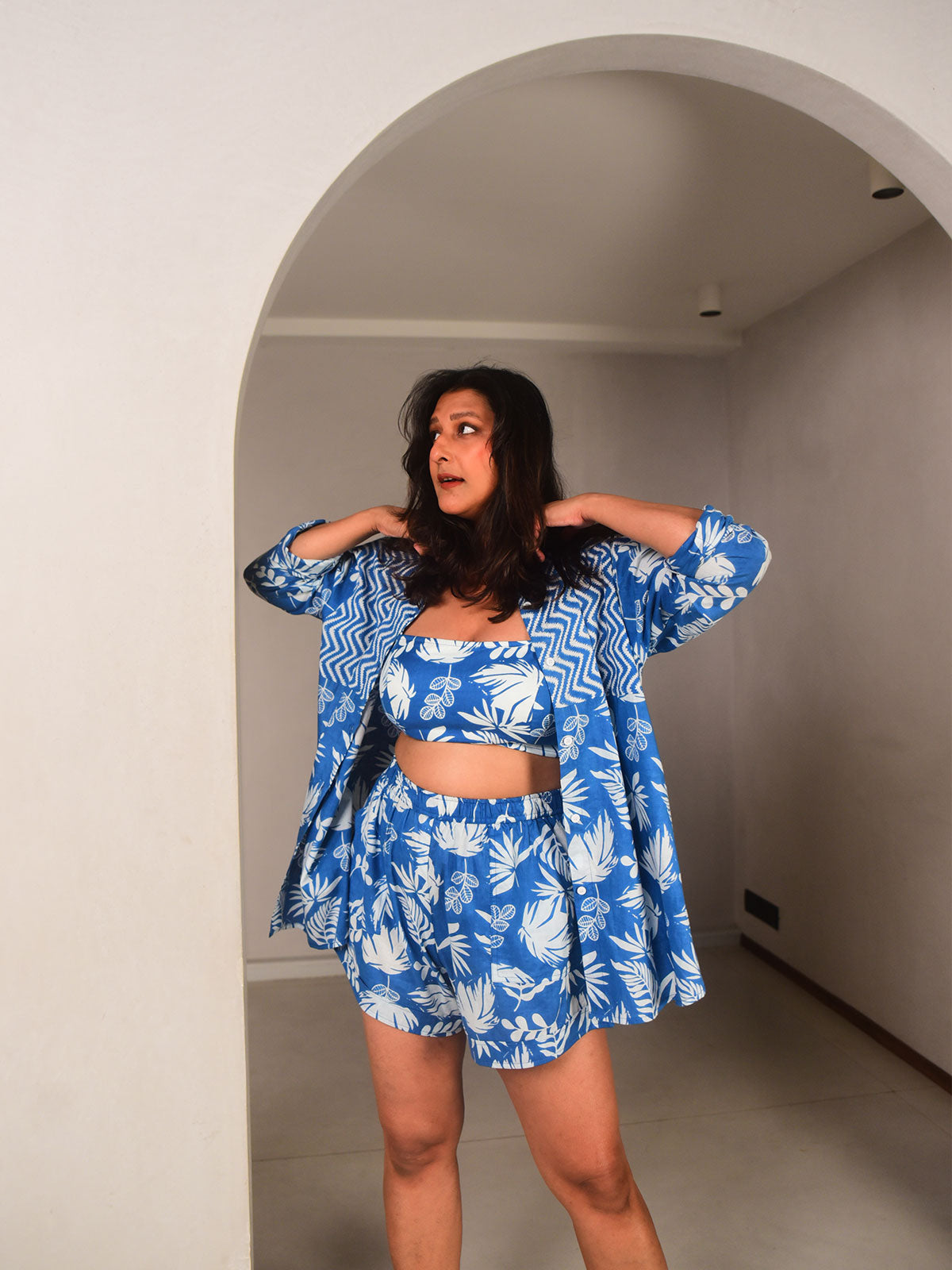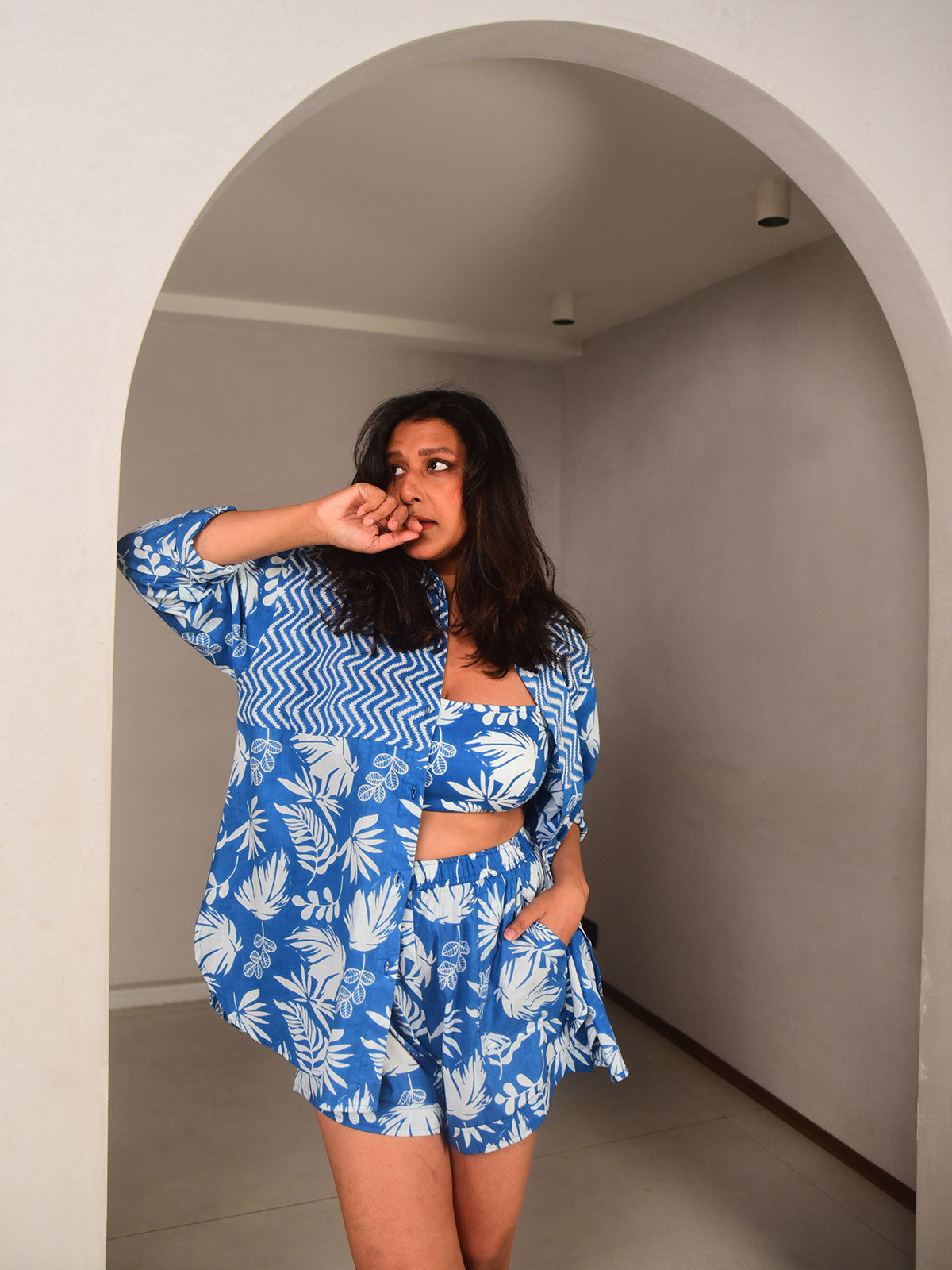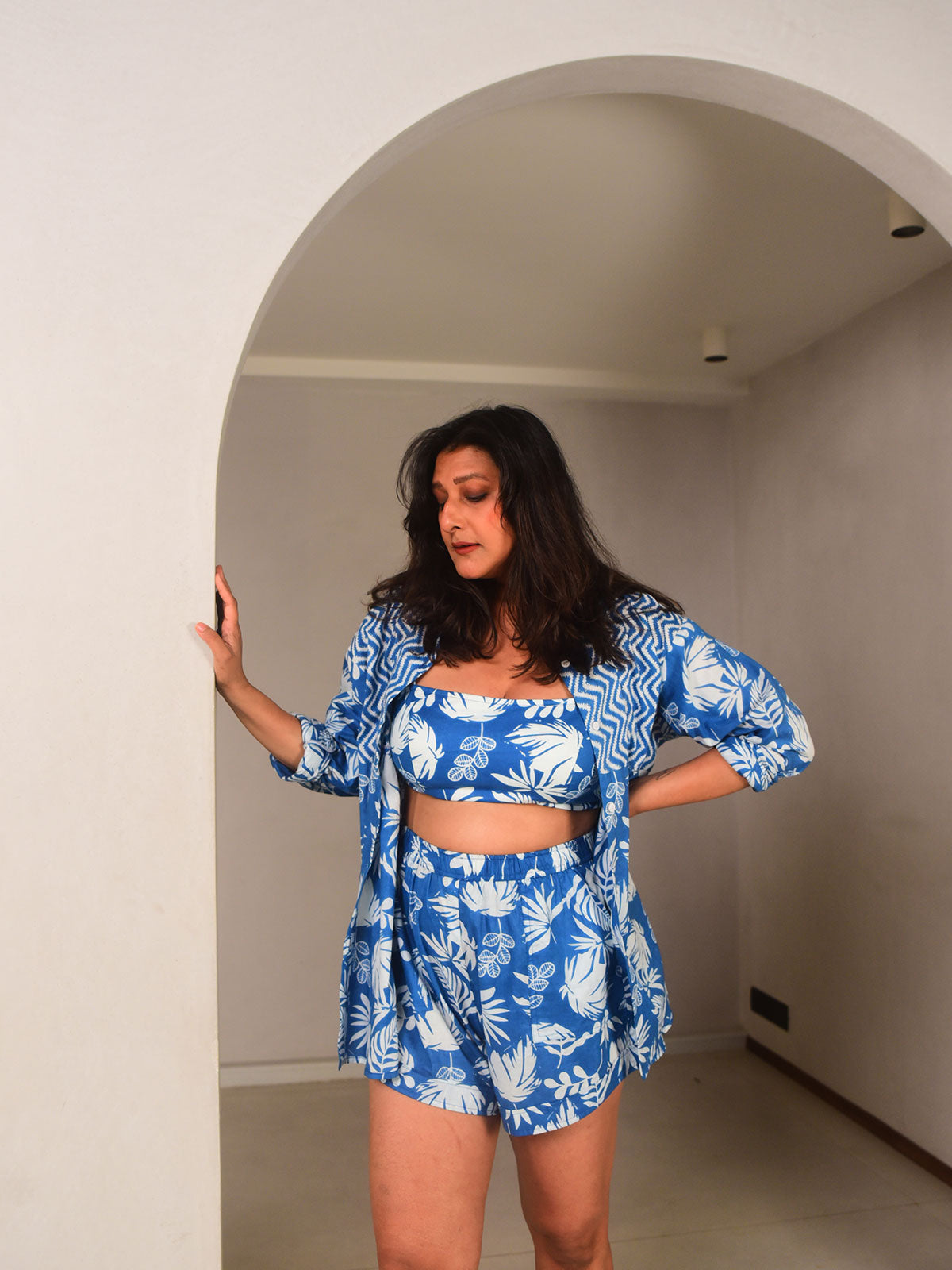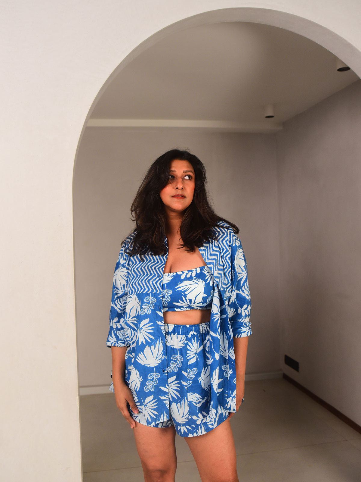 Blank this ones definitely is an essential for your summer closet. Cut in bright blue and white floral printed cotton, this padded bralette offers comfort and a stylish look. Ideal for layering with our Liv Sleeveless Jacket or simly paired with pants to add a pop of color and print to your ensemble.blank