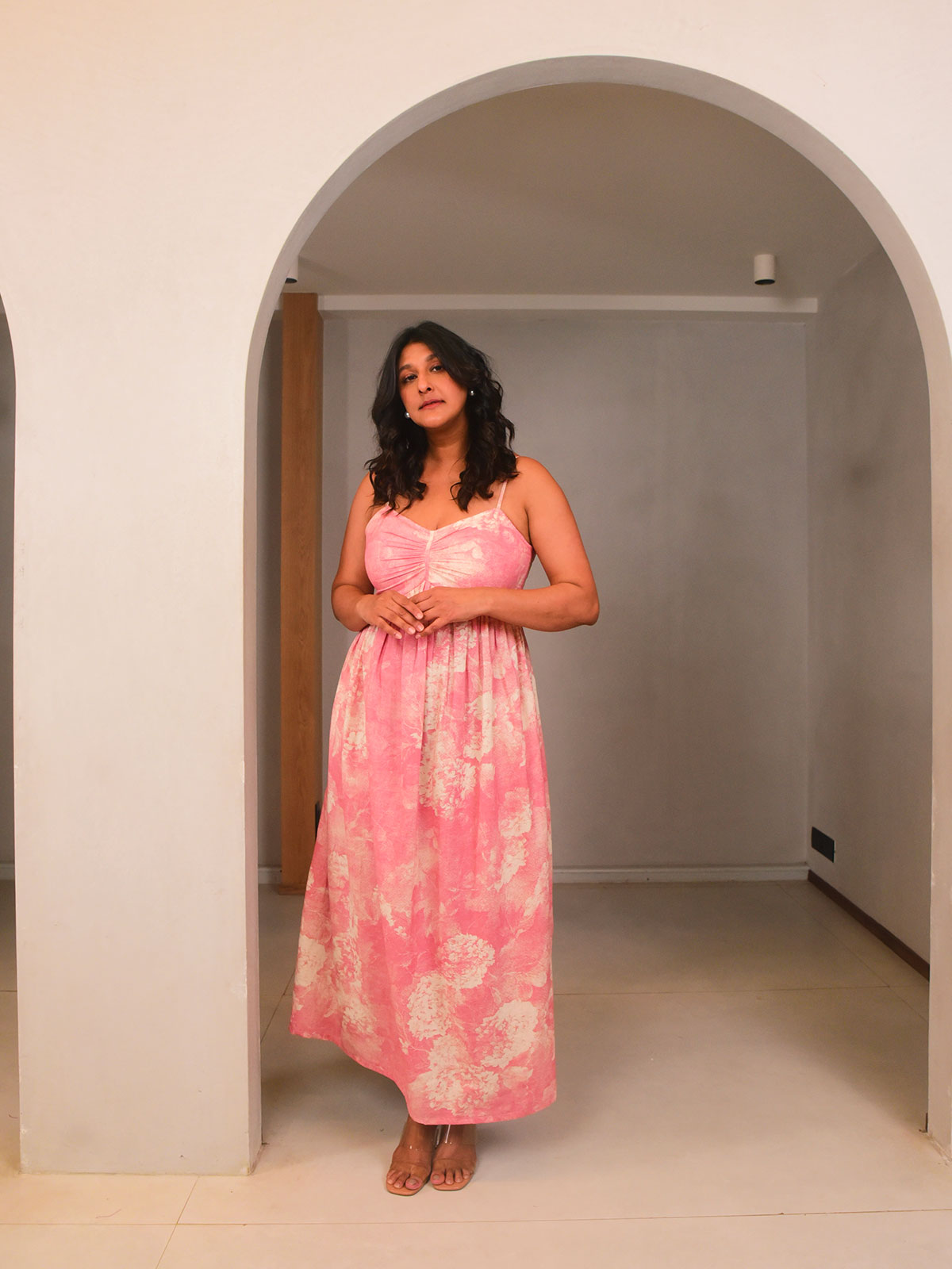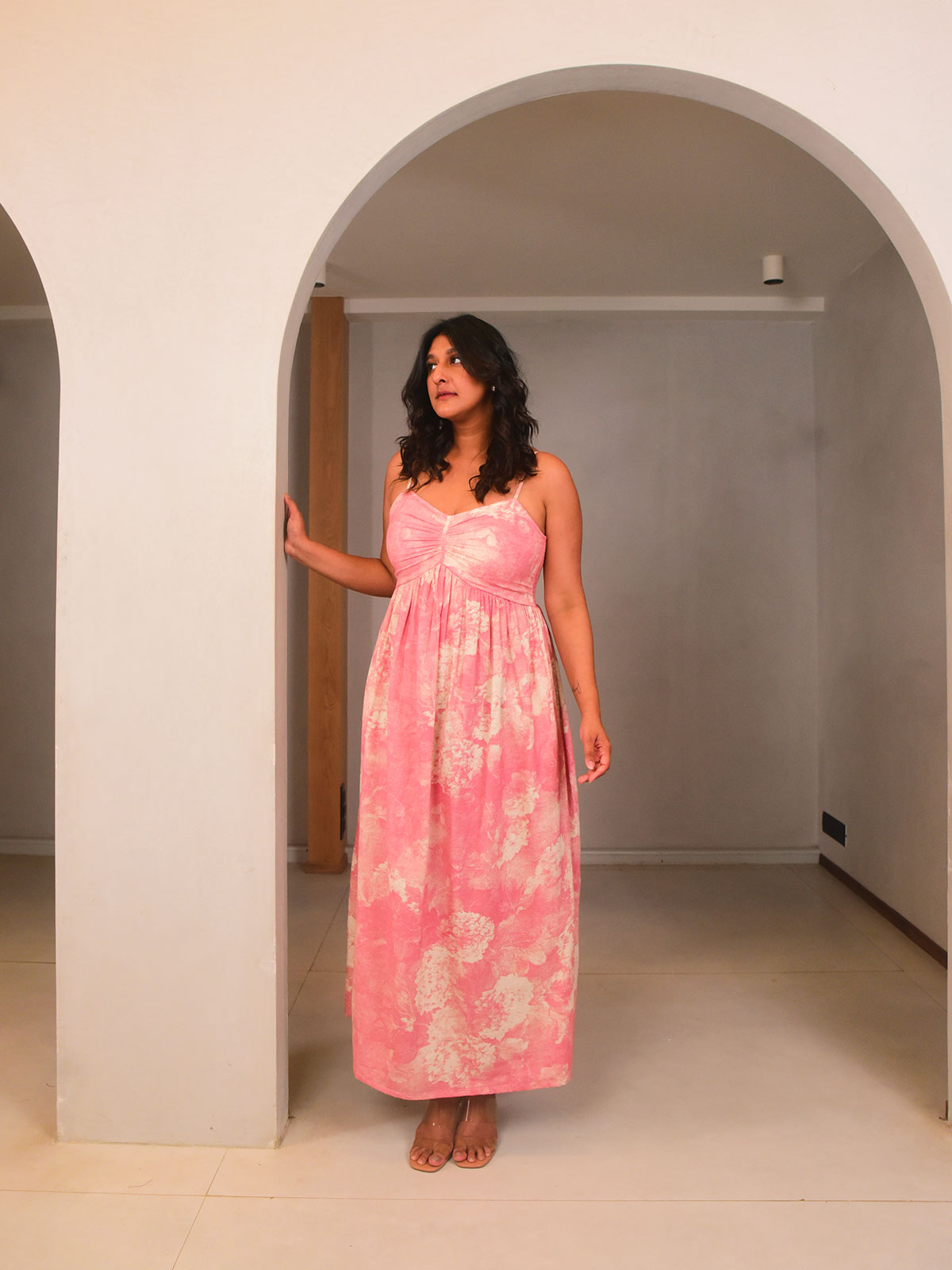 This long strappy dress combines comfort and elegance with its soft padded bust, adjustable straps, and smocked back for a flattering fit. Made from our breathable exclusive pink floral printed cotton, it features side pockets and gathered detailing on the bust yoke. Ideal for summer vacations or evening walks, style it with slides and a sling bag for a relaxed vibe.
