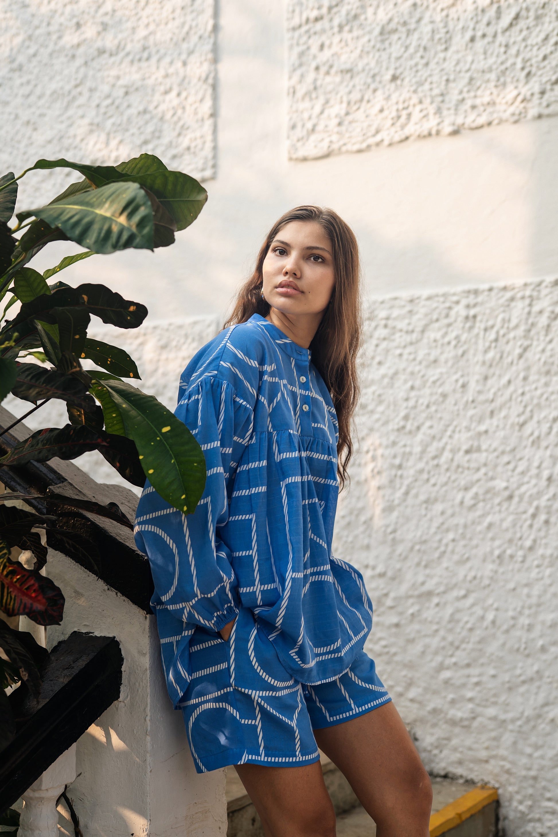 Lolo top is a anti fit gathered top made from our linen cotton fabrication in geometric print.
