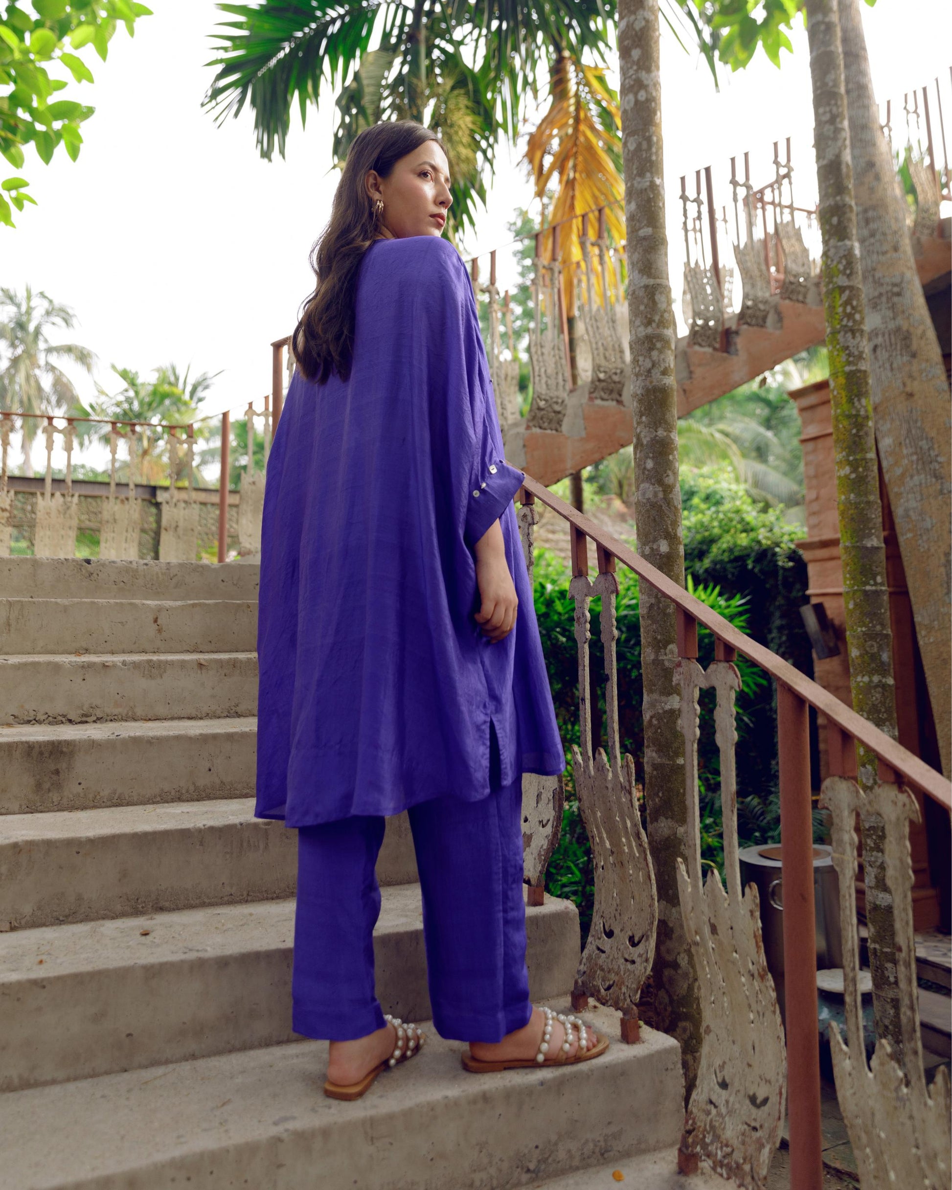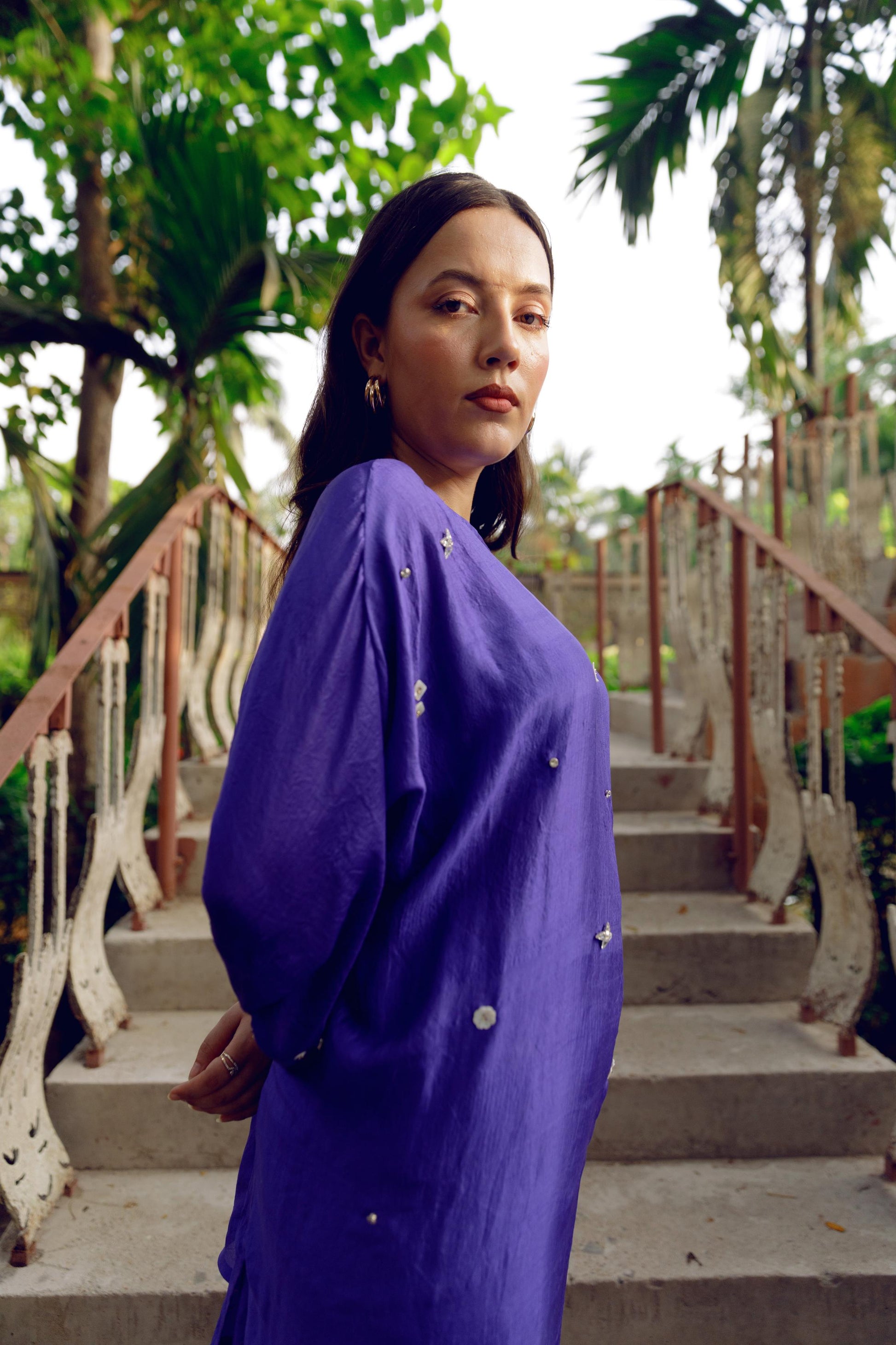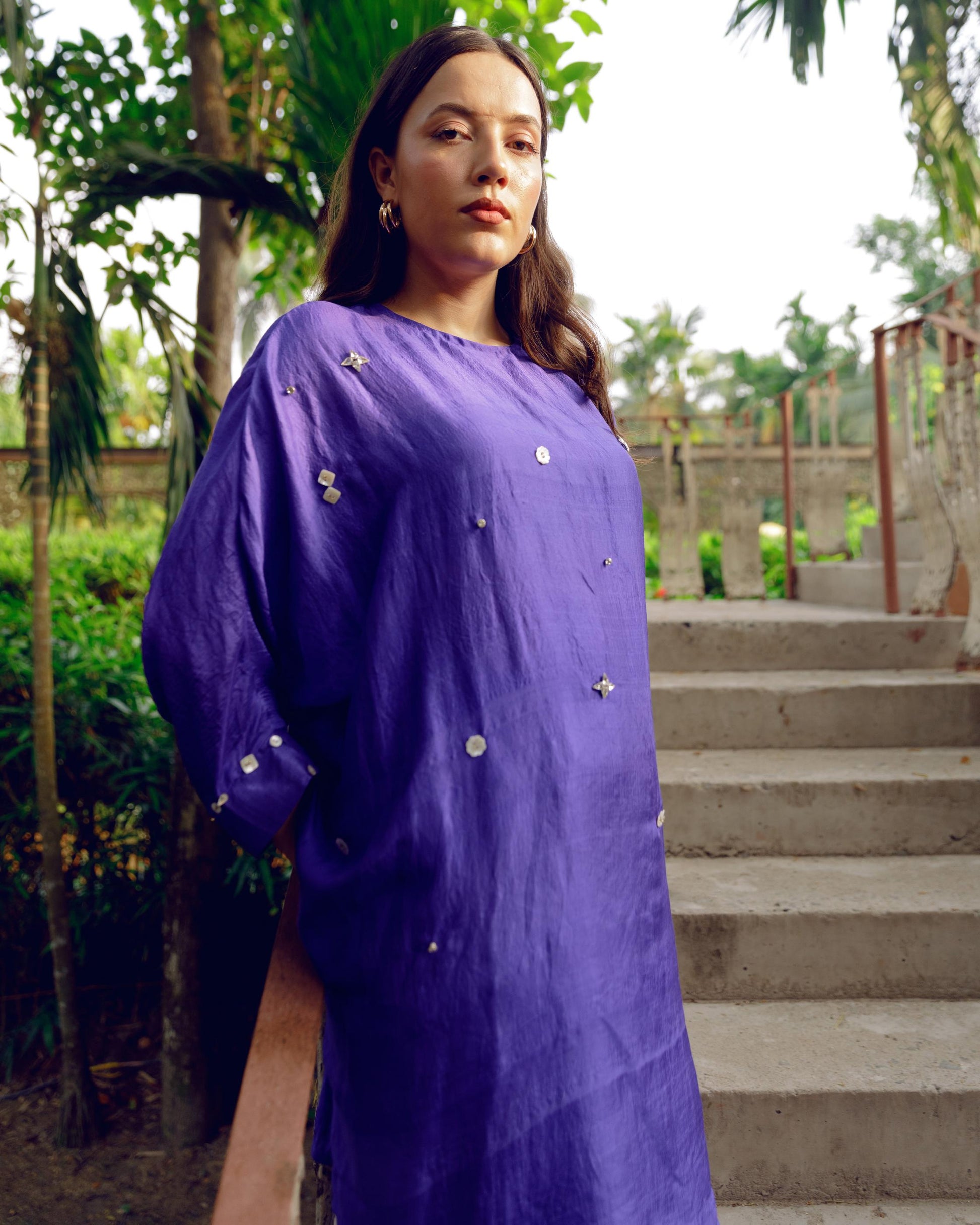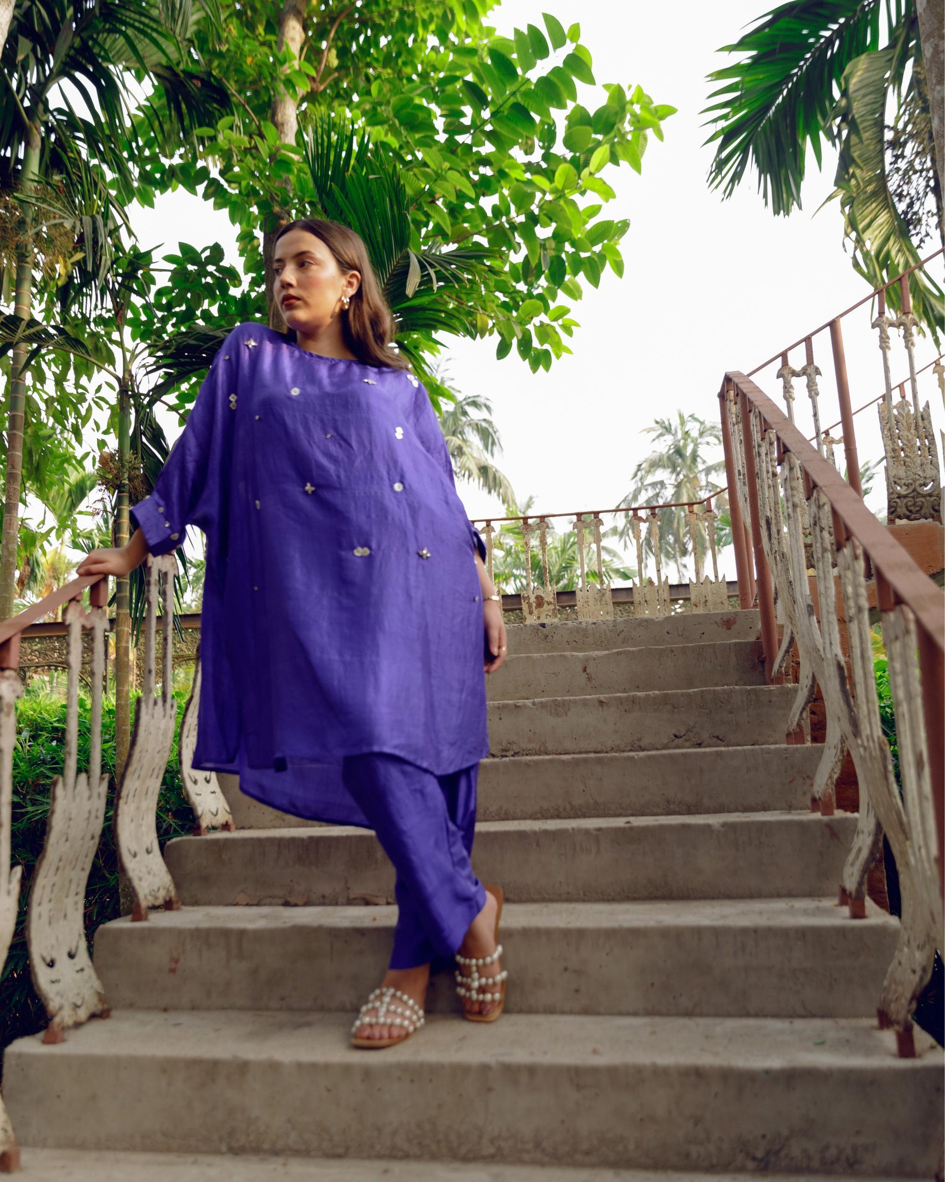 Purple coloured handwoven mulberry silk free size tunic, with all over Mother of Pearl and crystal embroidery. Paired with straight comfortable trouser.
