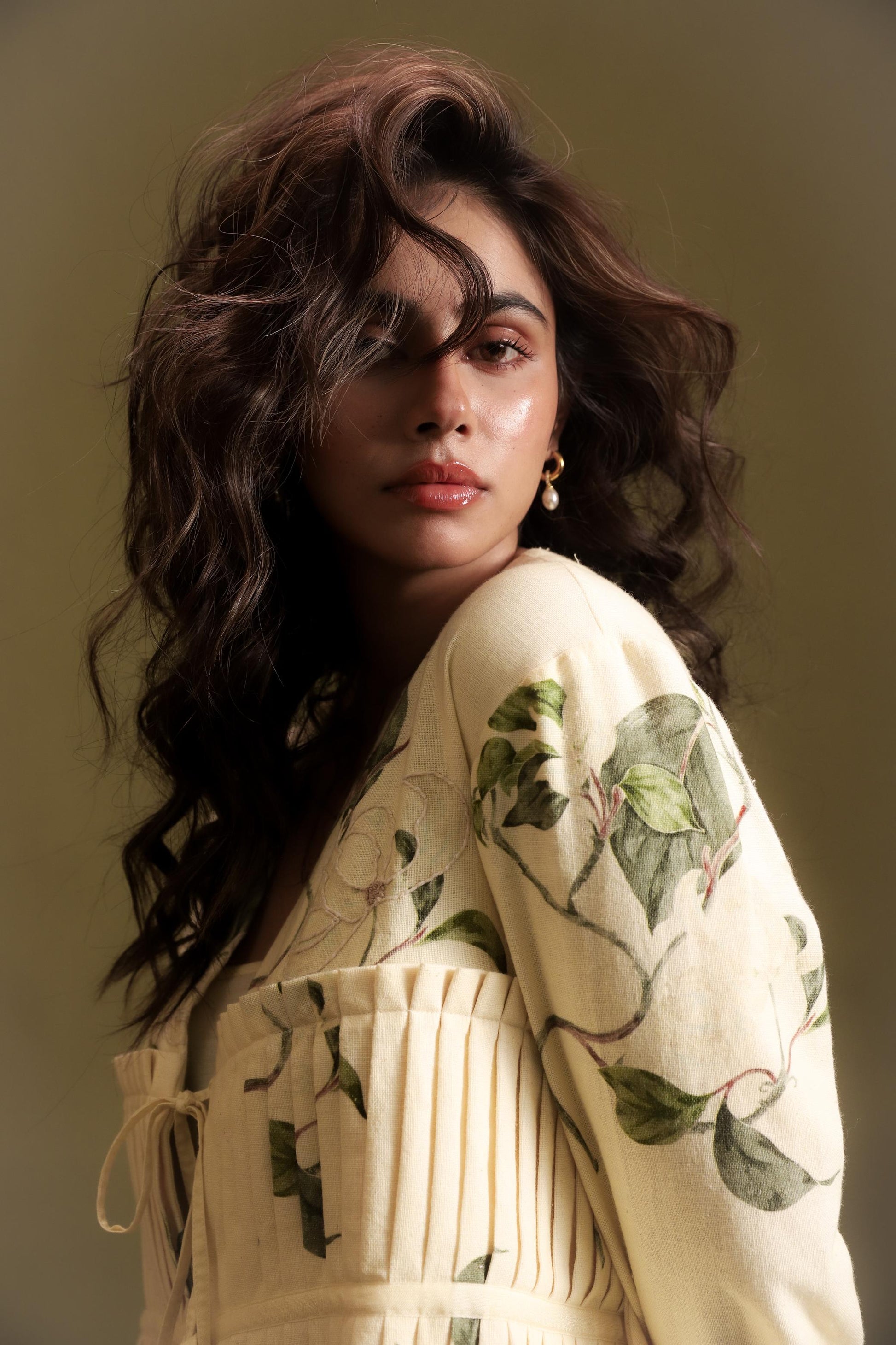 Pure khadi printed and embroidered jacket with pleats at front and tie up detail