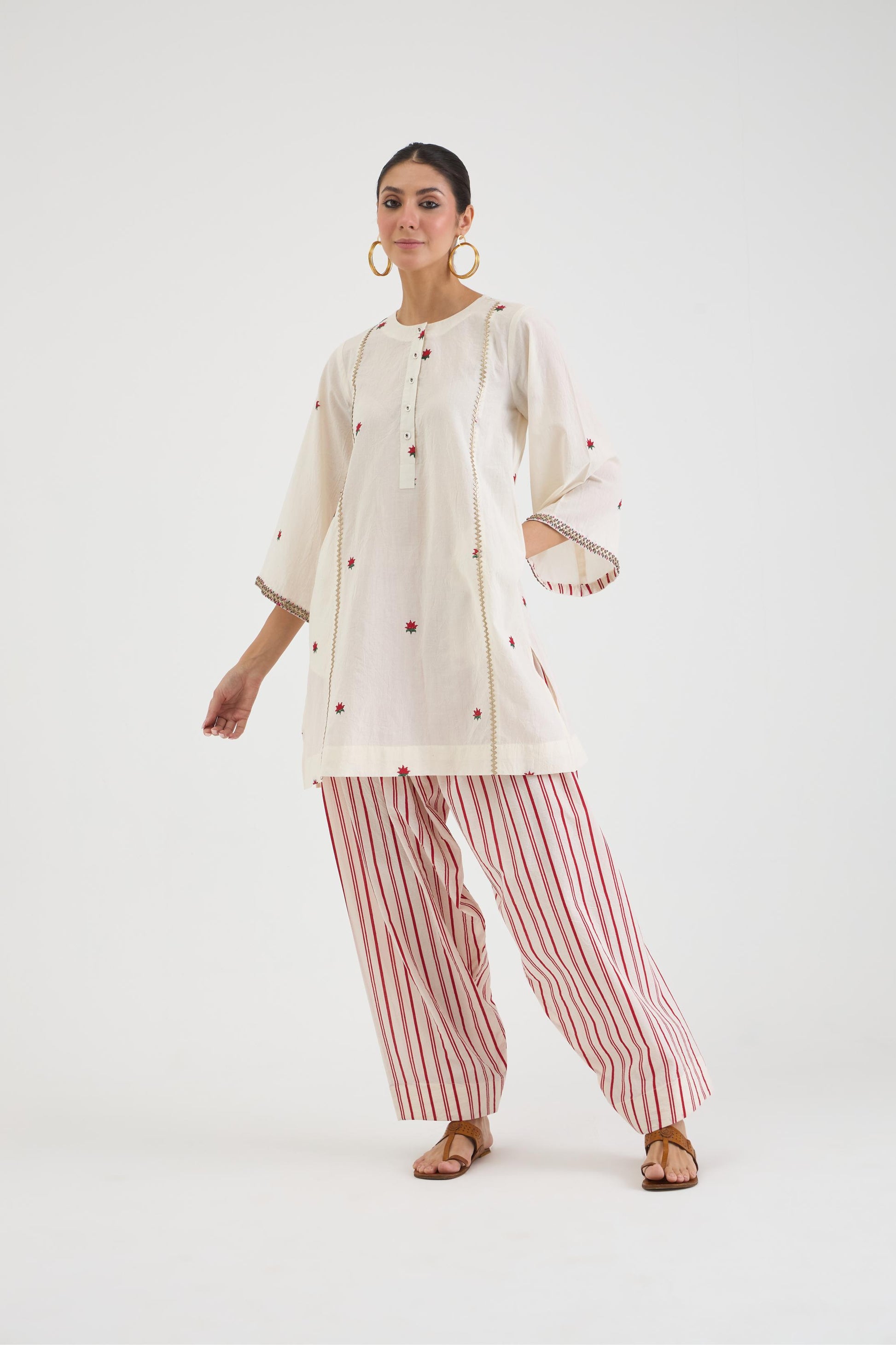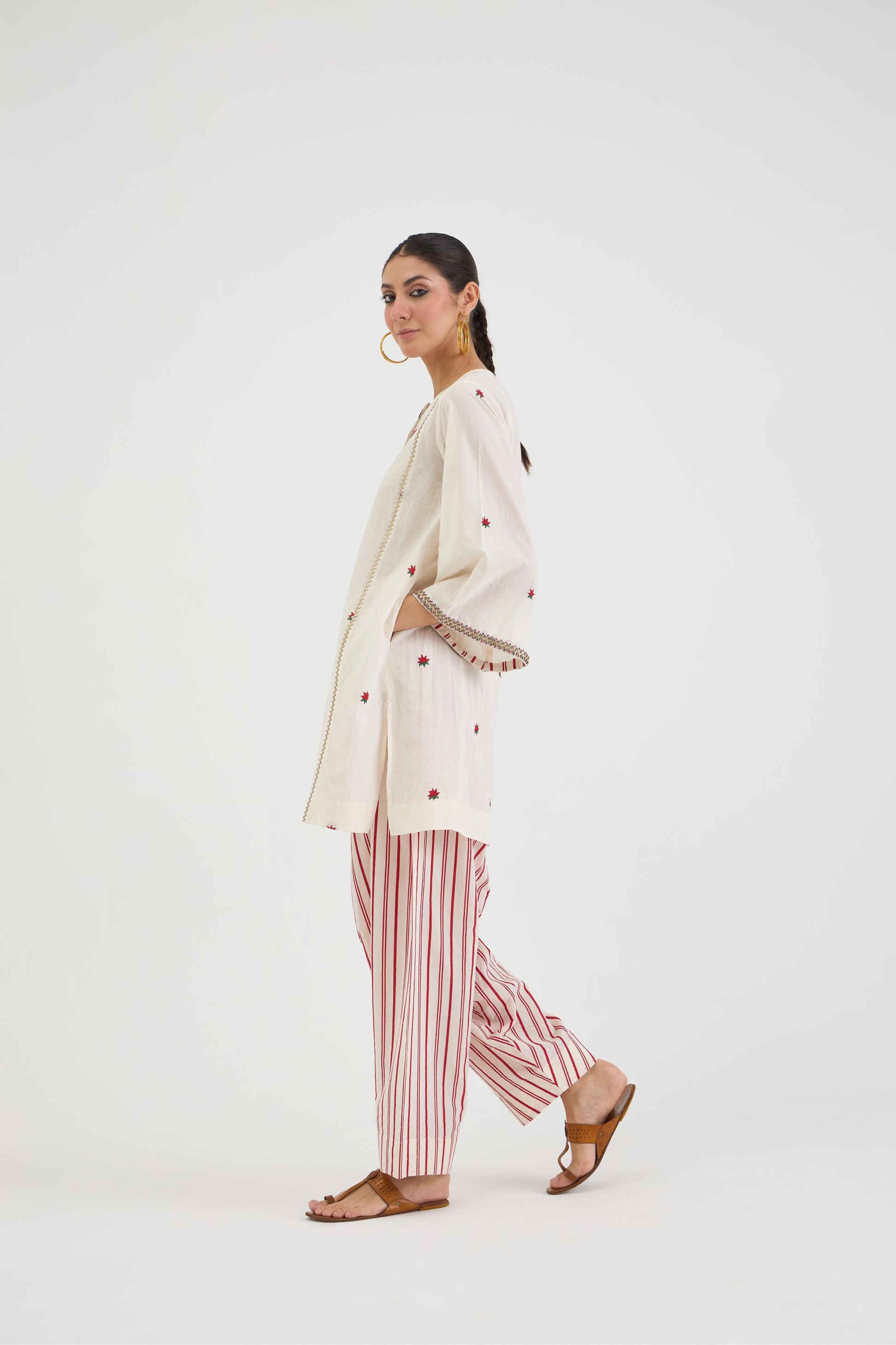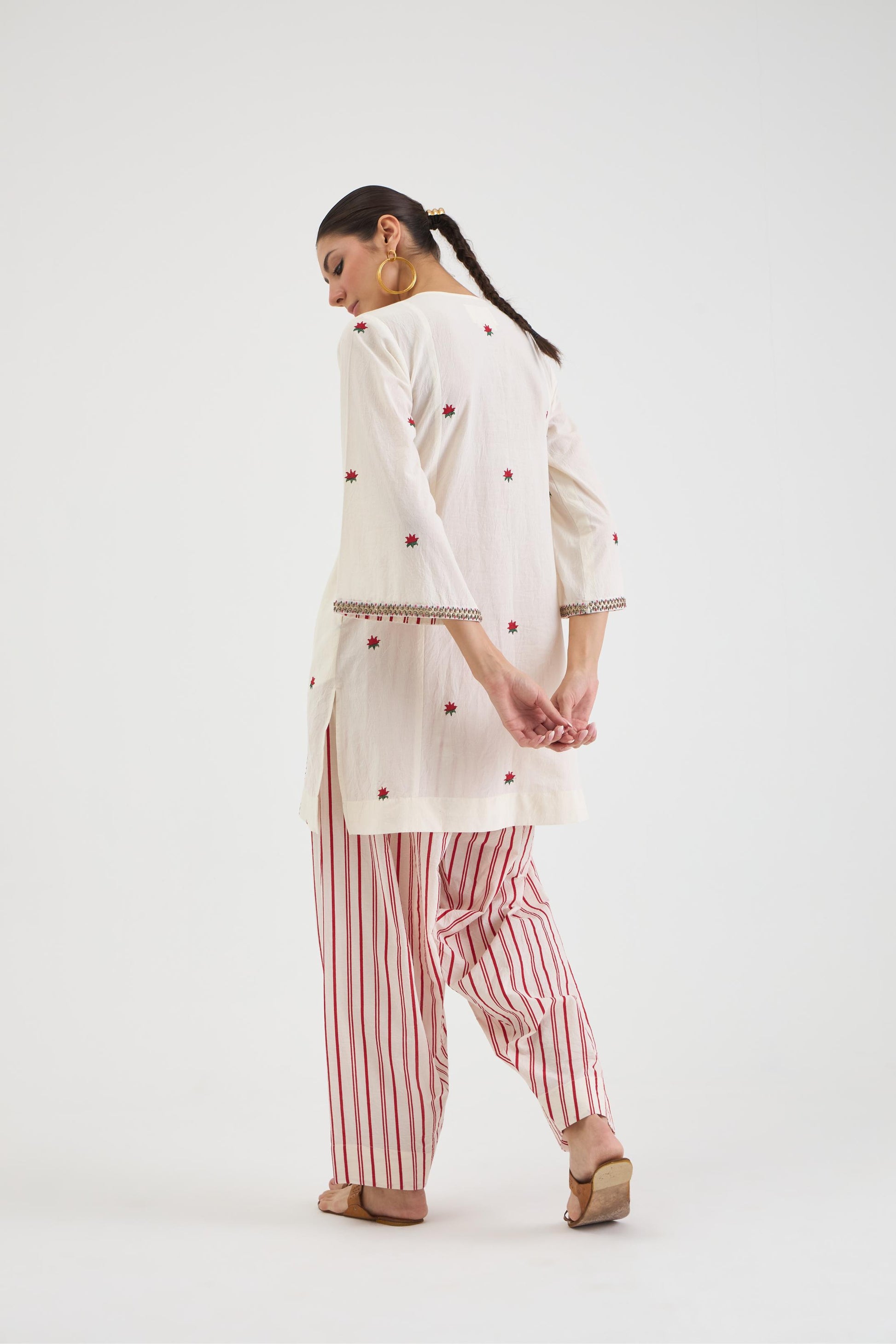 Kalidaar short kurta emblished with gota on the kali, intricate hand embroidery paired up with stripe pants