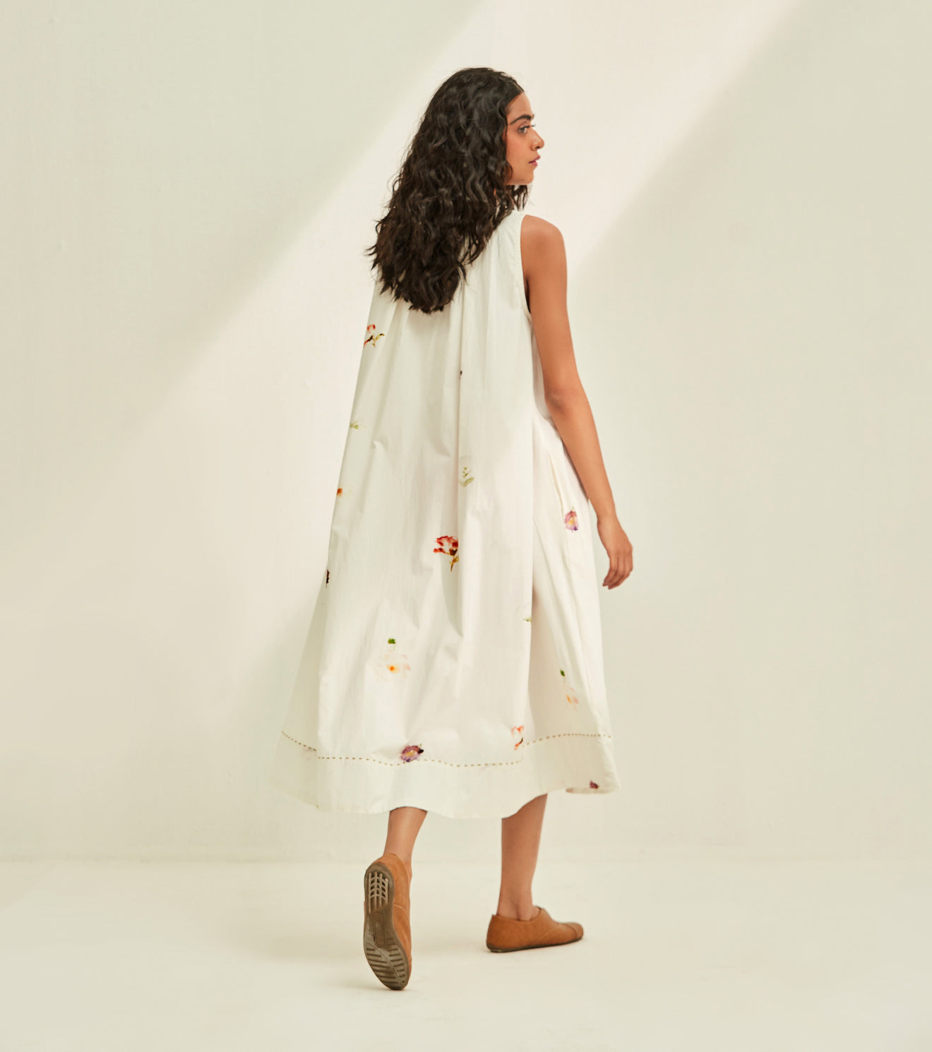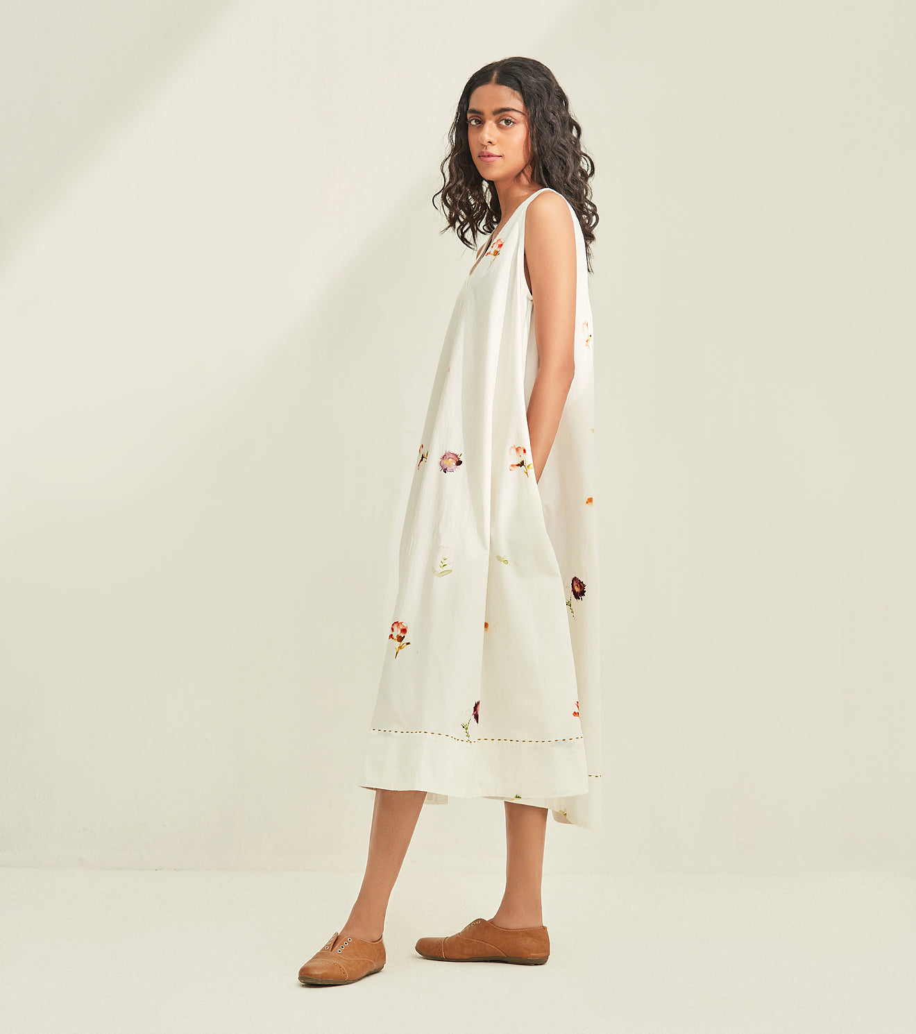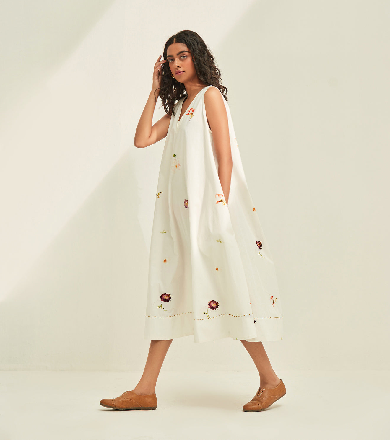 Experience the magic of this season in our airy white floral dress. crafted in poplin. Handcrafted in India. Side seam pockets.