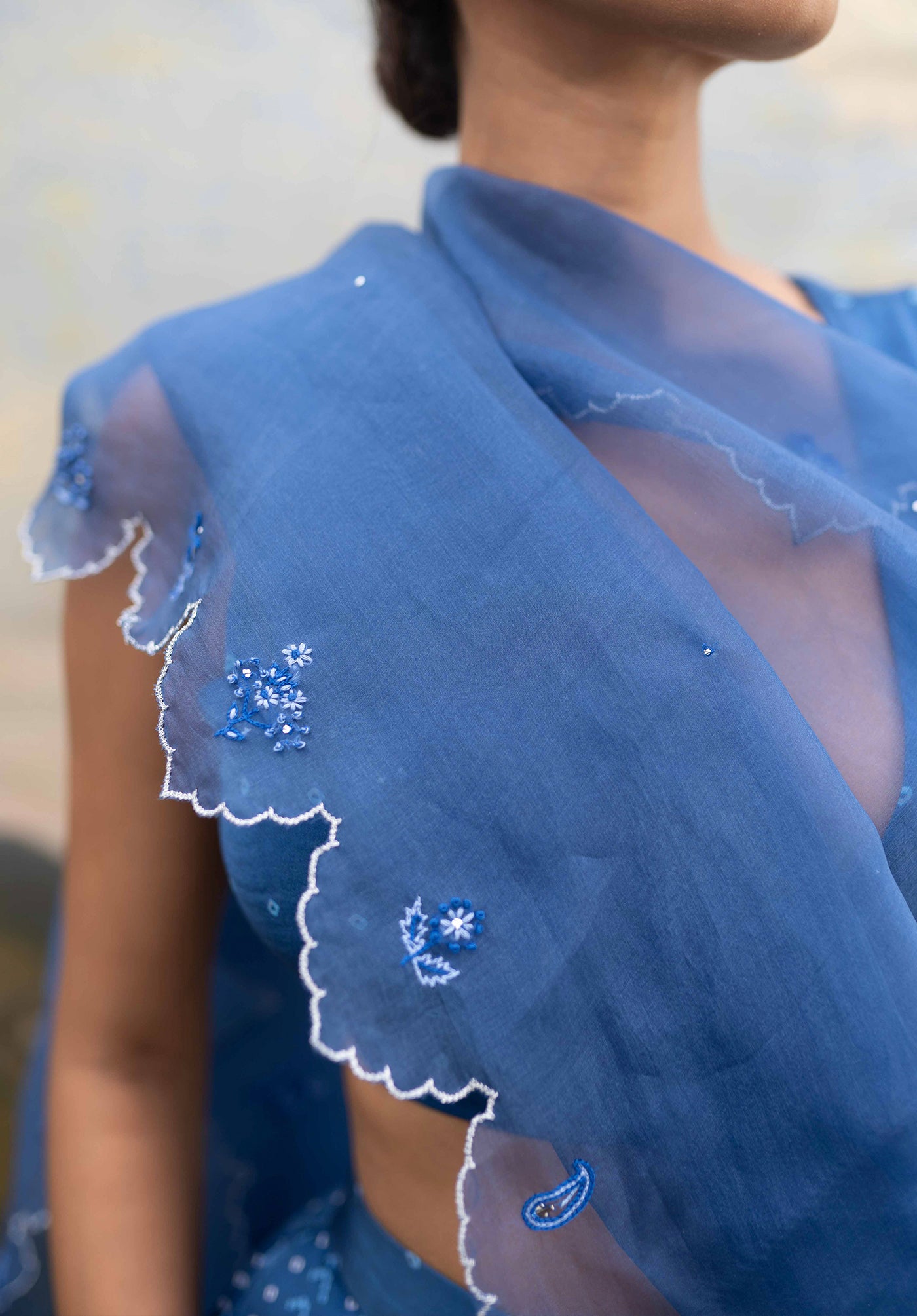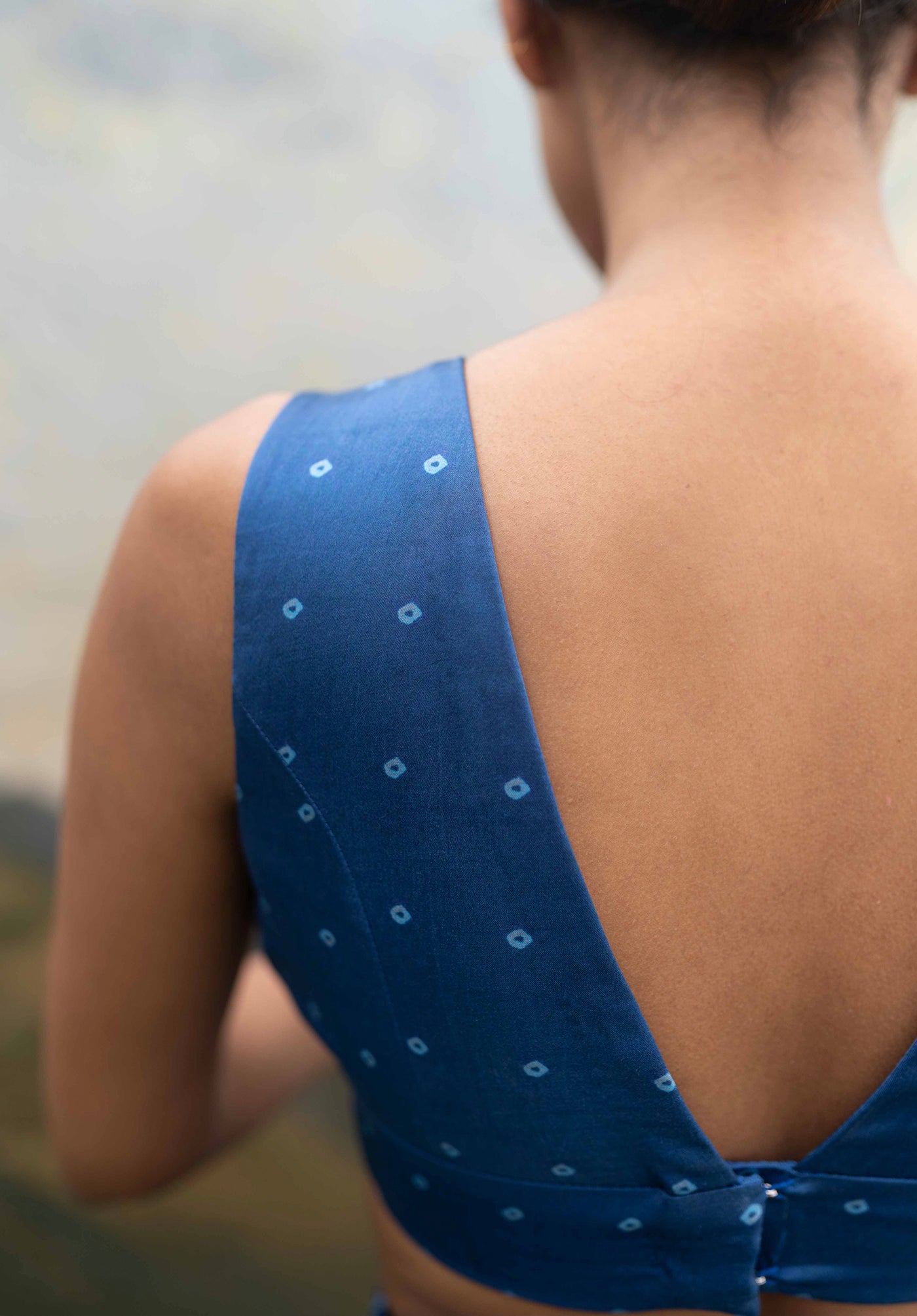 Inspired by the spirit of the moon, the Luna bandhani lehenga is exquisitely printed on a midnight blue satin base and is paired with a bandhani blue blouse The dupatta features temple scallops on the edges and an amalgamation of 20 different bootis. The dupatta is hand embroidered.