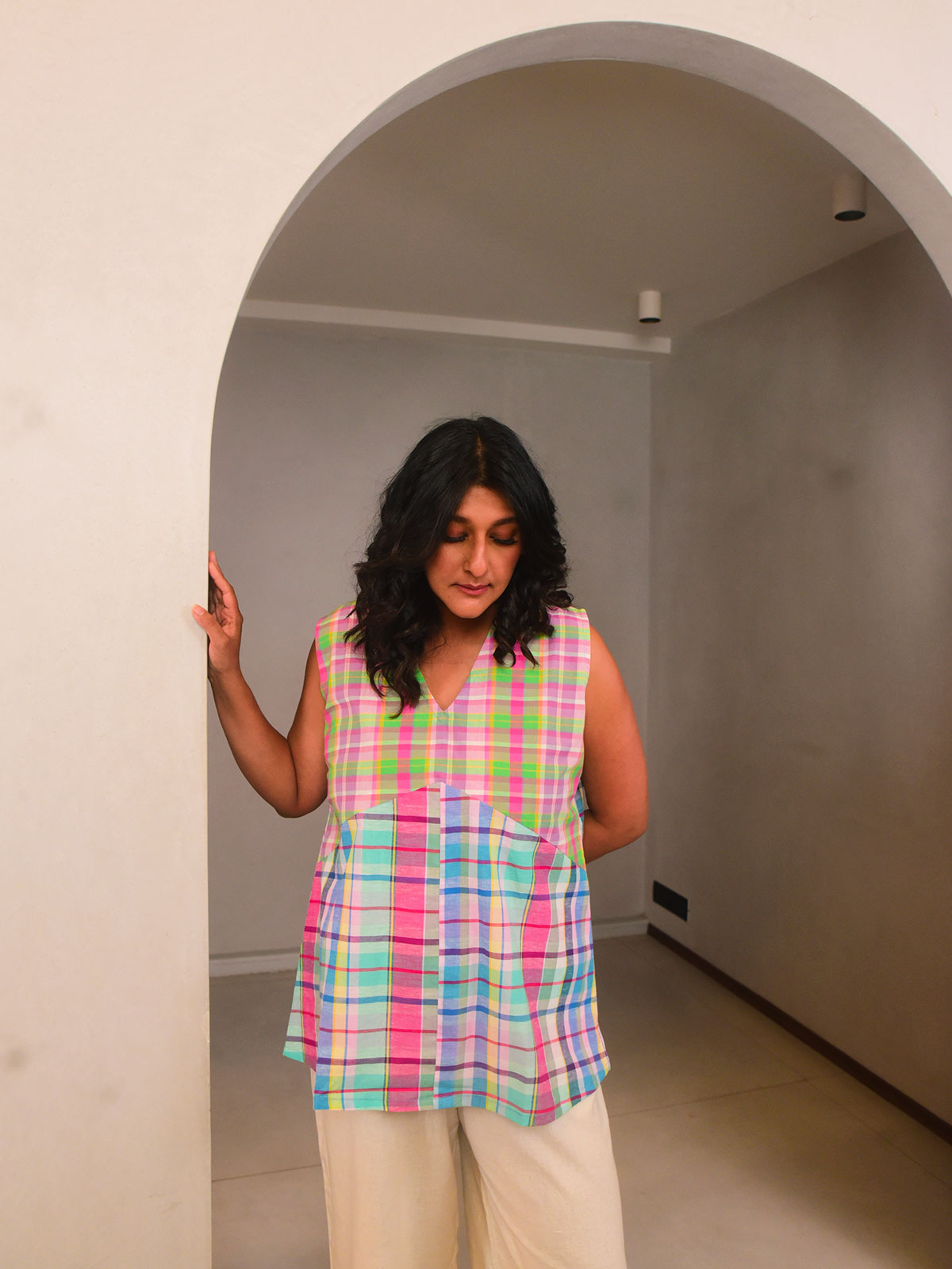 An easygoing summer staple, this sleeveless top features a playful mix of our exclusive pink and blue checkered cottons. Designed with subtle paneling for shape and ease, its relaxed silhouette makes it endlessly versatile. Pair it with trousers, denims, or shorts for a cheerful, laid-back look.