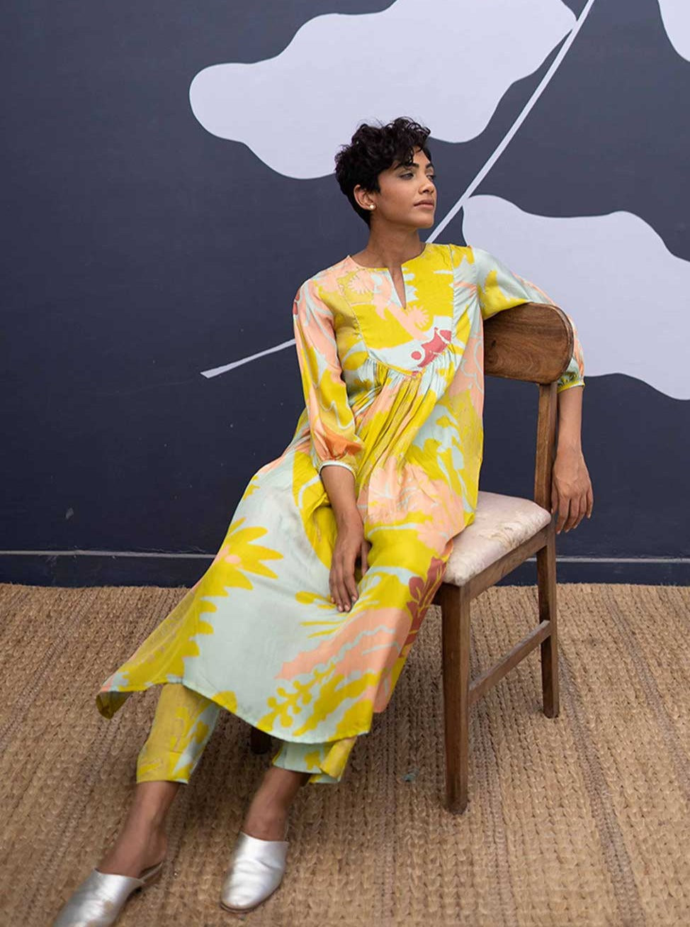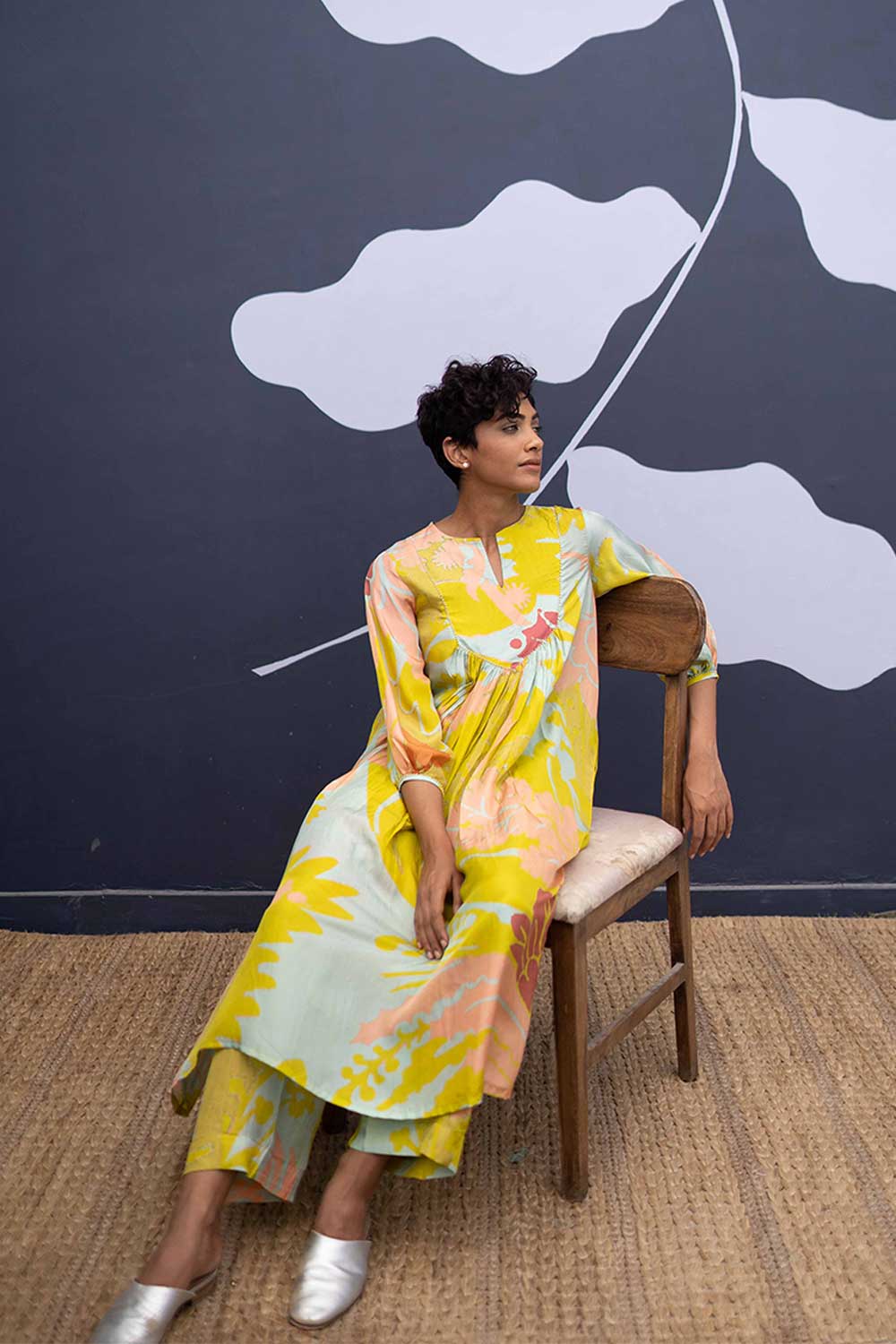 For some daytime drama, Madura set is hand-painted and printed in an elegant pastel palette. Light enough for hot July days, this set is perfect for your summer soiree.