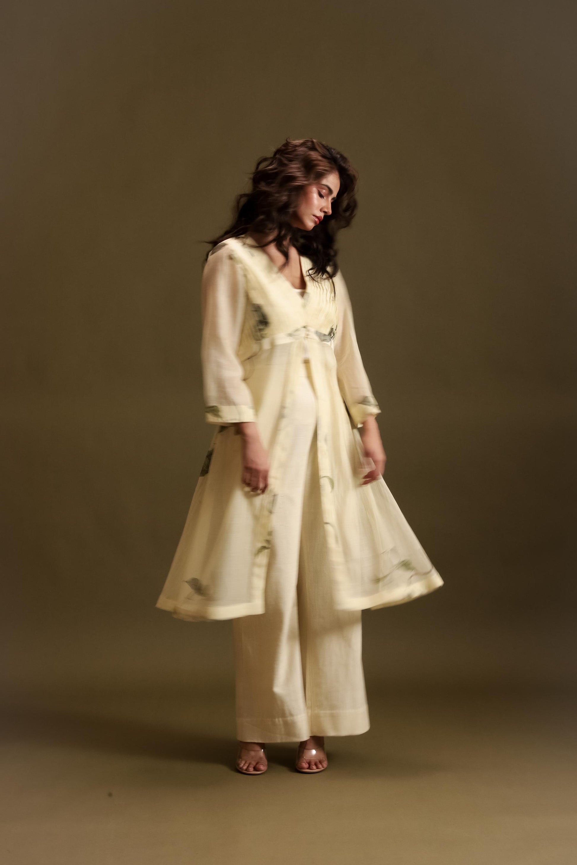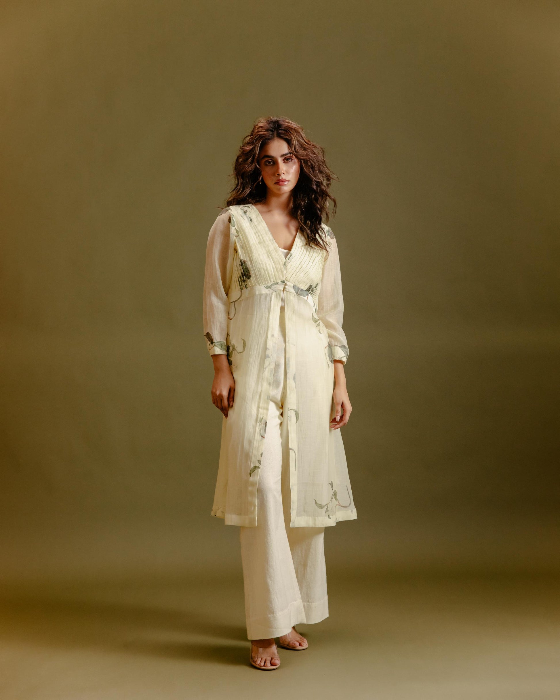 Chanderi pleated front open jacket with slip inside and khadi flared pants
