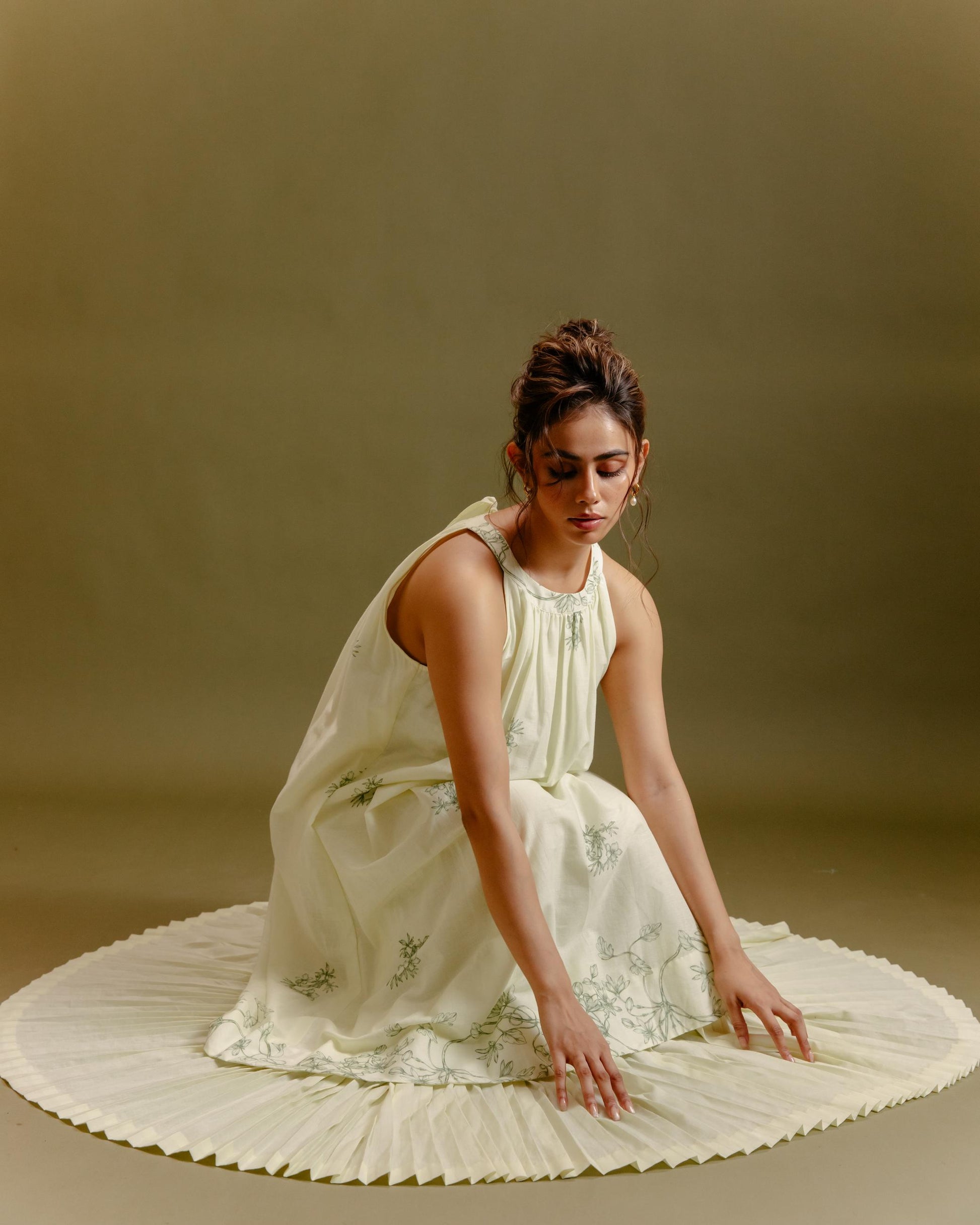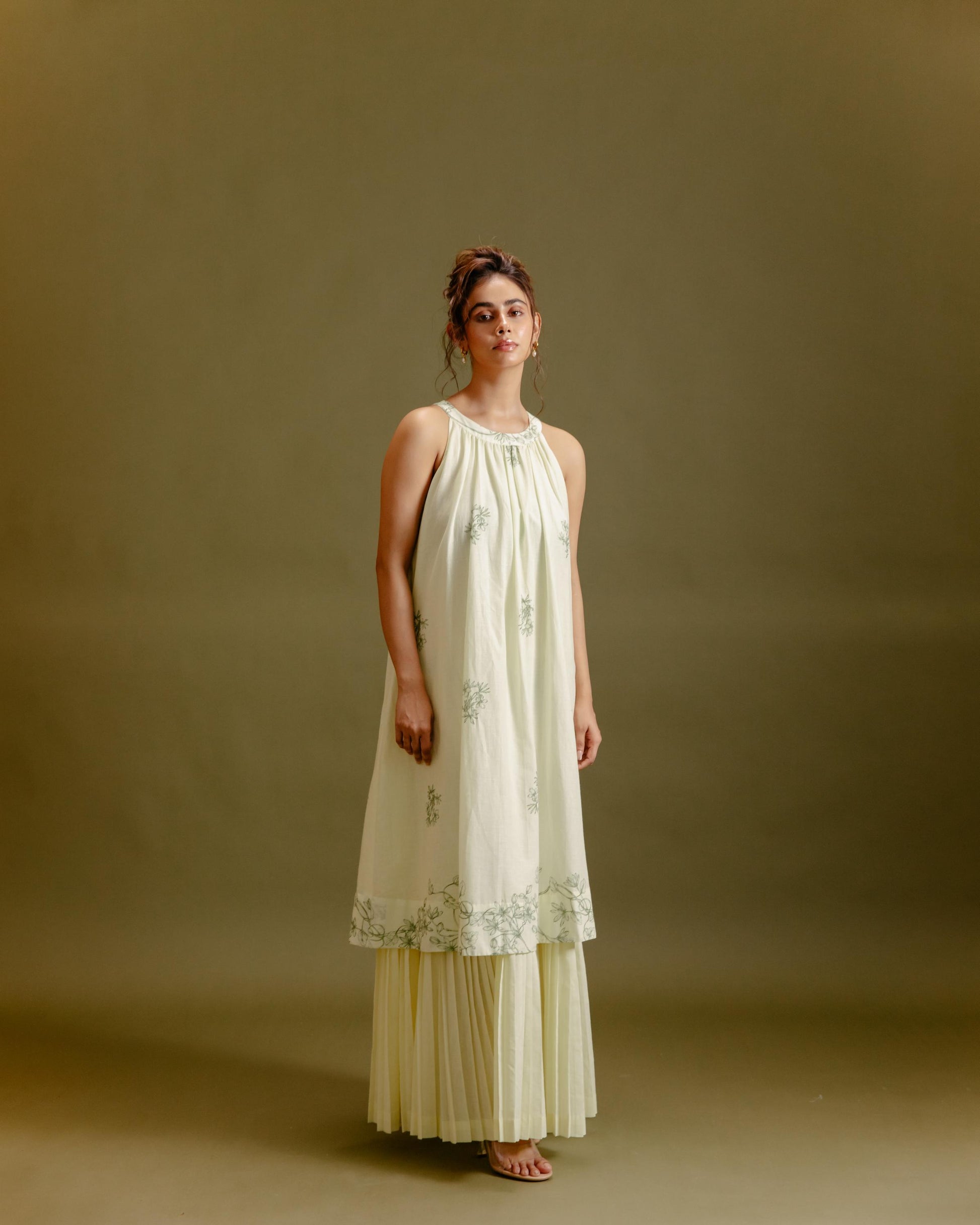 Printed two layer mal mal dress with halter neck and tie up detail at back. Bottom layer completely hand pleated