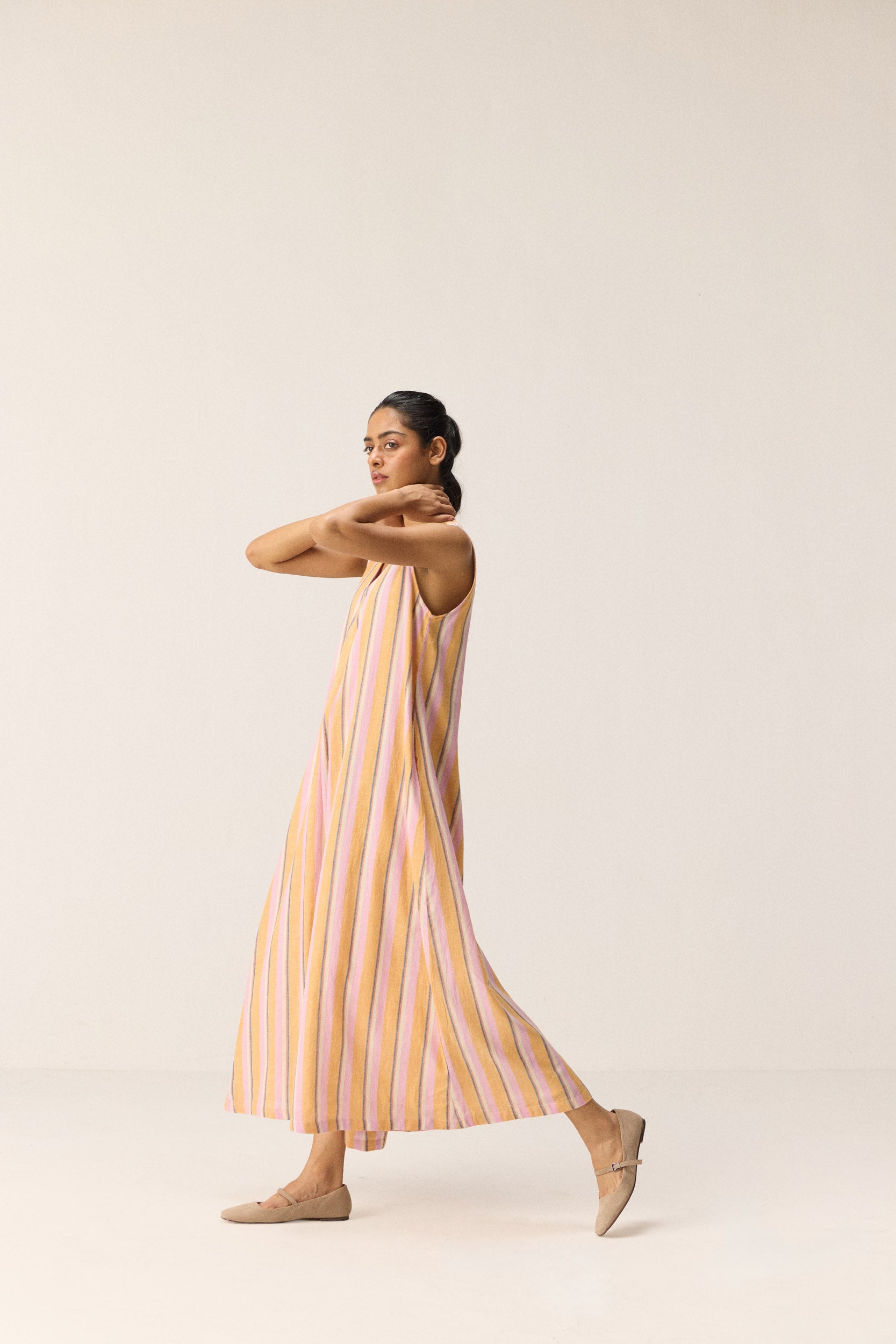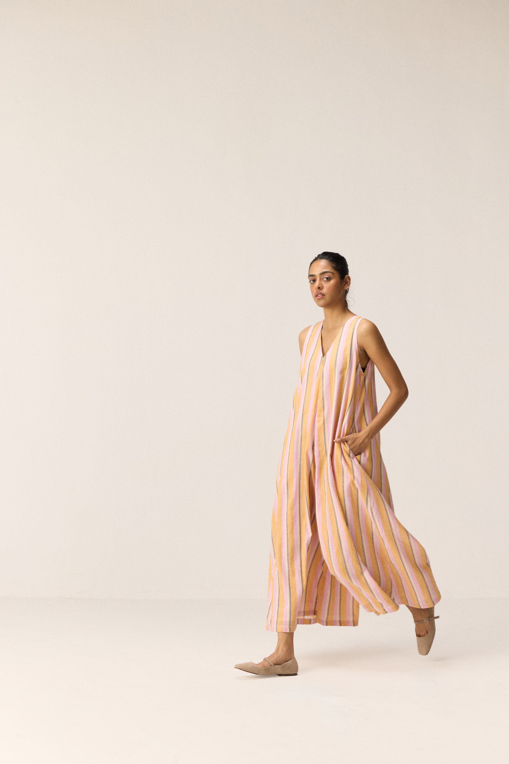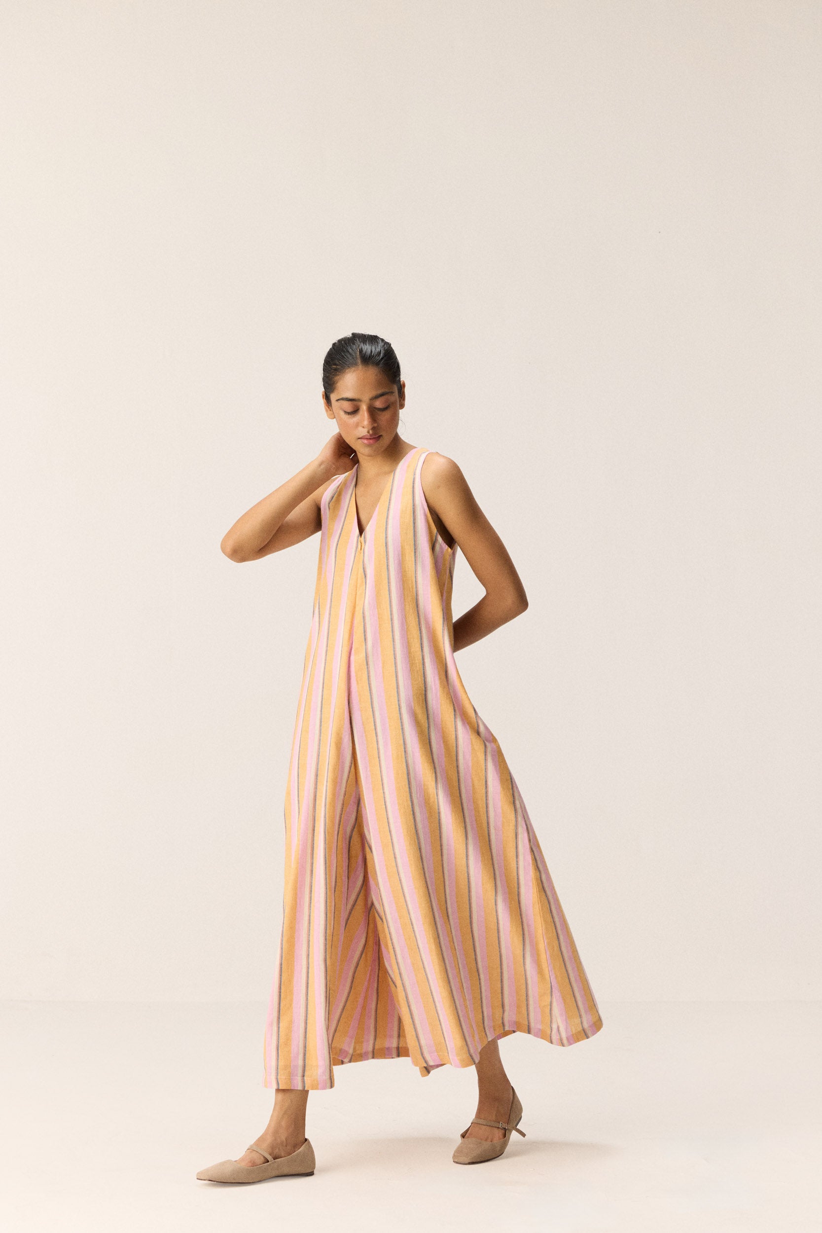 A timeless Khara Kapas silhouette, this jumpsuit features vibrant pink, orange, and white stripes that bring a fresh, playful energy. Designed with a front zipper and practical pockets, it balances classic style with everyday ease—perfectly versatile for any season.