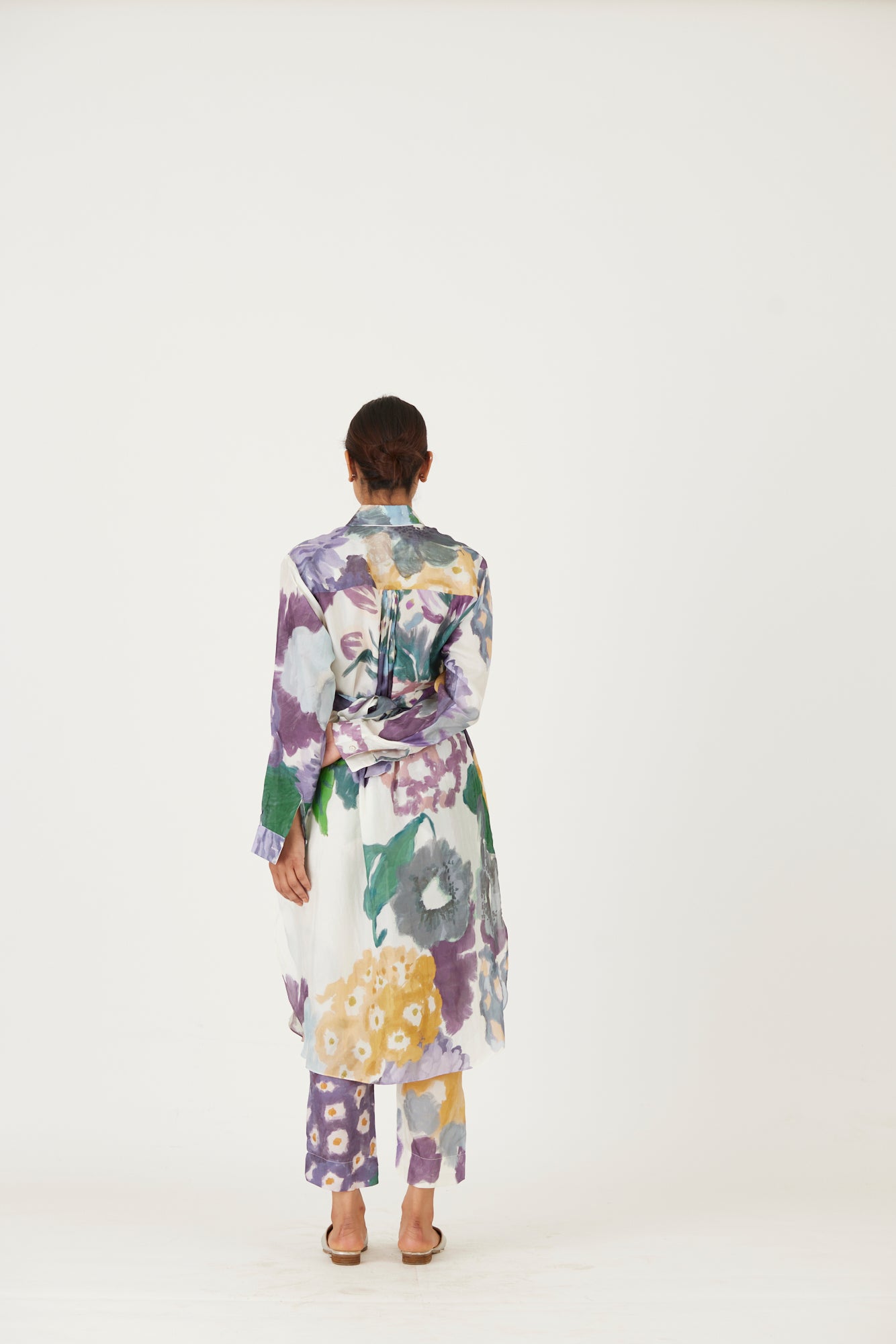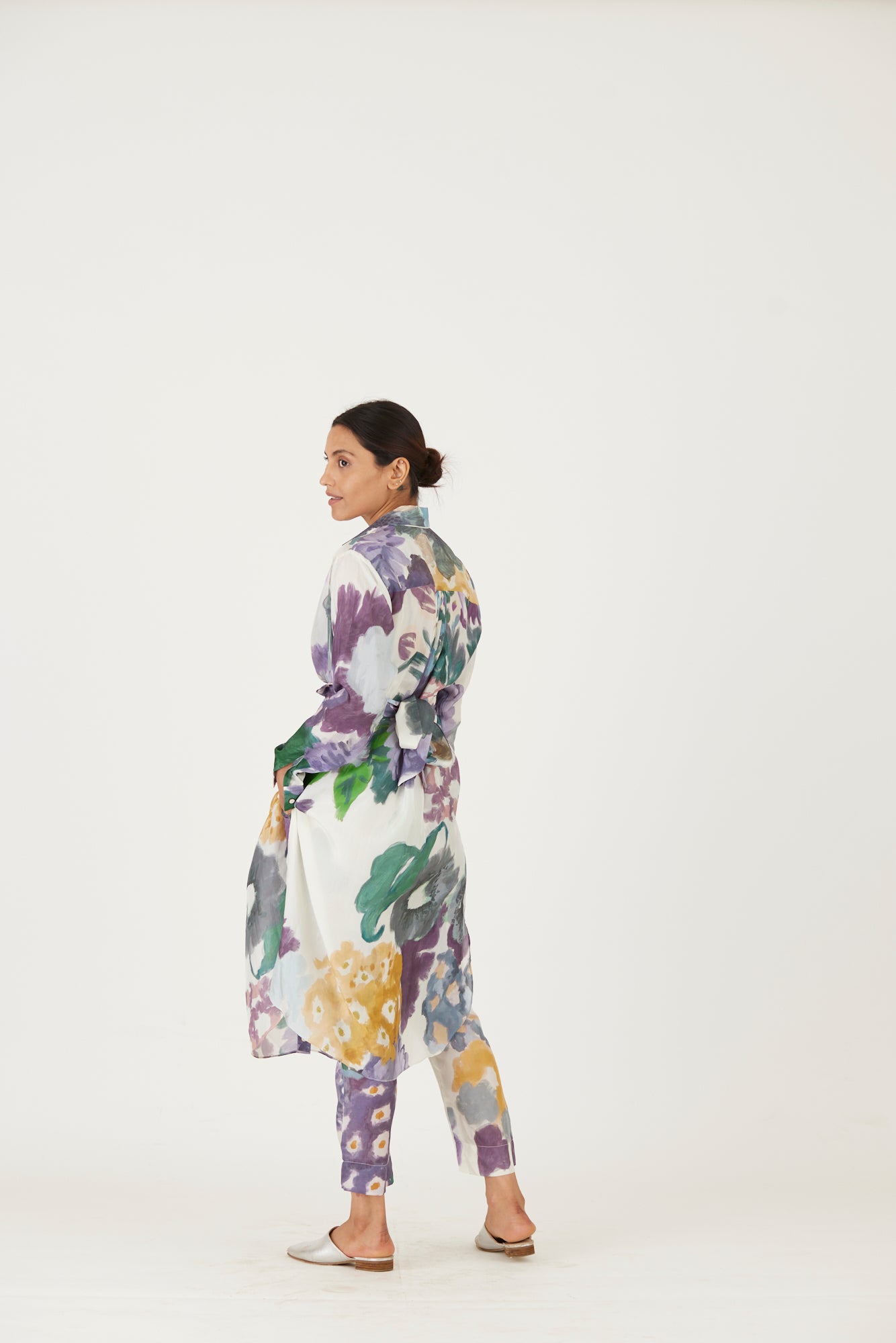 The set includes a wrap shirt kurta and pants with drawstring front and back elastic.