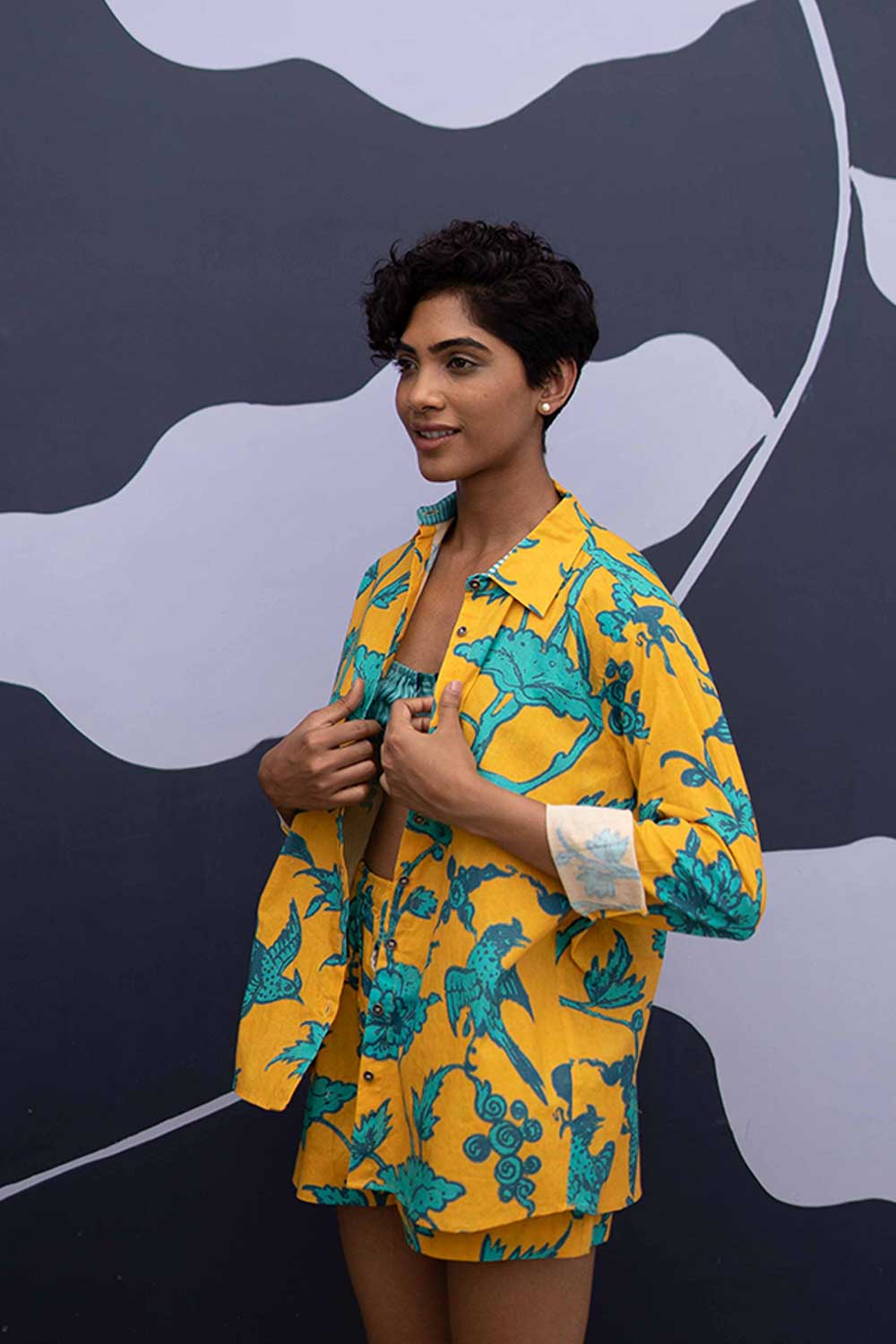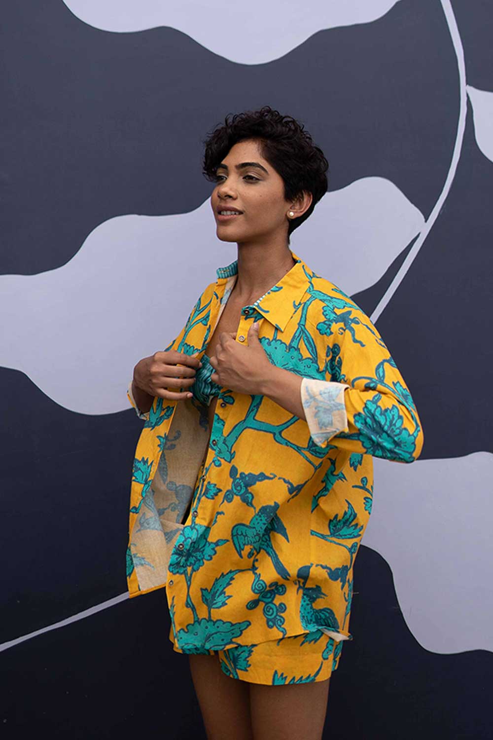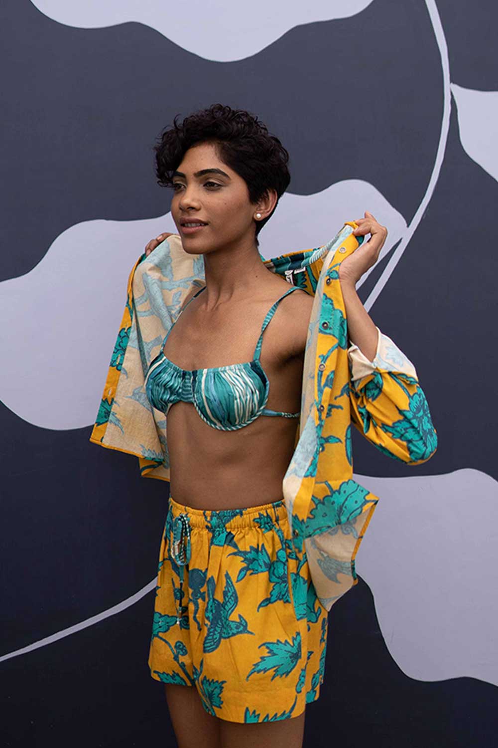 The maui shorts and shirt co-ord set is printed in pure cotton in a powder blue base .