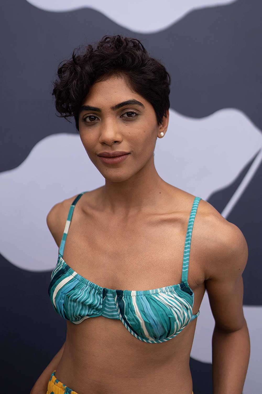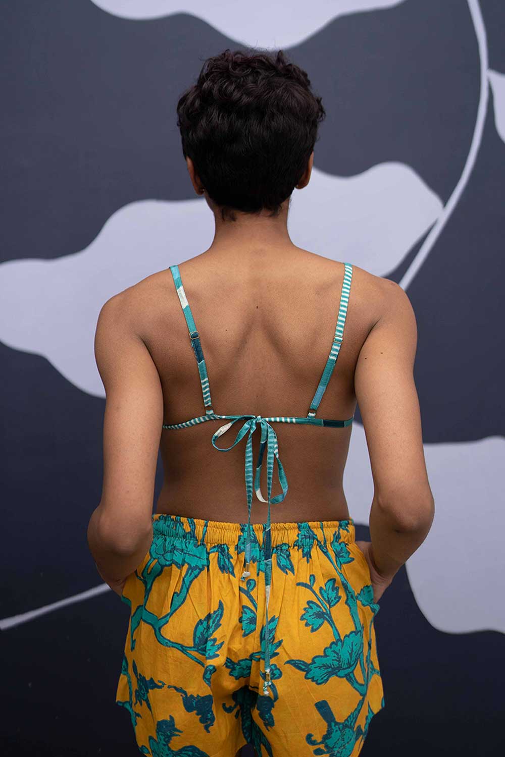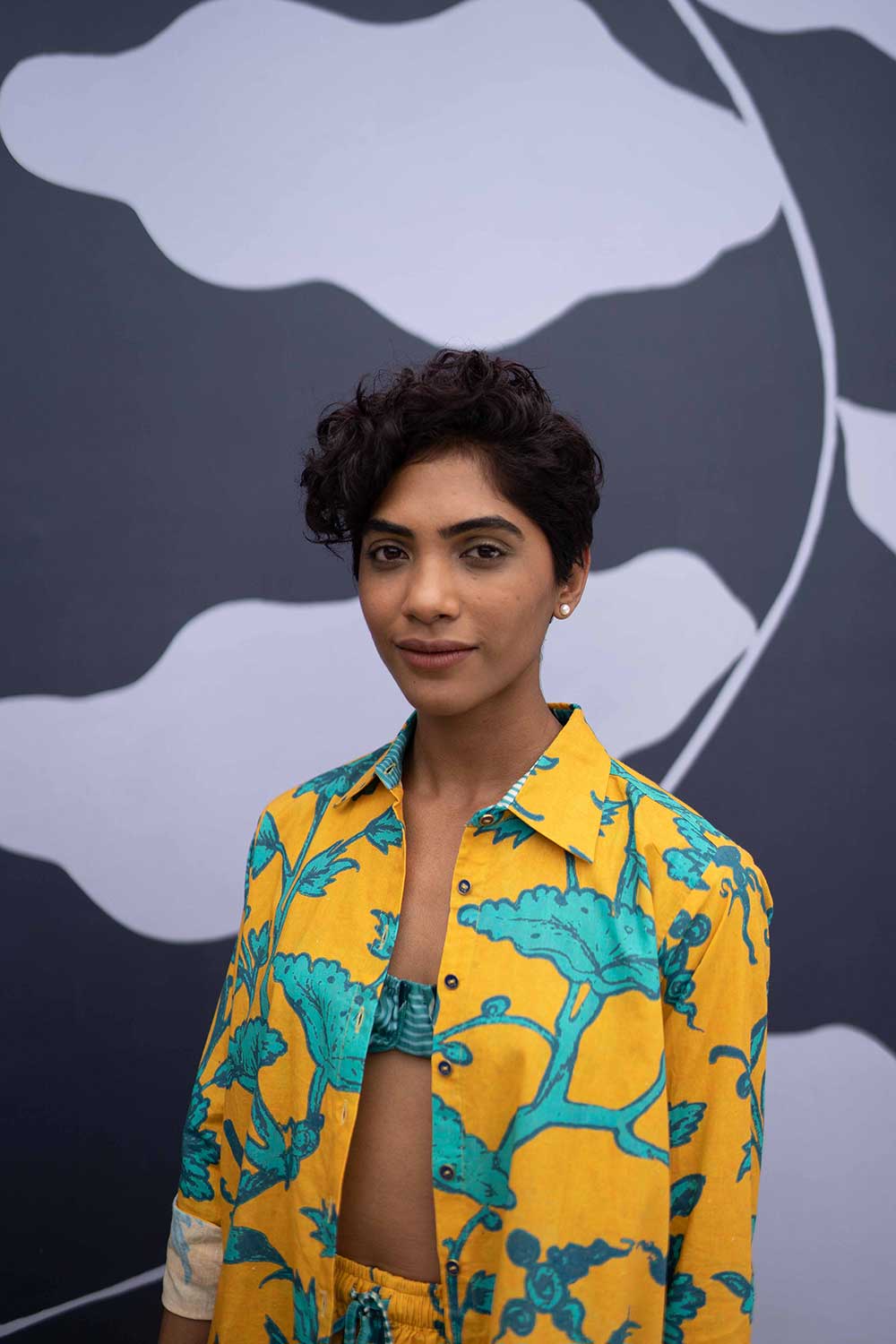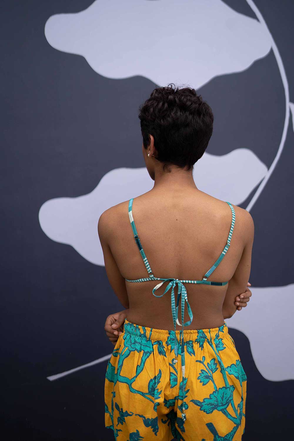 The maui shorts and shirt co-ord set is printed in pure cotton in a powder blue base .