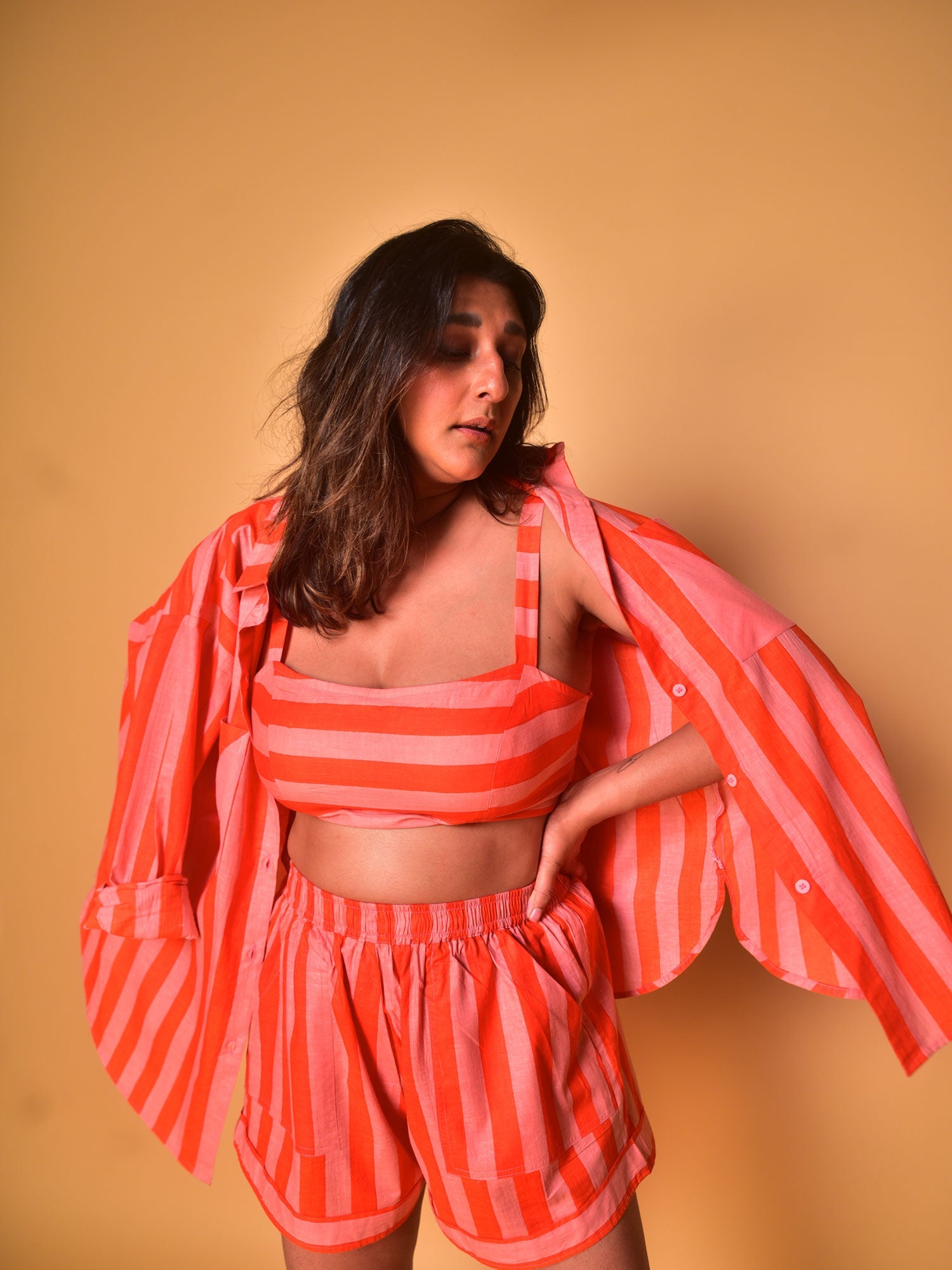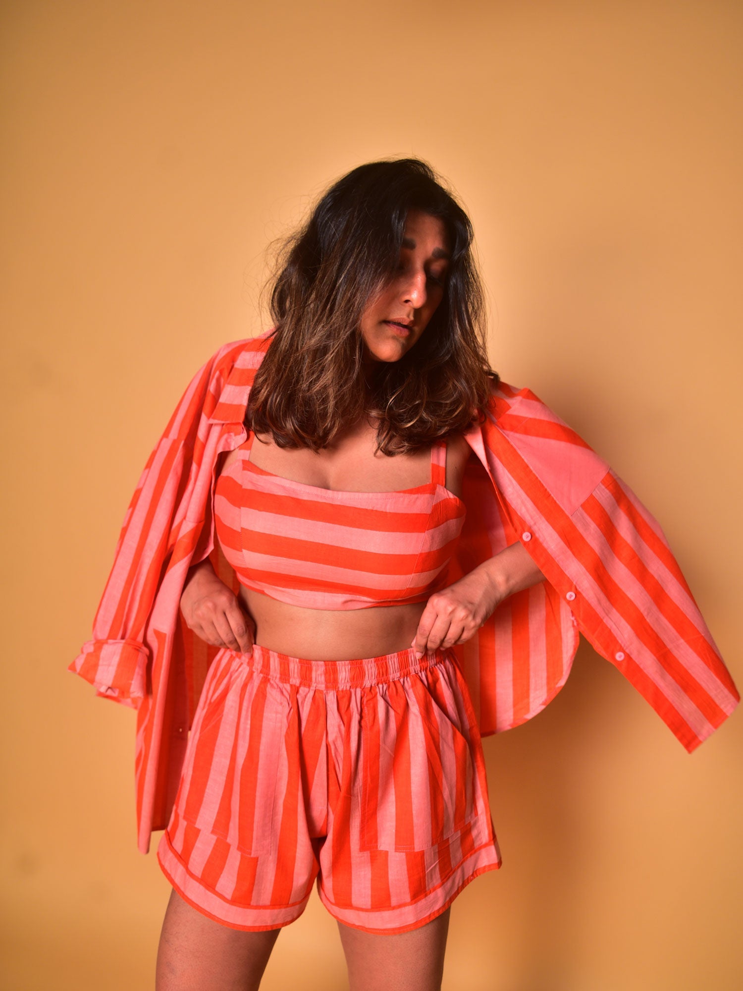 This chic printed bralette is made for road trips and beaches. Cut in our exclusive orange and peach striped cotton, with thin straps and an elasticated smocking back to fit comfortably. Pair with our May Shorts for the co-ord look, and layer with our May Shirt.