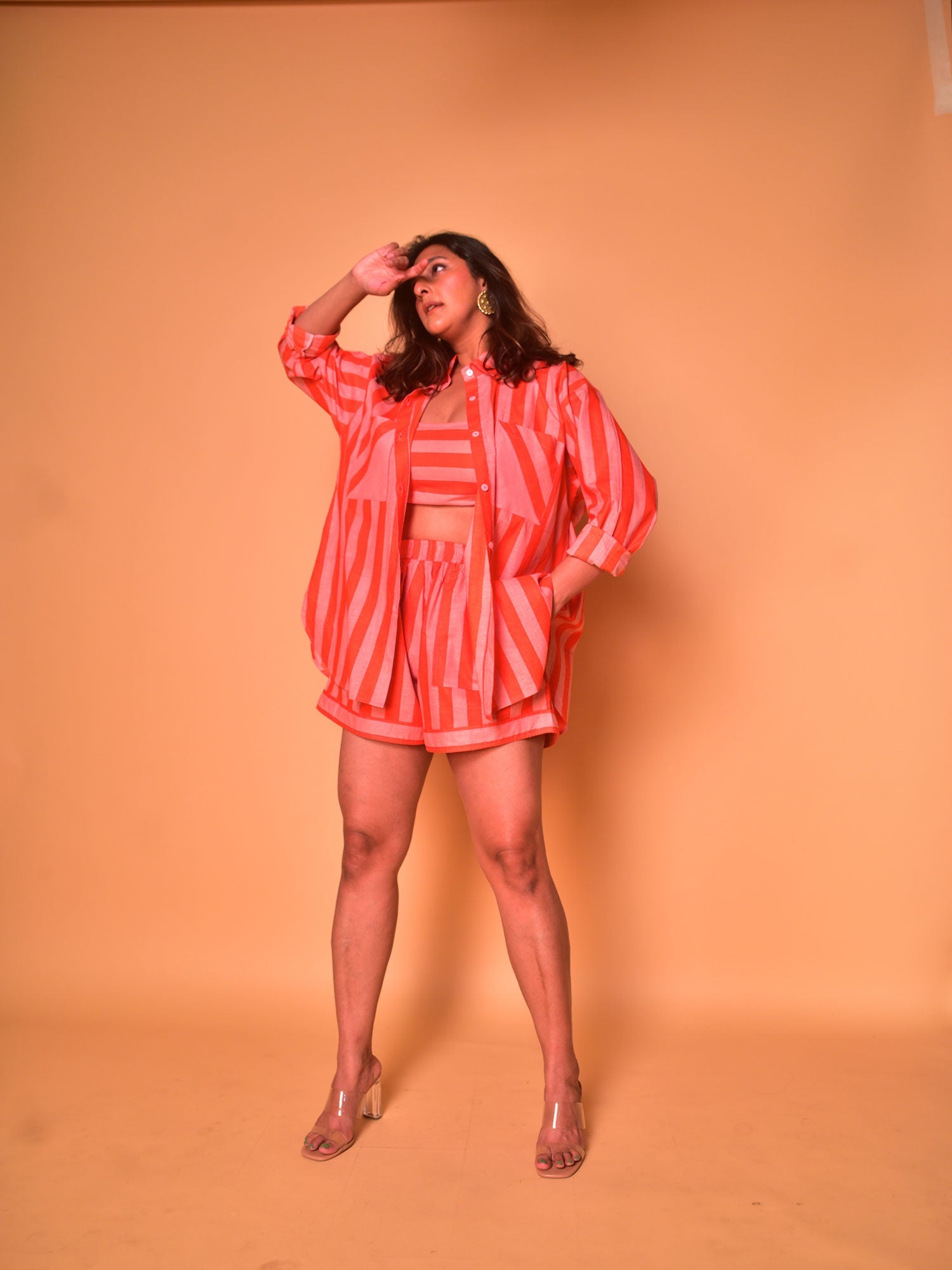 Lounge for days in this effortlessly-chic co-ord set! Cut in our exclusive orange and peach striped cotton, this oversized statement shirt has self-printed pockets with peach highlights. Paired with eclectic shorts made for comfort, with an elasticated waist and pockets on both sides. Throw in our May Bralette cut in the same print for the a head-turning summer look.