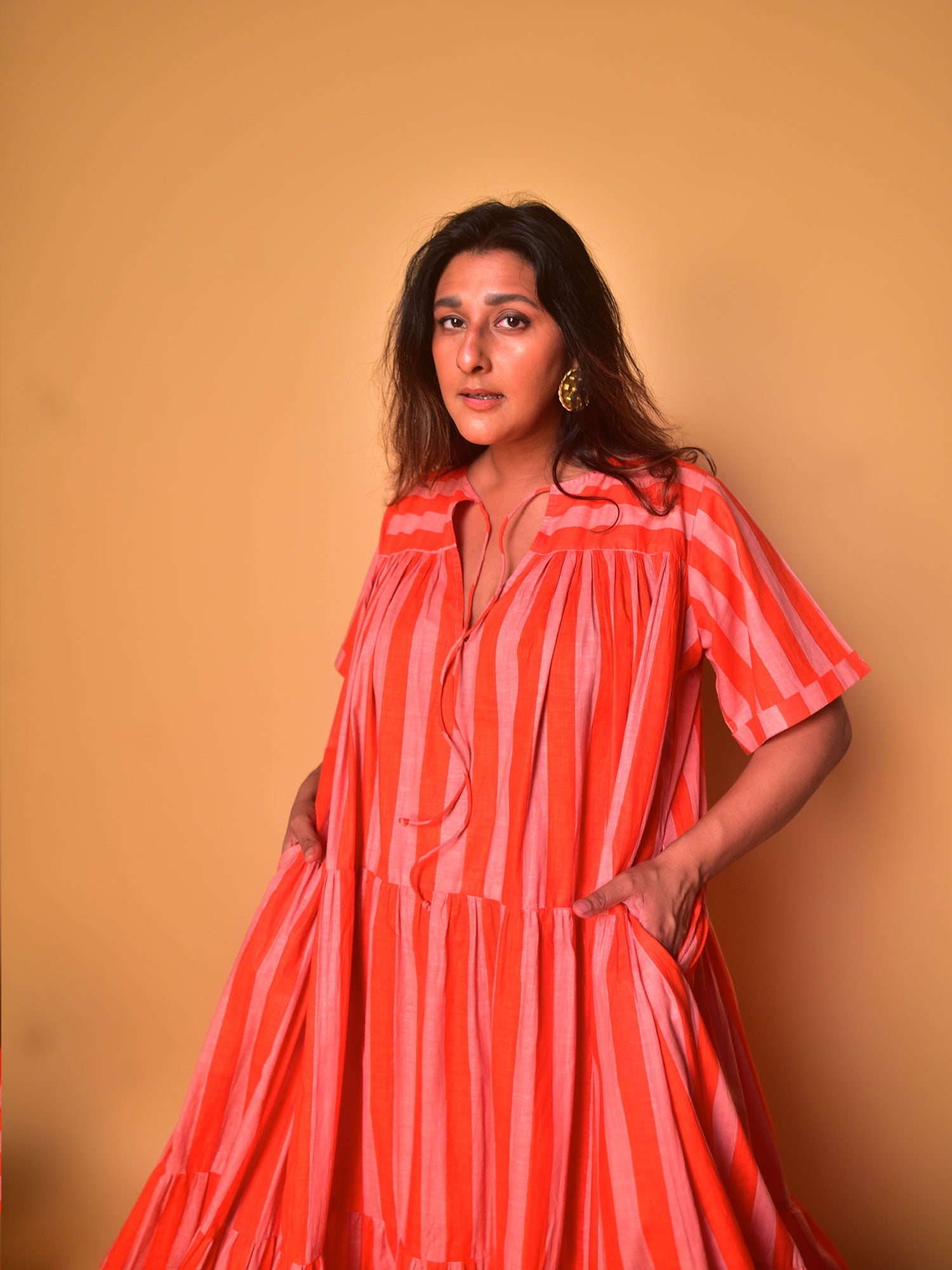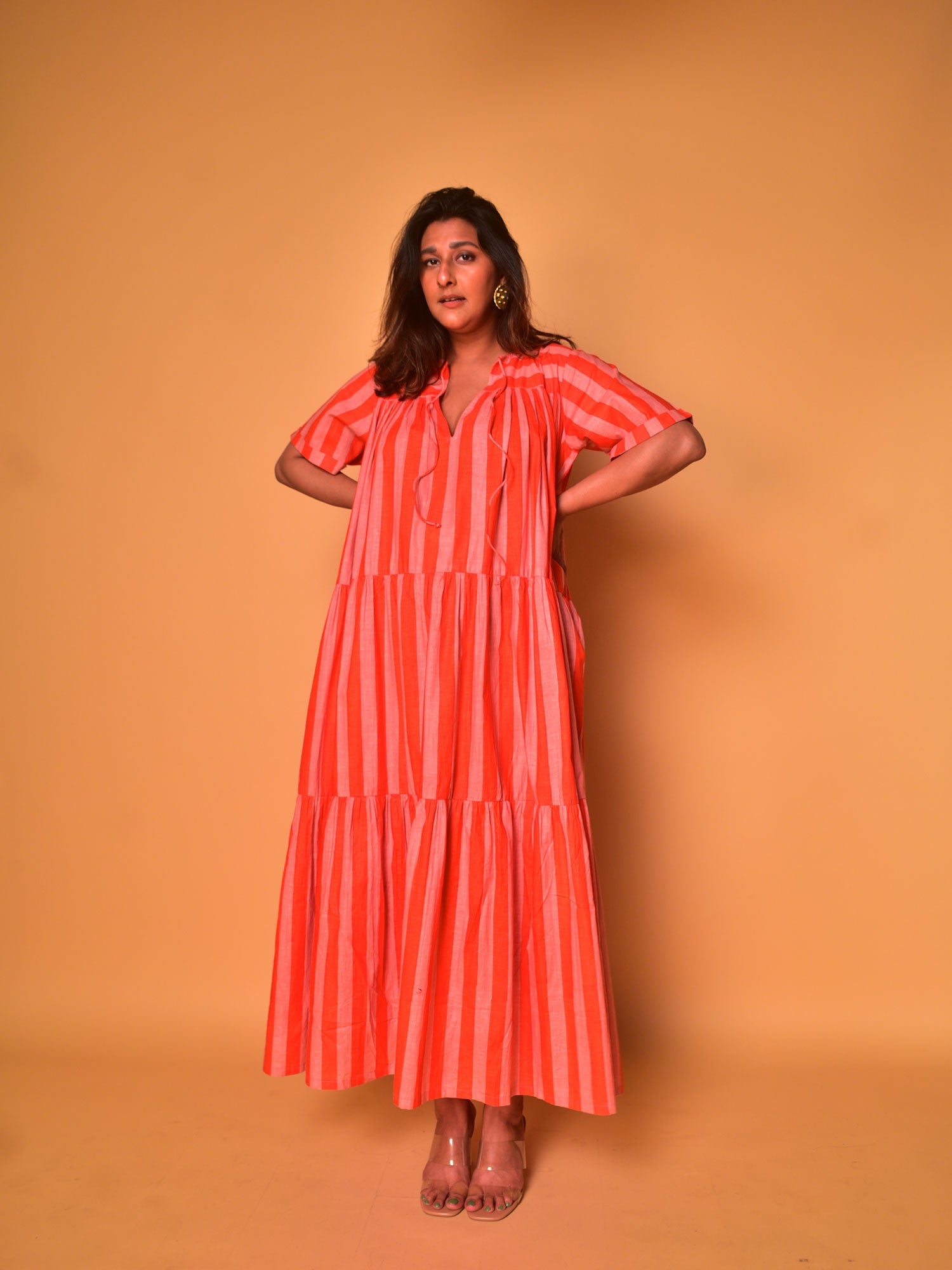 Long, ruffled and loose, this dress is made for lazy Sundays. Cut in our exclusive orange and peach striped cotton with short cuffed sleeves and ties at the neckline. The silhouette is tiered and flowy, with pockets on both sides. Pair with our May Tote for a lovely sunny picnic.