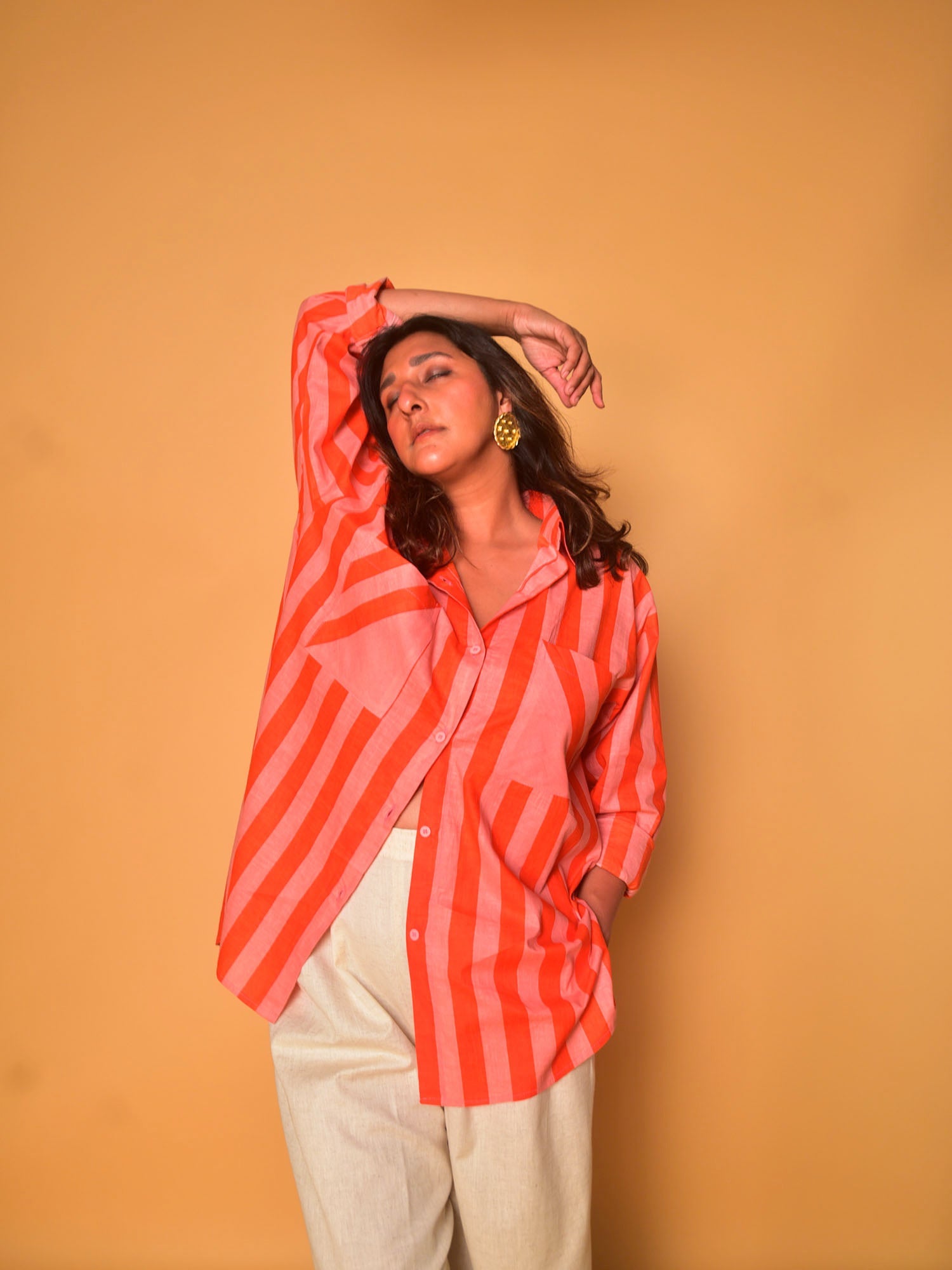 Cut in our exclusive orange and peach striped cotton, this oversized statement shirt has self-printed pockets with peach highlights. Pair it with our May Shorts for a lounge look, and pick the May Bralette for the perfect summer beach fit.