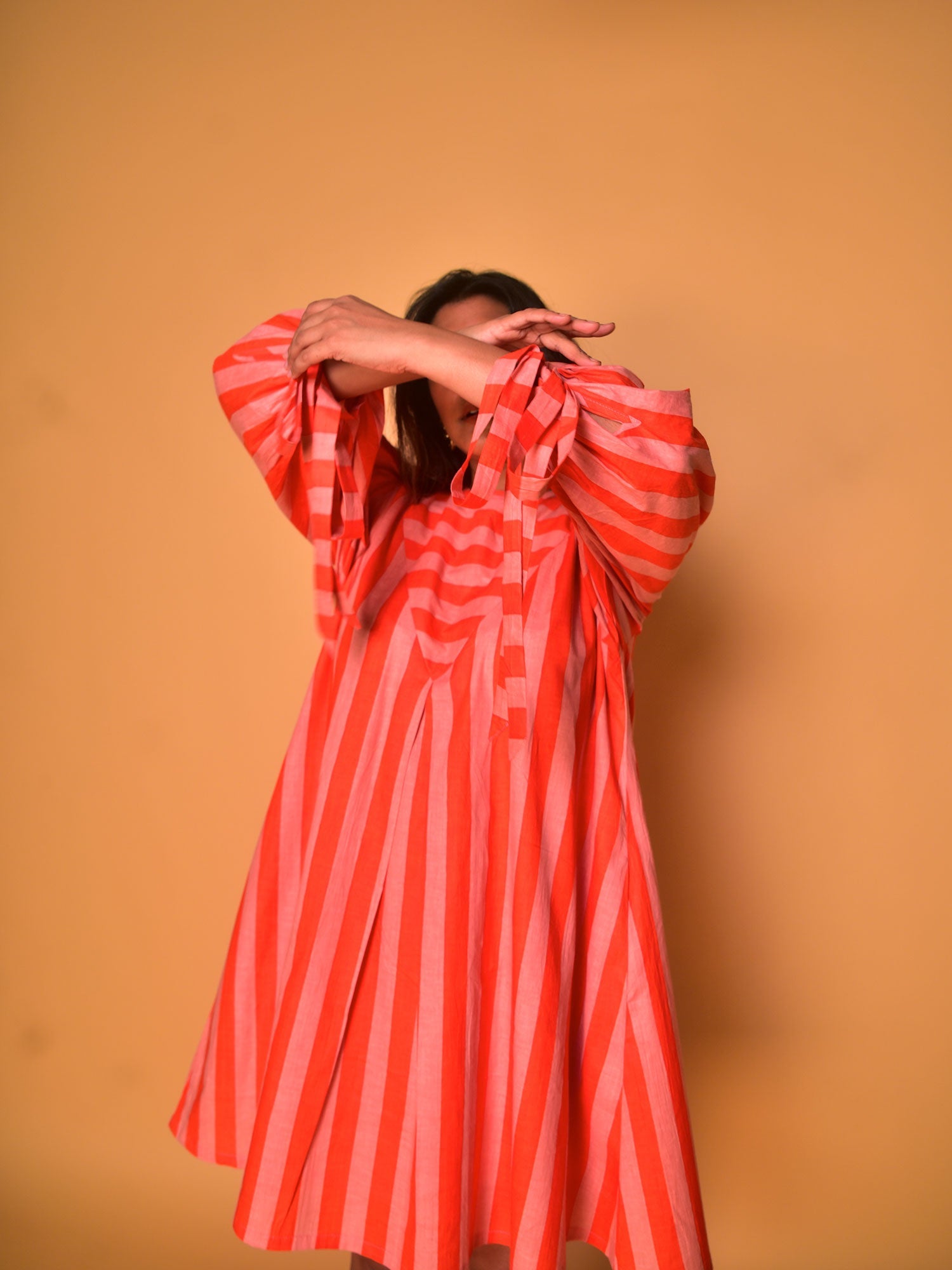 This short and cute antifit dress is breezy and comfy, made for sultry days out. Cut in our exclusive orange and peach striped cotton, with a contrast yoke and puffed sleeves ending in ties. The silhouette is flowy, with pockets on both sides. It has no zippers - just slip it on and be out the door! Pair with our May Tote for a lovely sunny picnic.