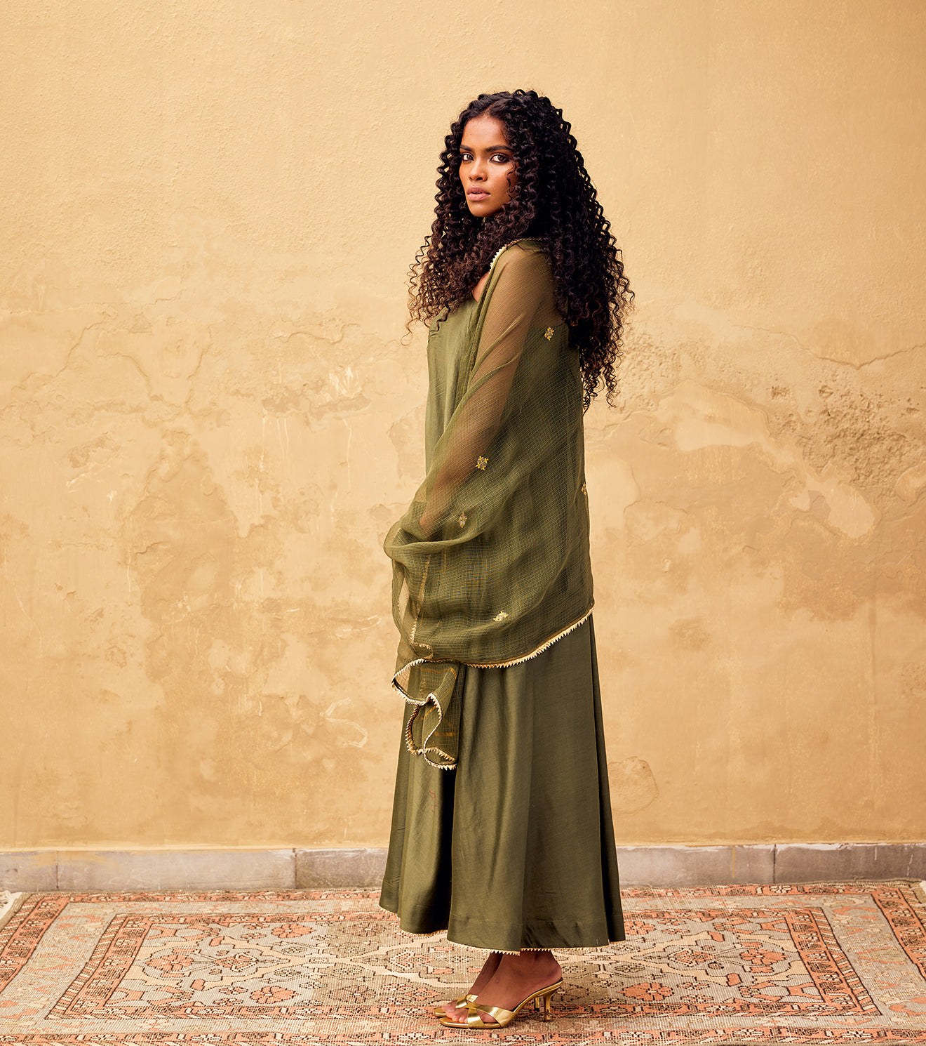 An embroidered Kota doria dupatta composed in cotton and embellished with gota lace.