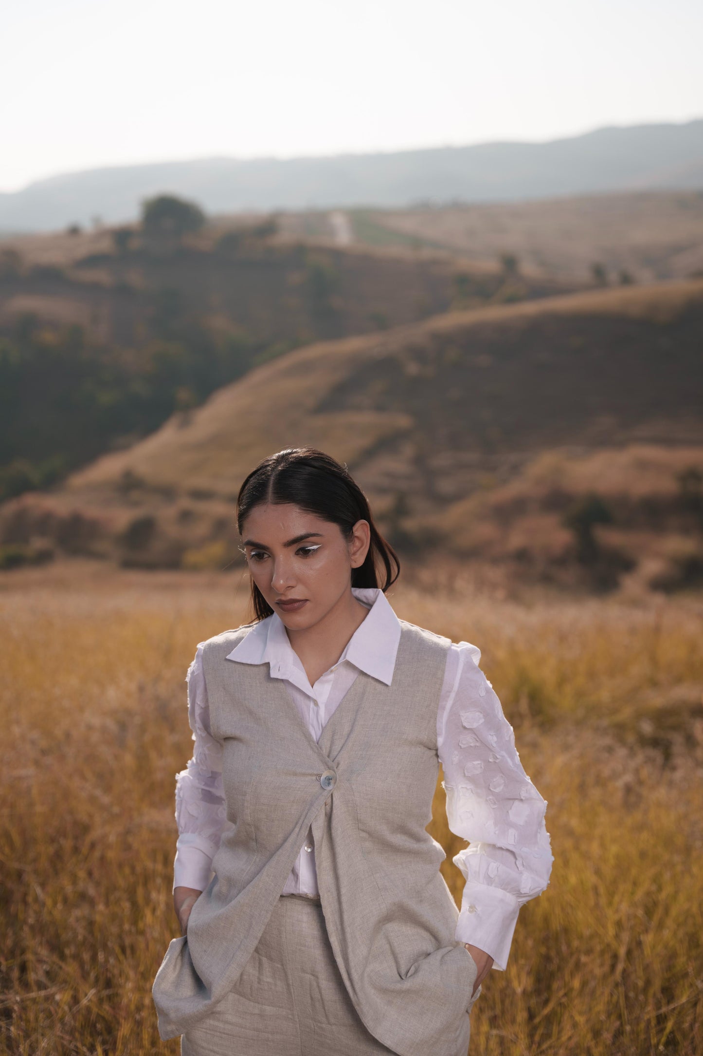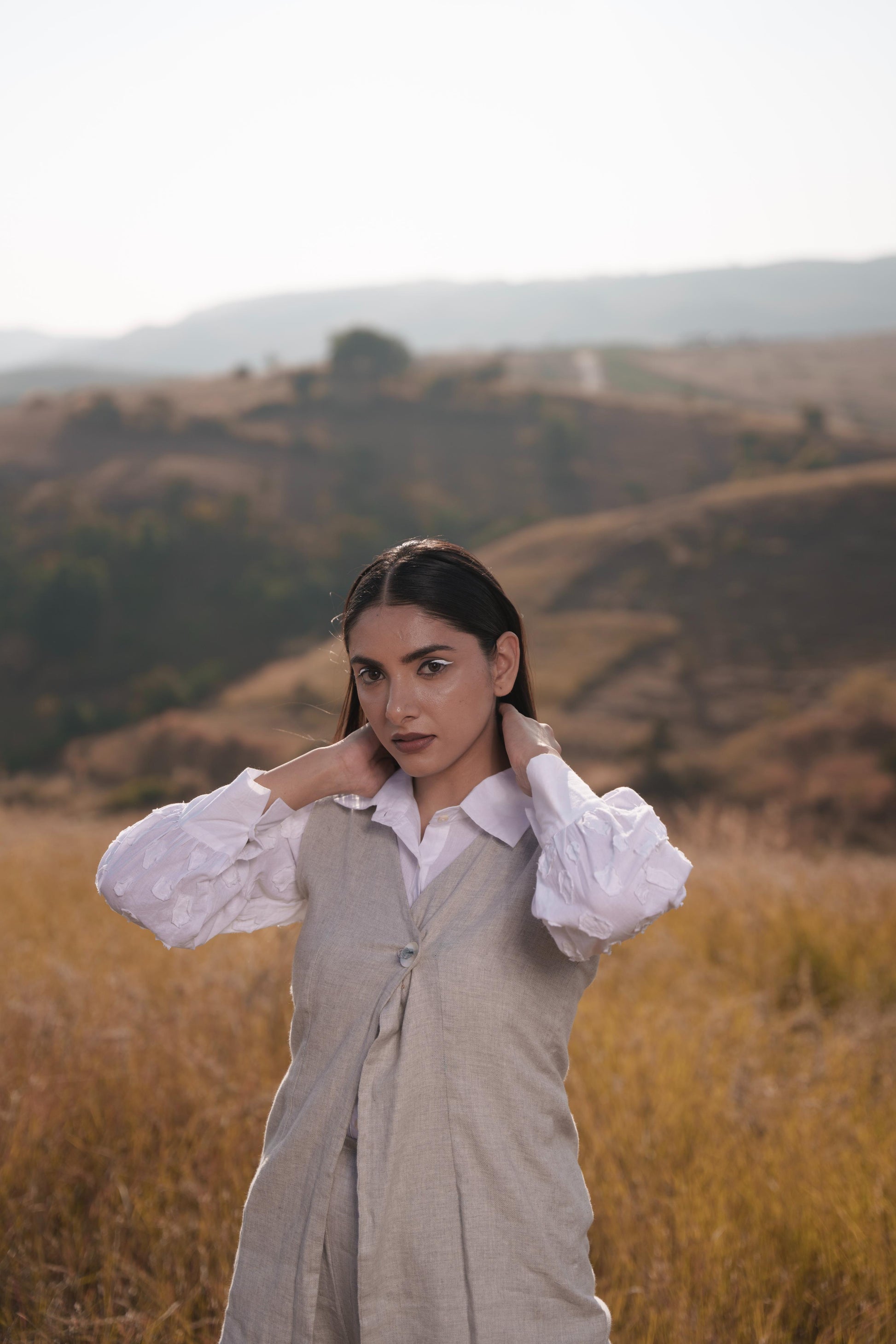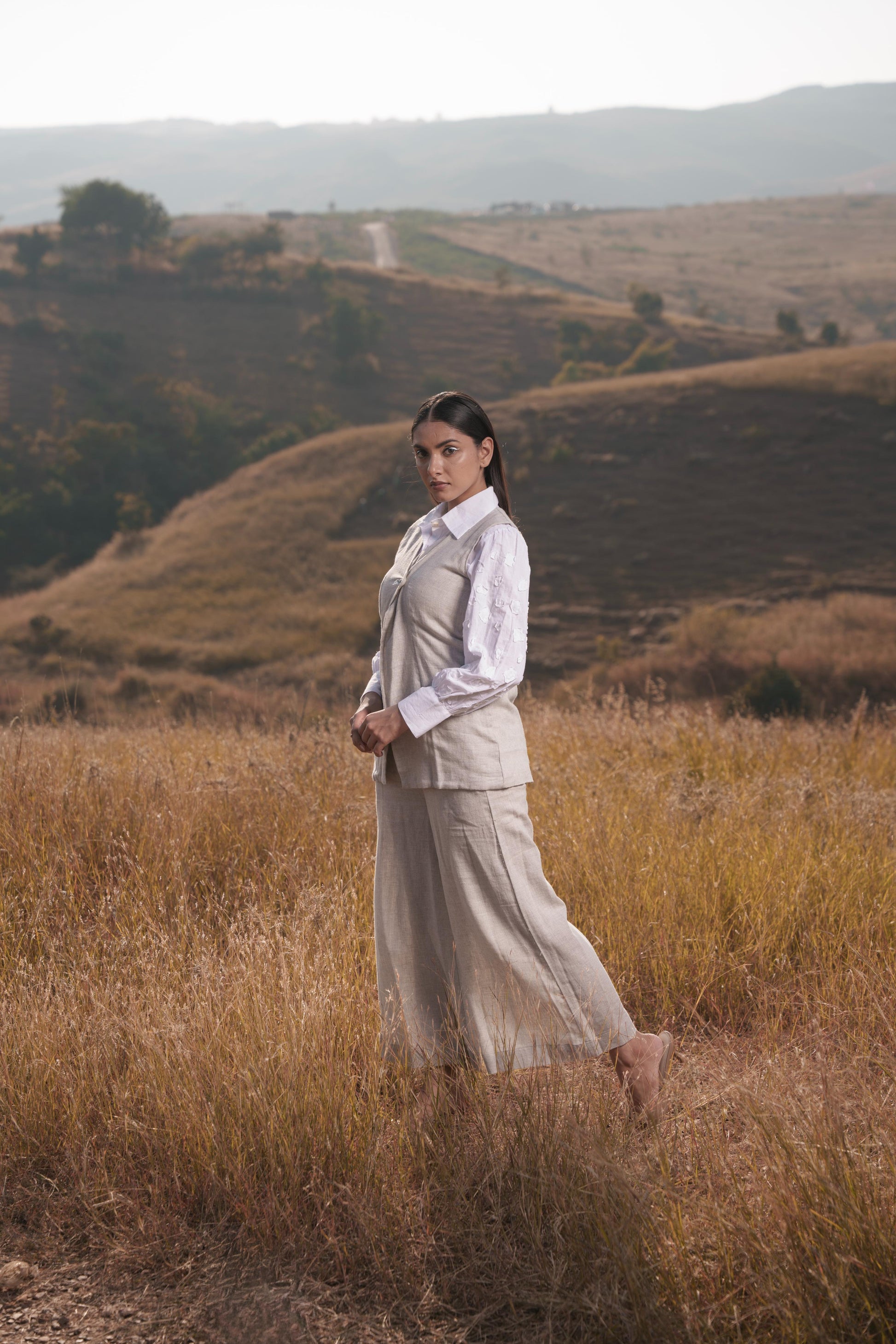 The skirt incorporates pin tucks and a printed border, creating a dynamic texture and visual interest. A waist belt is attached to the set, offering versatility and allowing for a personalized fit that accentuates the waistline.