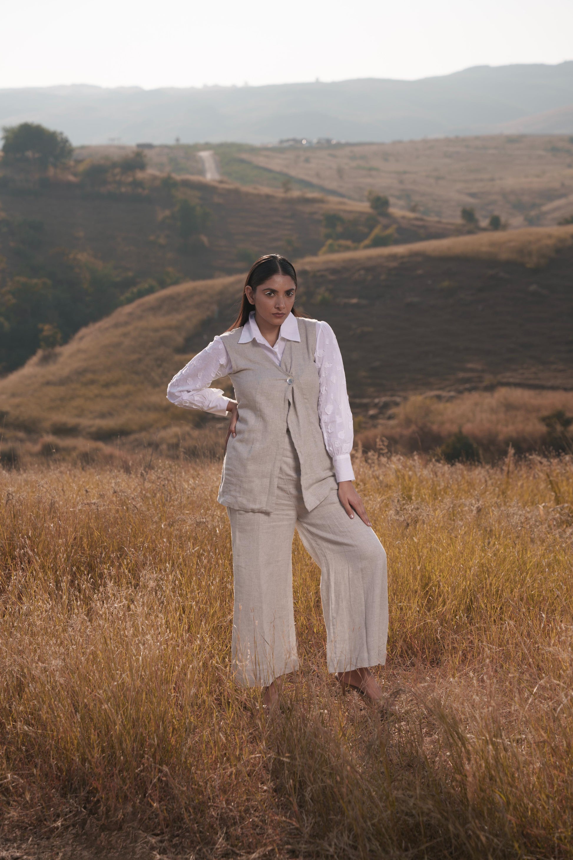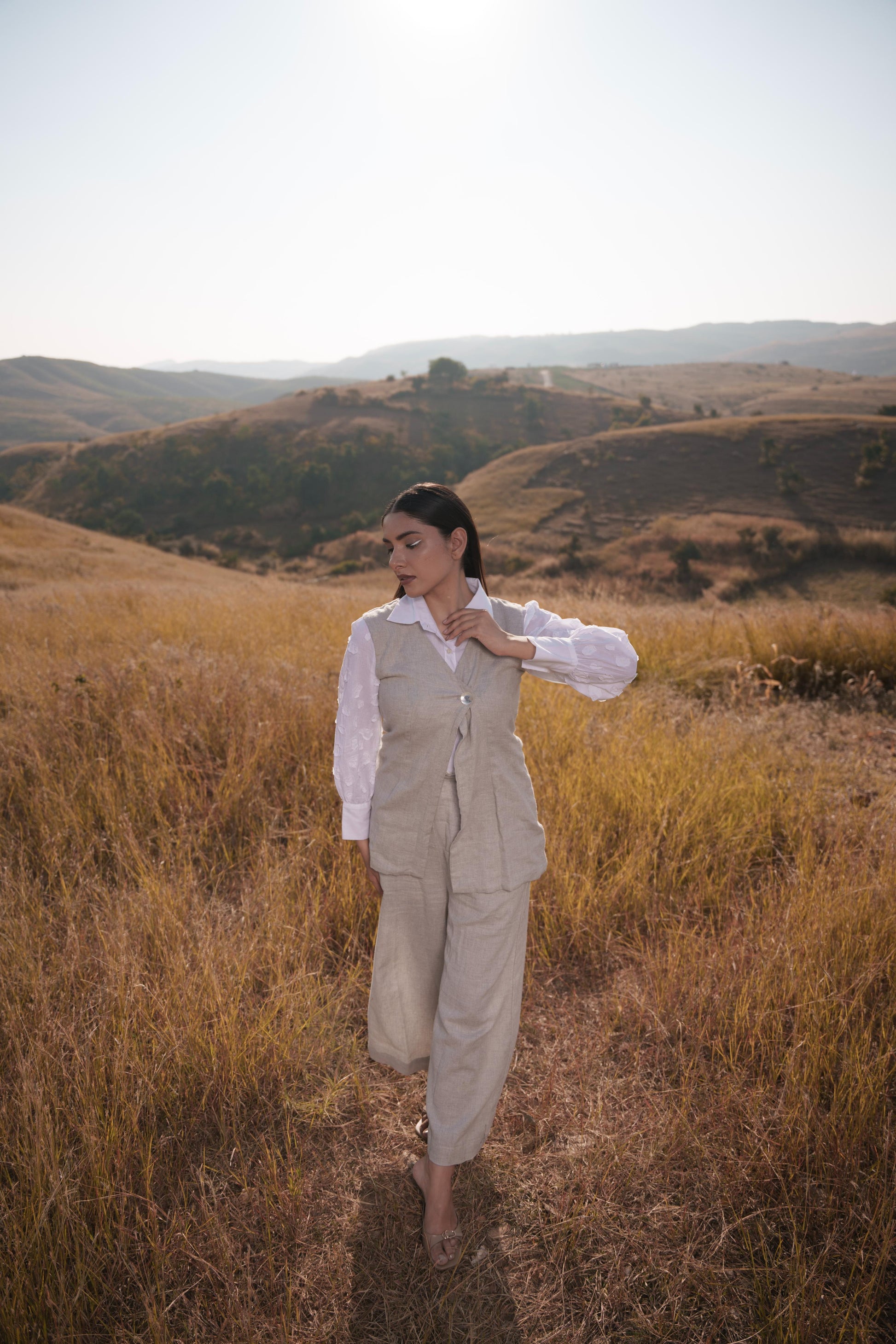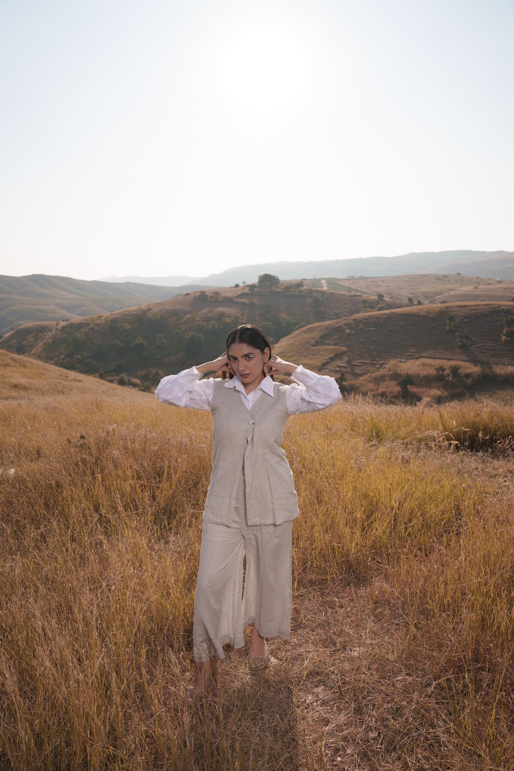 The skirt incorporates pin tucks and a printed border, creating a dynamic texture and visual interest. A waist belt is attached to the set, offering versatility and allowing for a personalized fit that accentuates the waistline.