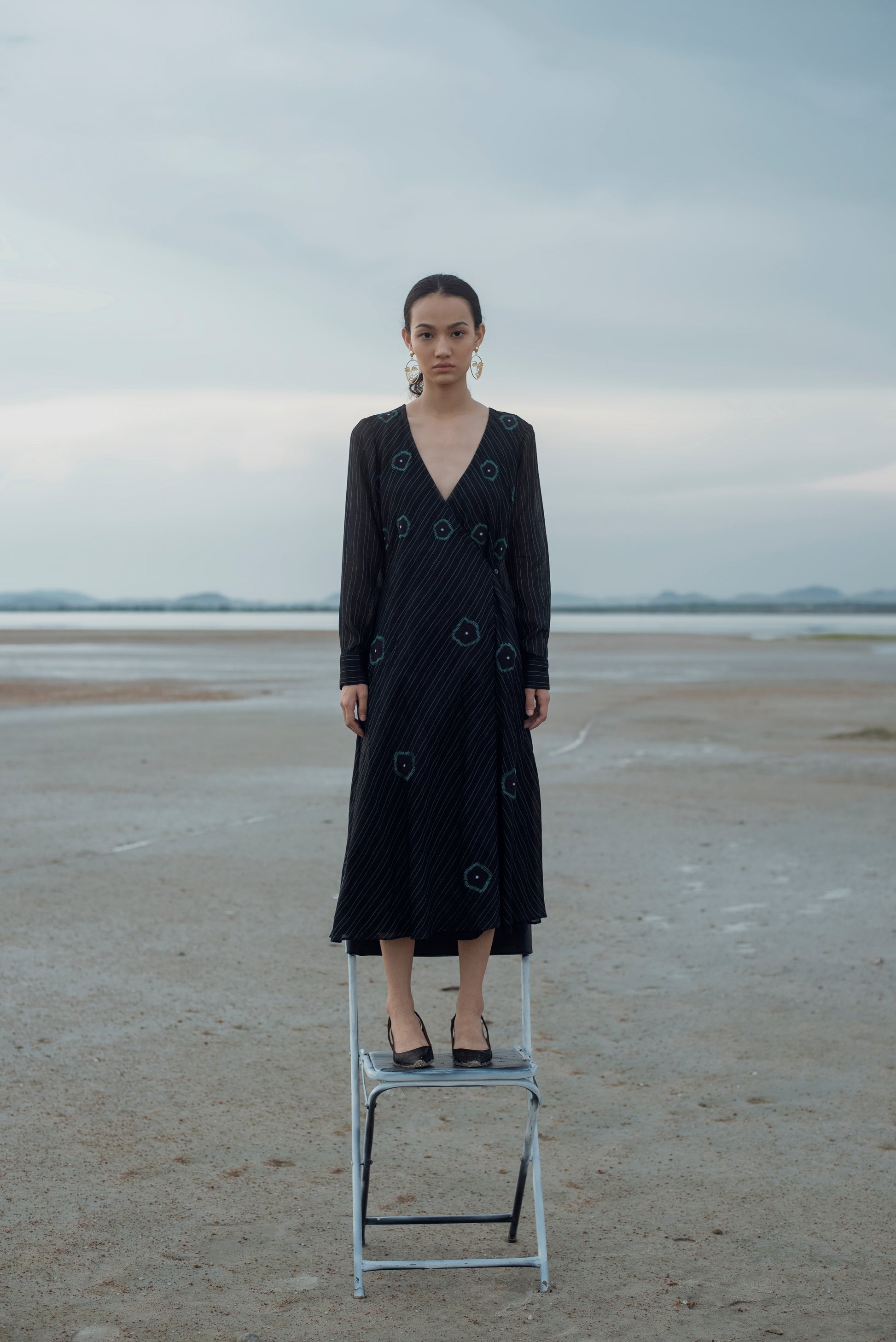 This is a classic wrap silhouette dress made in pure silk fabric handwoven in Banaras. It has striped details all over in the weave. It’s an overlap dress with deep v neck and basic sleeves with a cuff. It has intricately handcrafted applique and hand embroidery all over the dress in abstract motifs. This collection is an assorted range of textiles & handspun fabrics sourced from Banaras, Islampur, Murshidabad & quaint villages of India. The inspiration for the embellishments & embroideries has been derived from the artist Huguette Caland and her work over the years. Intricate crafts like sujani & kantha are the key embroidery techniques been used.