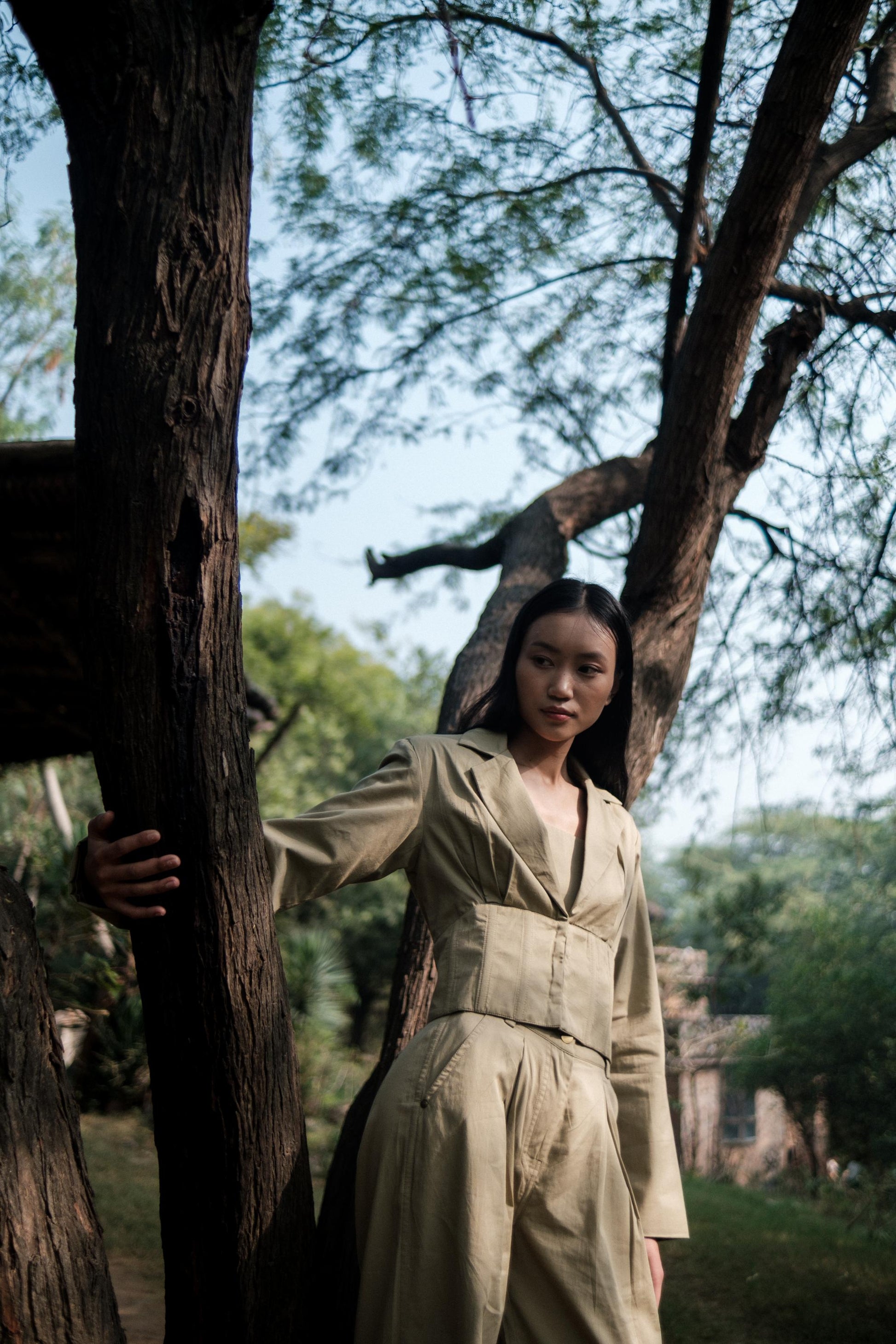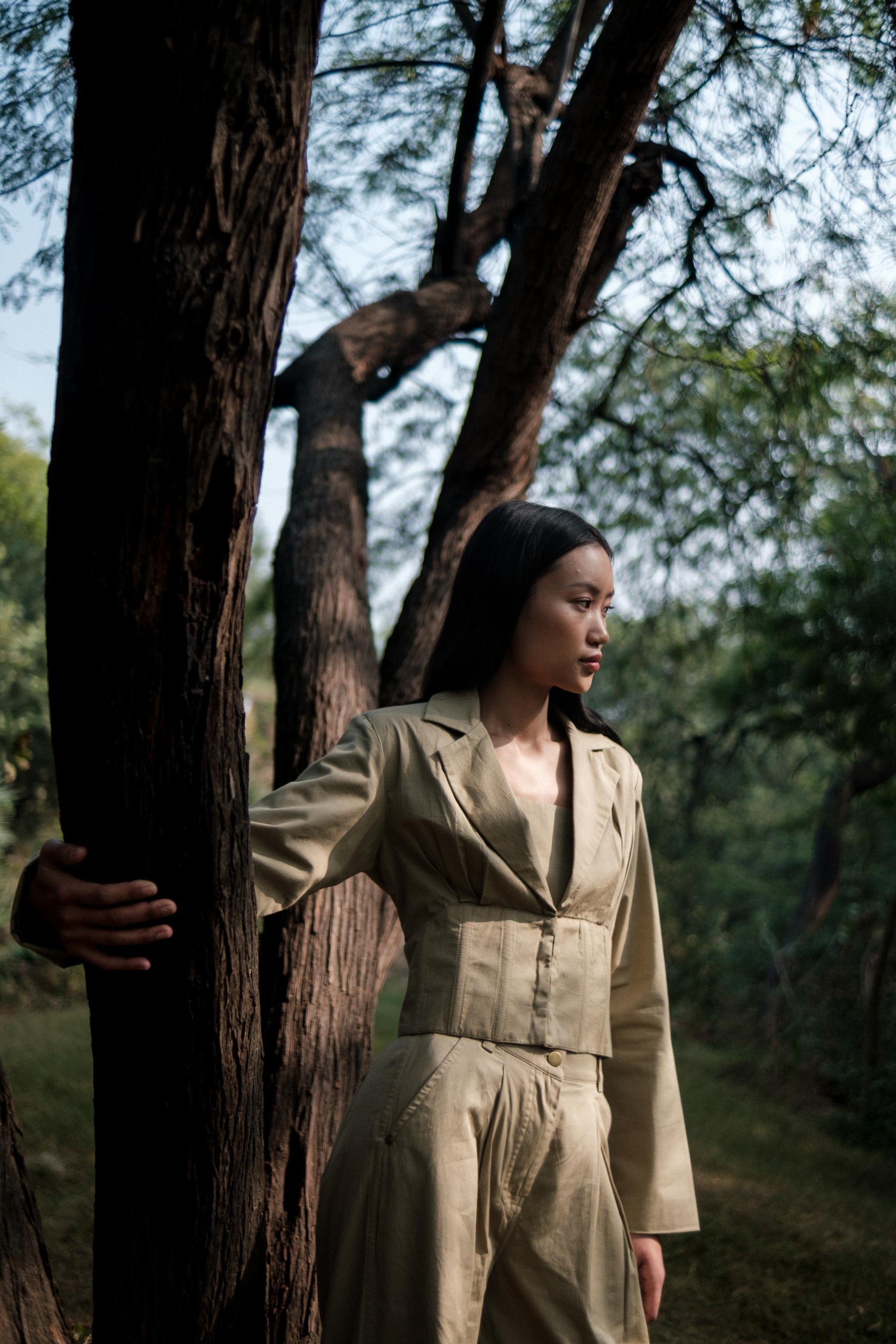 A cropped blazer giving a very sharp and sophisticated look. The corseted cinced waist makes sure you instantly fall in love with it.