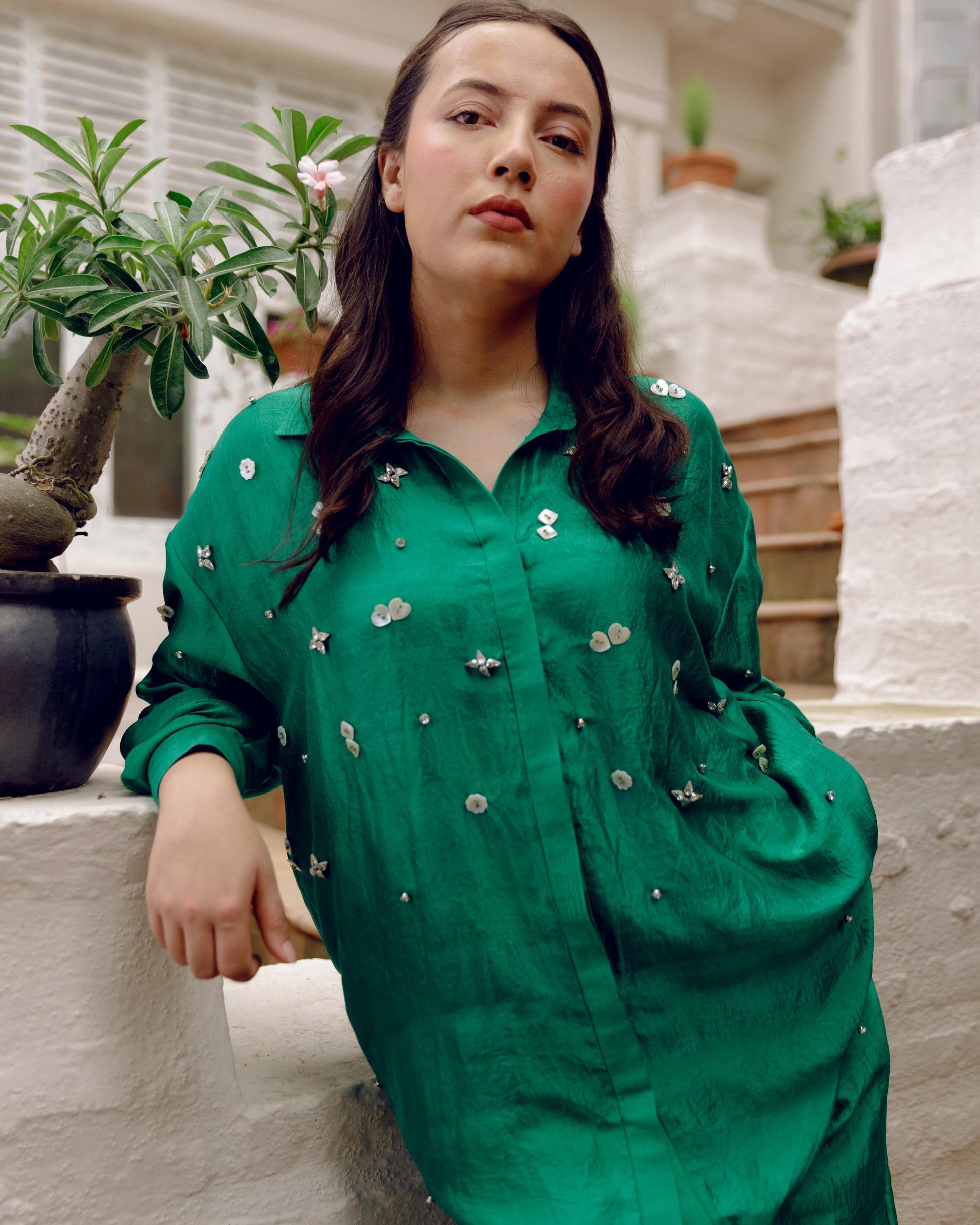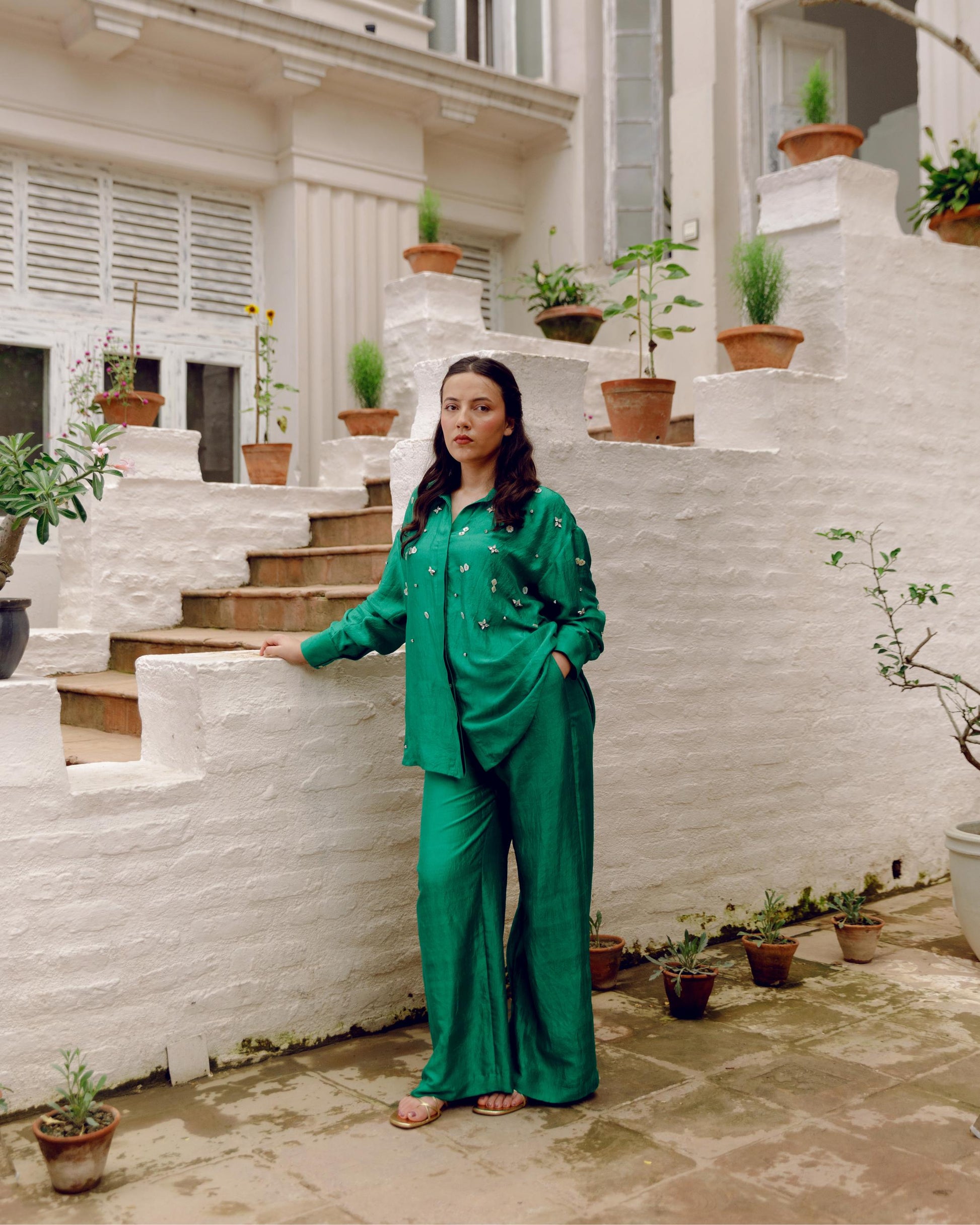 Green handwoven mulberry silk oversized shirt with all over crystal and Mother of Pearl embroidery. Paired with straight comfortable trouser.