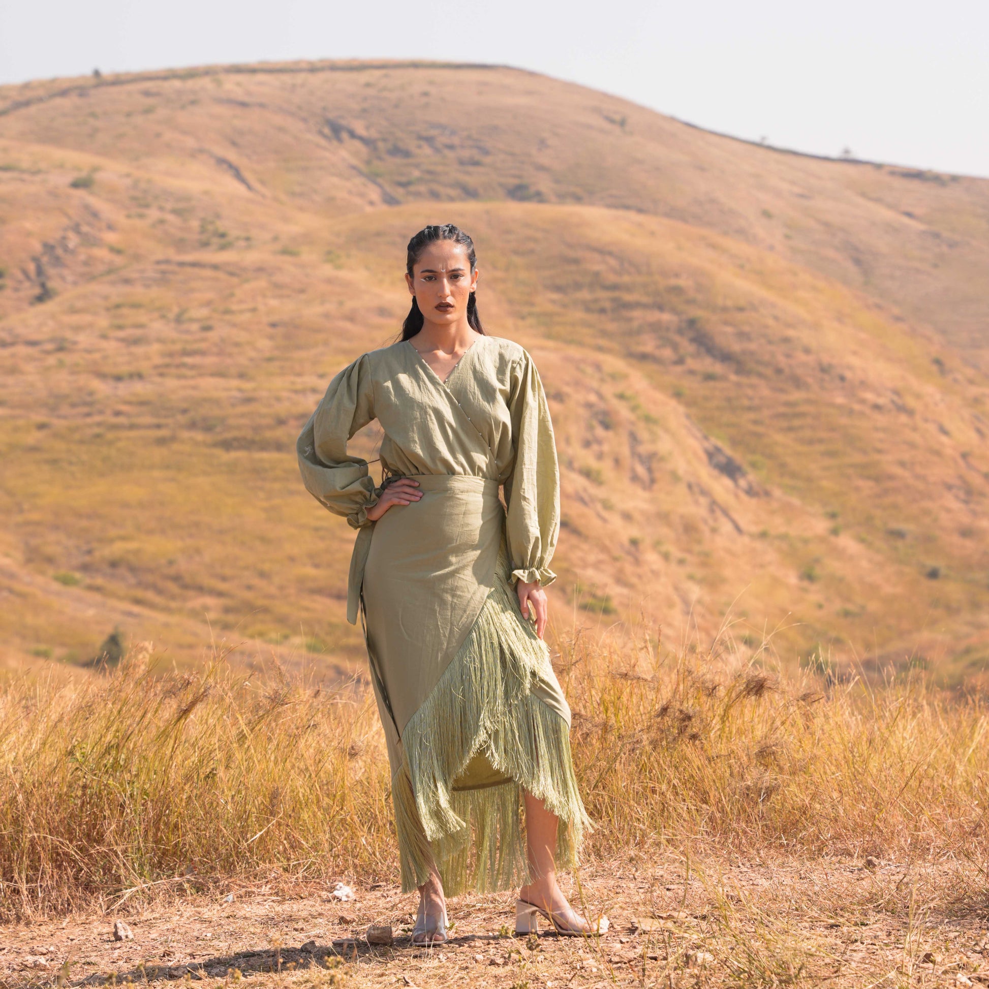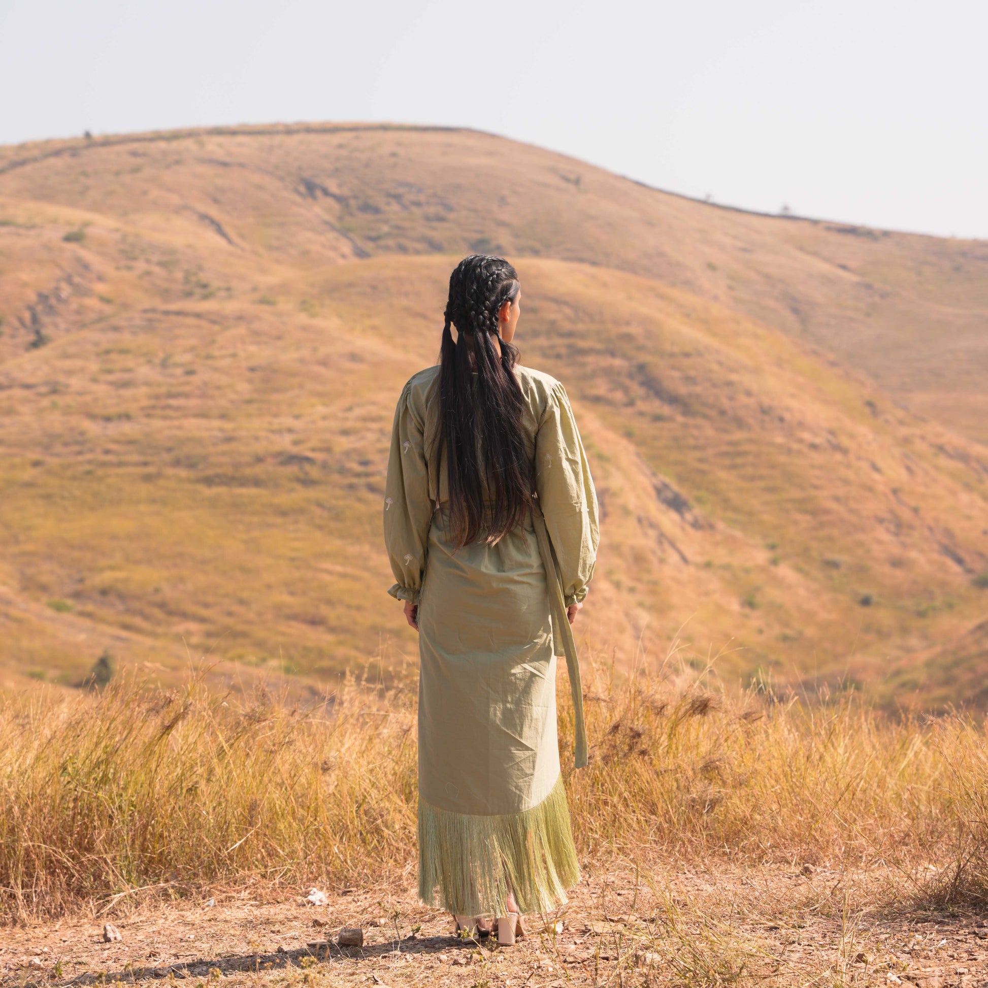 Embrace effortless elegance with our designed to captivate with every detail. Featuring a flattering V neckline adorned with tone-on-tone embroidery, this dress exudes understated sophistication. Organza flower details delicately enhance the neckline, adding a touch of texture and charm. The sleeves are adorned with intricate lace detail, further enhancing its feminine allure.