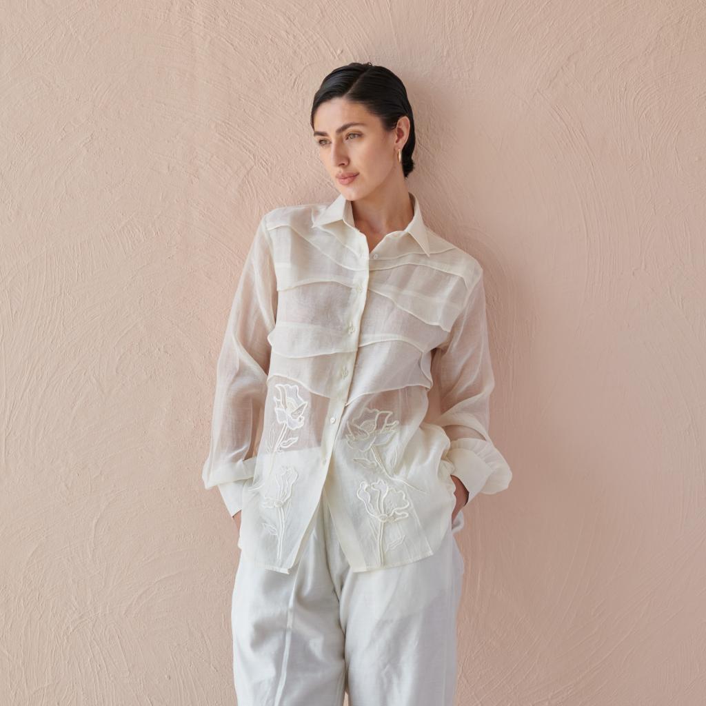 Crafted in airy, semi-sheer Chanderi, this full-sleeved shirt flows with layered waves of fabric that add quiet movement and dimension. Thoughtful thread and bead embroidery bloom across the front, catching the light with every shift.
