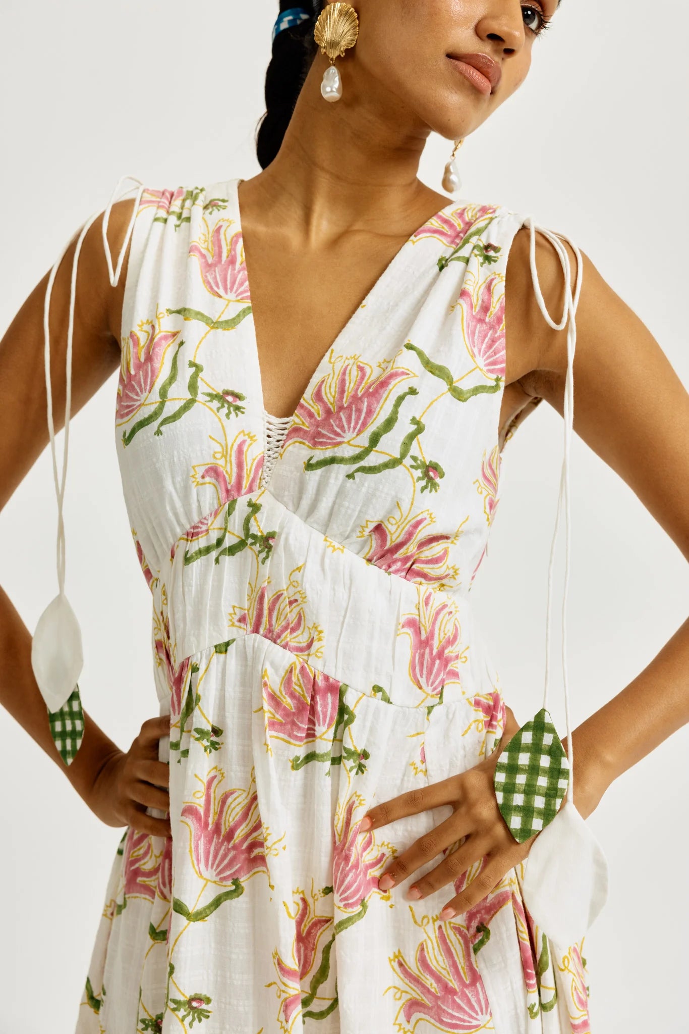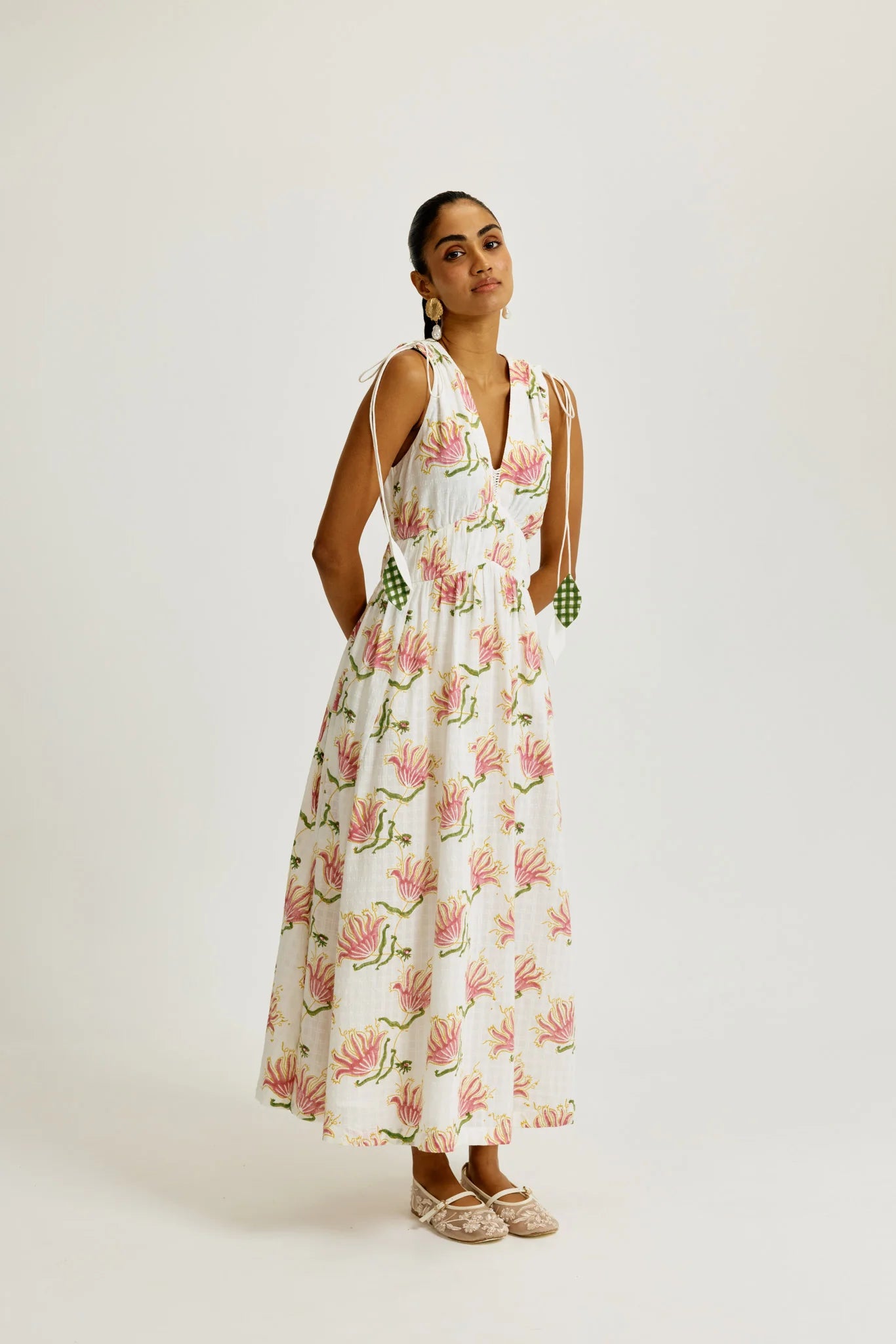 Breezy, playful, and made for sunlit days. This dress showcases our block-printed pink floral motifs, on handwoven cotton. This sleeveless silhouette is detailed with delicate shoulder ties that you can adjust for the perfect fit. The softly gathered empire waist flatters the body, flowing into a full, ankle-grazing skirt.