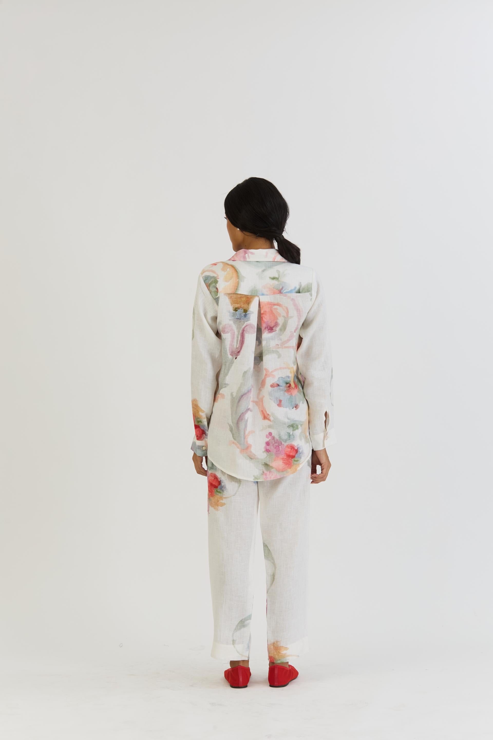 This set is beautifully adorned with a floral basket print on a pristine white base, making it a versatile and elegant addition to any wardrobe.