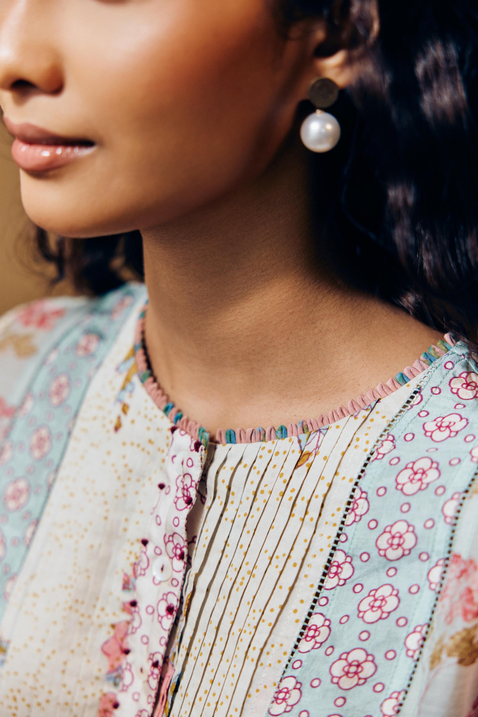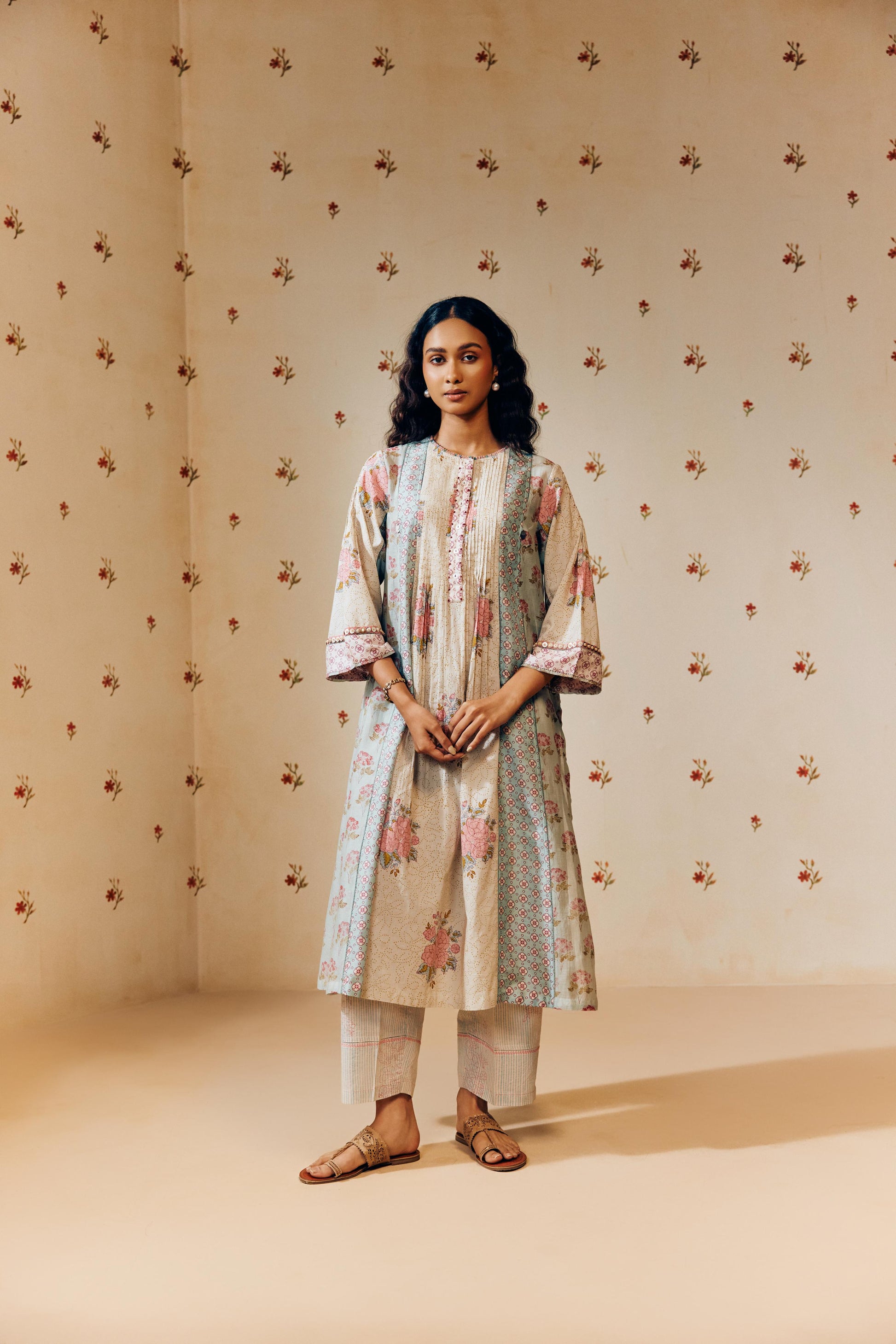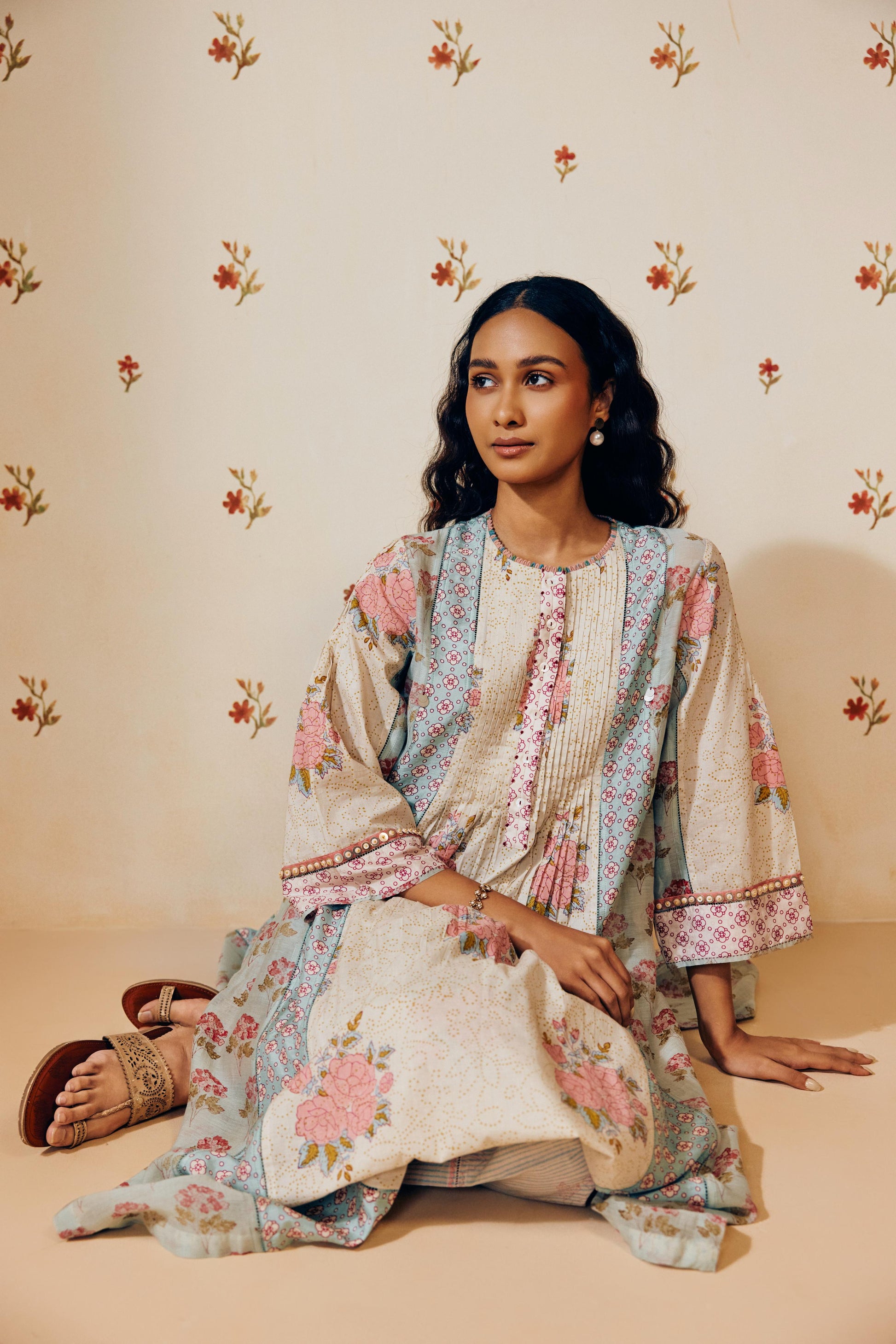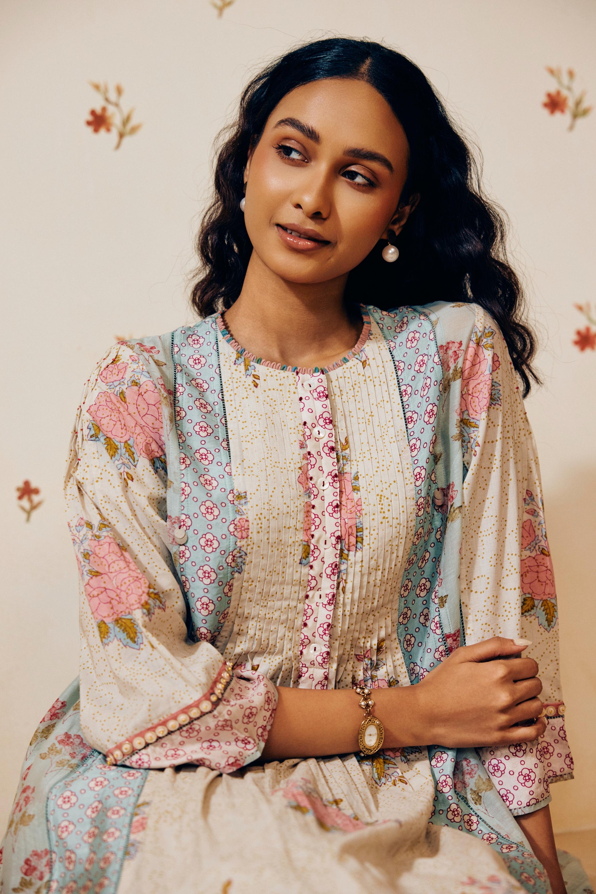The tunic features a unique multi-paneled design, seamlessly blending printed mulberry silk and hand block printed handloom Chanderi, while pintuck detailing on the front and back adds subtle texture and sophistication.