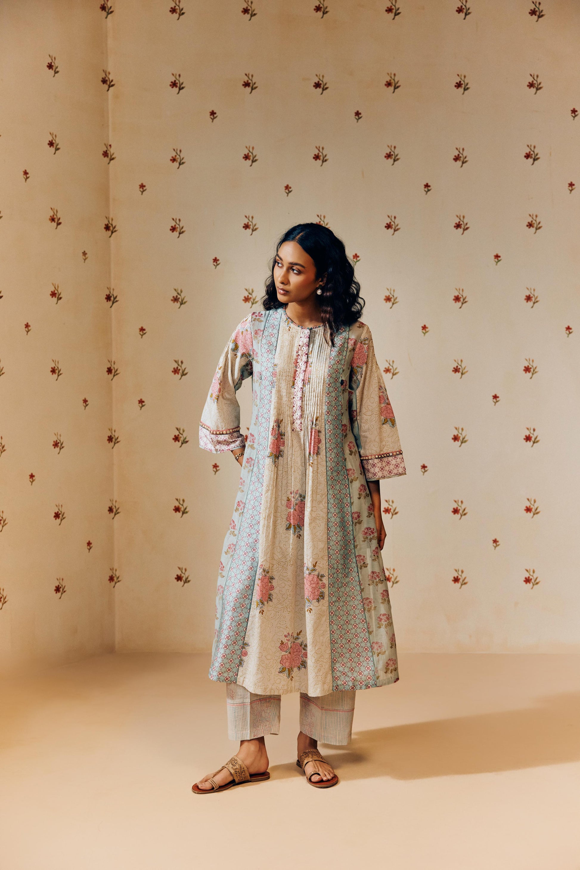 Enhanced with multi-paneled inserts in mulberry silk and block printed Chanderi